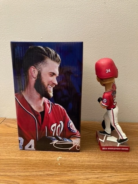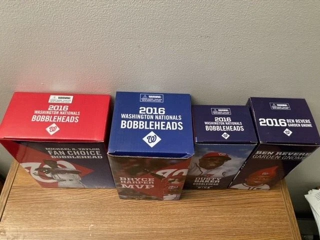 Washington Nationals Bobblehead Set SGA 2016 Taylor Harper Baker Revere Gnome Lot of 4 2016 Washington Nationals SGA's including: * Michael A. Taylor Fan Choice Bobblehead * Bryce Harper MVP Bobblehead * Dusty Baker Bobblehead * Ben Revere Garden Gnome These are brand new SGA's that were removed from their original packaging one time for inspection and photos. The boxes for these SGA's are in excellent condition. These items have been stored in a climate-controlled, smoke-free home since they were obtained in 2016. These items are sold as-is as noted in the attached photos.
