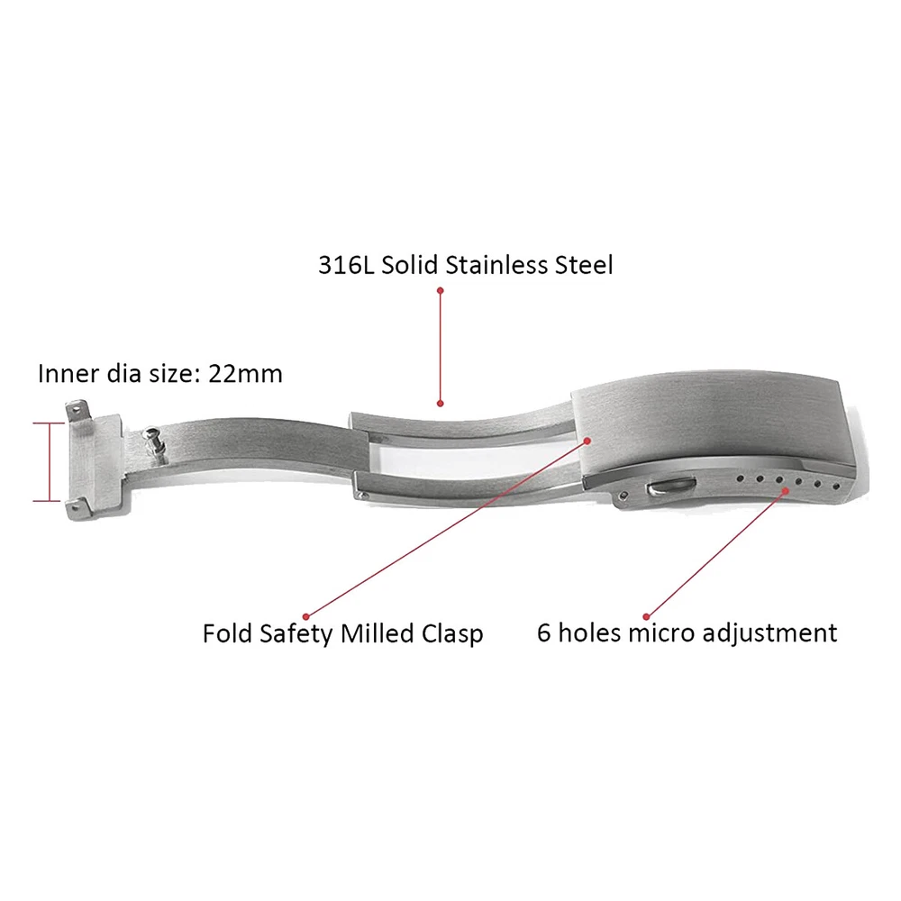 Watch Buckle Fold Milled Clasp Replacement Stainless Steel Watchband4990 Material: This watch clasp replacement is made of stainless steel. suitable for most watch strap. 6 Holes Adjustable: The strap buckle has 6 Mini adjustable holes to enhance bands flexibility, you can use the included tool to adjust the length to fit your wrist circumference. Be Aware: Please measure the width of watchband end linked to the clasp before you purchase. Colour:steel color Material:Stainless steel Size:22mm Package Contents: 1 x Stainless steel watch clasp.