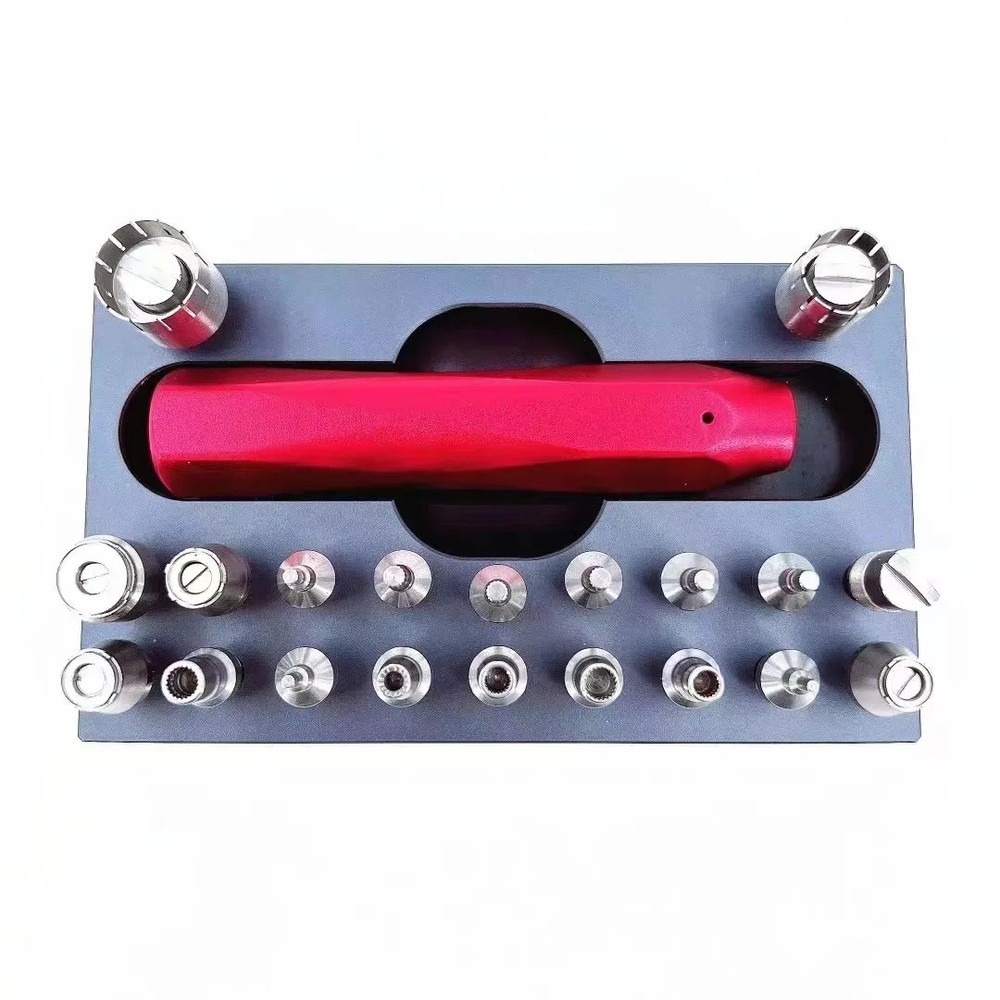✨ Professional Watch Crown & Tube Removing Tool – Stainless Steel Watchmaker Set ✨ This premium Watch Crown & Tube Removing Tool Set is engineered for professional watchmakers and repair technicians. Designed for precision tasks such as crown tube removal, bearing opening, Swatch case back disassembly, and movement servicing. With durable stainless steel construction and 20 interchangeable keys, this tool offers outstanding versatility and reliability. 🔧 Key Features Wide Bearing Compatibility: Opens 2892, 7750, 2000, A10, L888 bearings and Swatch bottom covers. Crown Tube Remover: Suitable for screw-in push rods, pipes, pendulum screws, and battery covers. 20 Interchangeable Keys: Covers various watch models for maximum flexibility. Nonslip Handle & Base: Red ergonomic grip ensures steady, comfortable operation. Stainless Steel Construction: Durable, corrosion-resistant, and built for long-term use. Quick Assembly Cutter Head: Fast swapping of removal heads for efficient workflow. Ideal for Watchmakers: Perfect for assembling/disassembling crown tubes and balancing arbor screws. 📦 Package Includes 1 × Stainless Steel Base 1 × Non-Slip Handle 20 × Interchangeable Keys 📐 Specifications Material High-Grade Stainless Steel Usage Crown Tube Removal, Bearing Opening, Watch Movement Work Compatibility Suitable for multiple watch models and professional repair tasks A must-have tool for every watchmaker’s bench — engineered for precision, durability, and effortless performance.