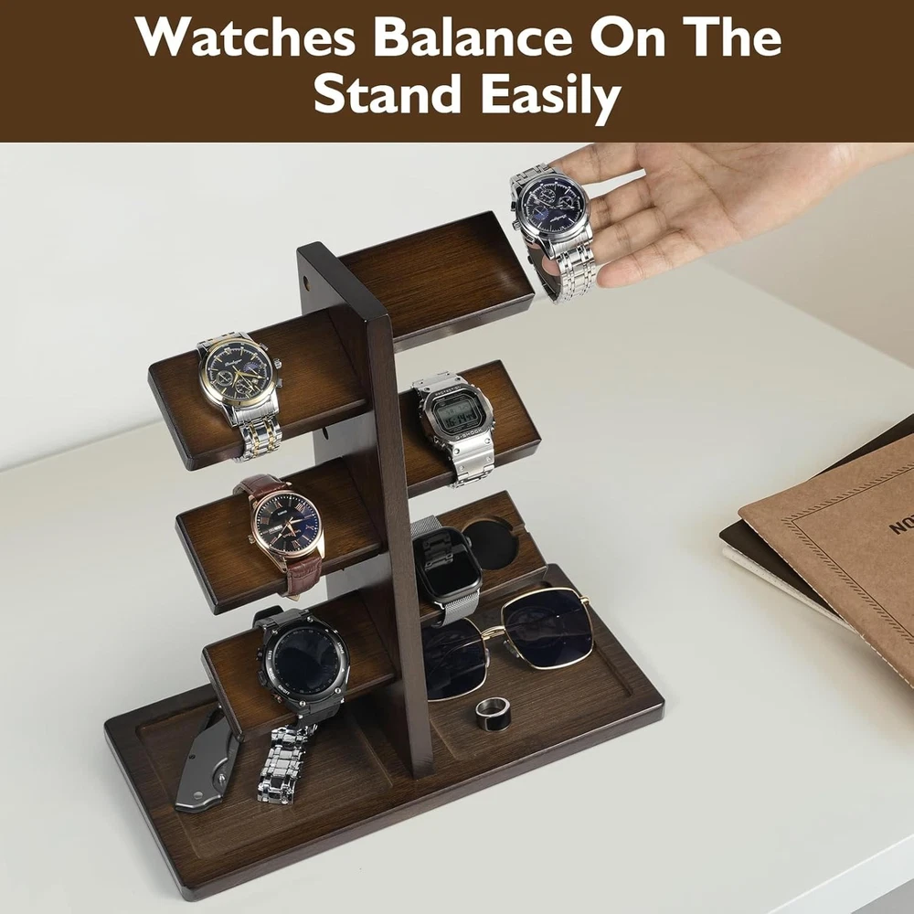 【Multifunctional Watch Holder】The ikkle tower watch stand is perfect for keeping your watches, rings, coins, and bracelets. It can hold up to 12 watches and display well, and the circle magnet can hold your watch charger steadily. 【Bamboo Watches Jewelry Stand】 Made of natural bamboo wood, this watches stand is sturdy and durable. The smooth and finished well bamboo surface will not scratch your watches and jewelry and holds easily. 【Large and Practical】 Designed with 6 supports for a variety of watches, the base stand is large enough to store all kinds of jewels, such as bracelets, rings, necklaces, and glasses. No more mess having all watches around desk and room. 【Elegant Dresser Decoration】With its elegance and simple design, this watch holder fits most home decor well. The brown wood color gives a rustic and elegant style look to your home, and great decor for your bedroom, and living room bathroom. 【Ideal Gift for Men】 This exquisite workmanship jewelry and watch stand is a great gift choice for any time or festival for your father, husband, boyfriend, son, and watch-loving friends on Thanksgiving, Birthday, Valentine's Day, Father's Day, and Christmas.