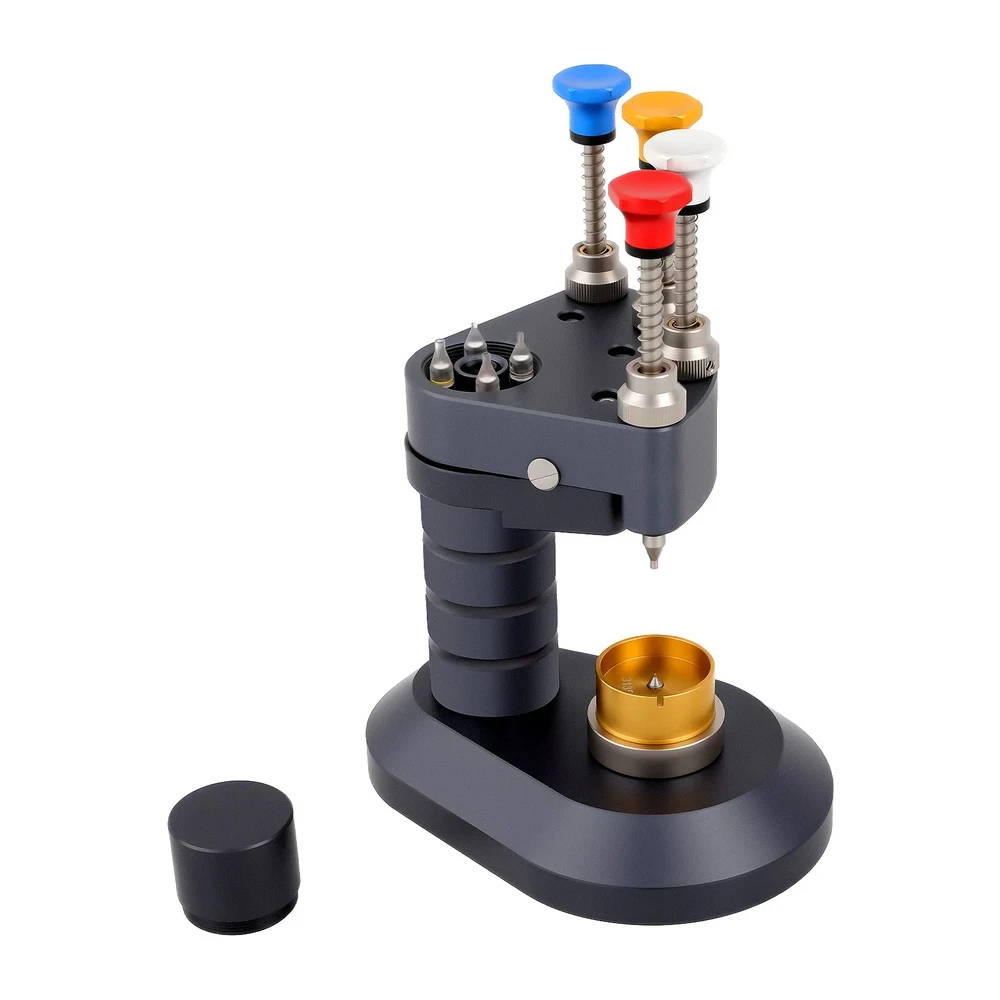 Watch Movement Pinning Machine for Four-Hand Movements Pin Pressing Tool Color: Black Grey Material: Metal, Steel, Acrylic Process: Oxidation, Sanding Style: Modern Mounting Type: Tabletop Mount Assembly Required: No Needle Tips Aperture: 0.6mm/0.024in+1.2mm/0.047in+1.6mm/0.063in+Solid Movement Bases Specification: 2035, 2824/2892, 3135 Number of Steel Needle Tips: 4 Number of Acrylic Needle Tips: 4 Number of Movement Bases: 3 Needle Shaft Length: 10.6cm/4.17in Product Size: 13.5*9.5*18cm/5.31*3.74*7.09in Package Size: 15*15*25cm /5.91*5.91*9.84in Gross Weight: 1.98 kg /4.37lbs Net Weight: 1.4kg/3.09lbs