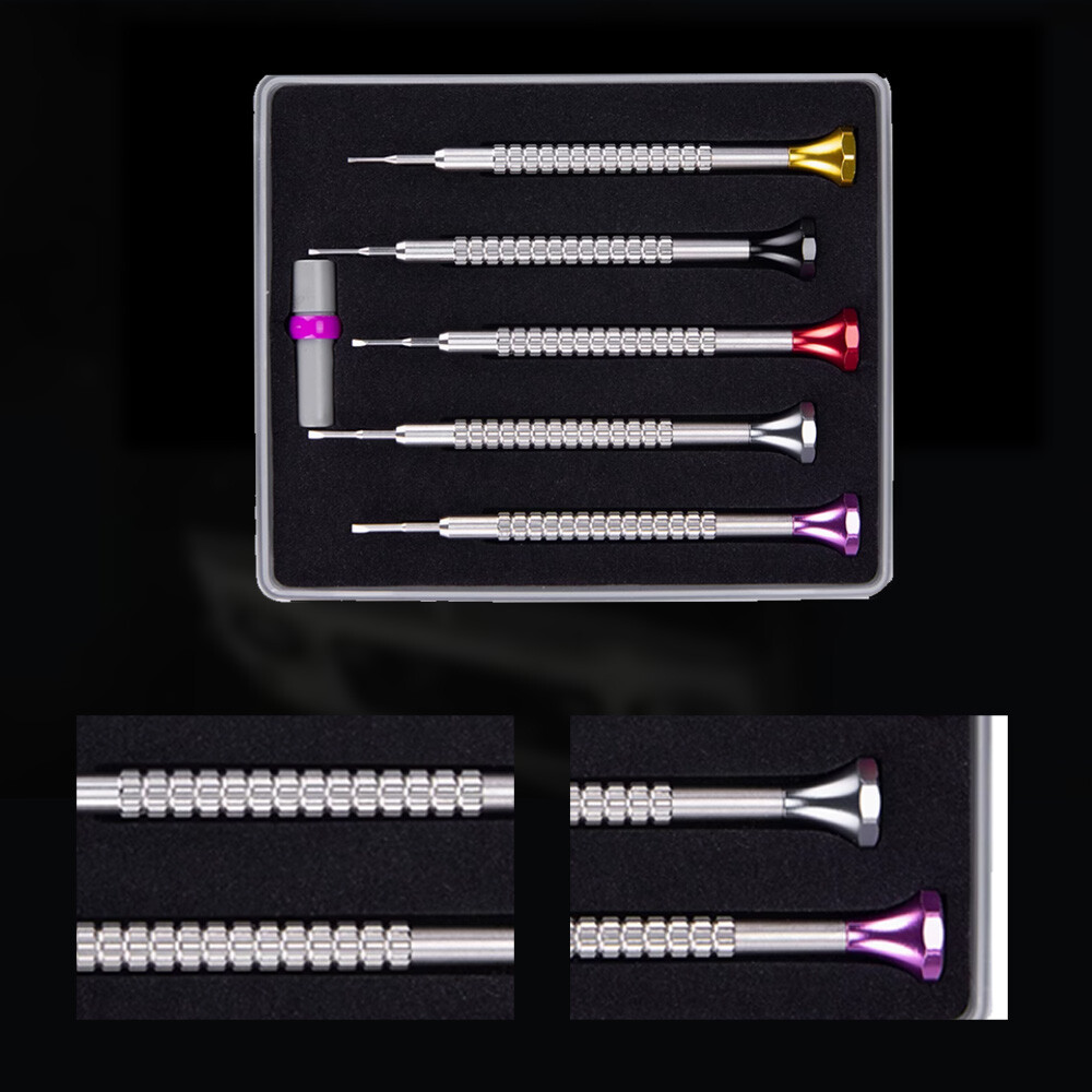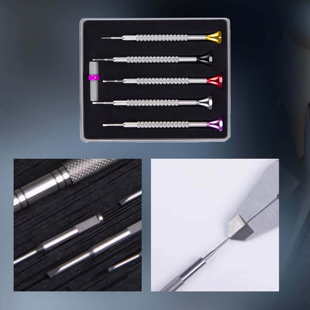 If you're using cheap tools, you can spoil your watches. This is a fine set of professional ergonomic screwdrivers. This set comes with Stainless Steel screwdrivers. The manufacturer produced each screwdriver with a familiar octagonal plastic head using self-lubricating POM material. They made the conical blades with hardened stainless steel. They obviously styled the set to resemble a familiar one with a similar model number from Switzerland. Sizes include 0.8 / 1.0 / 1.2 / 1.4 / 1.6 or the most widely used sizes. If you have any questions about these tools, please write.
