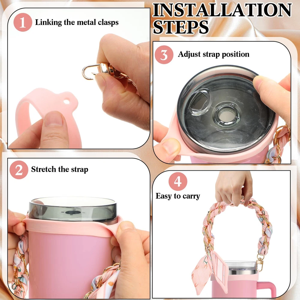 Features: Our water bottle lanyard is designed for water bottles and handle them securely in place to prevent them from accidentally slipping, making a nice addition for outdoors. Our bottle handle strap makes an ideal gifts for boyfriend or girlfriend, son, husband, wife, friend, coworker on birthday, Christmas, Thanksgiving, Easter, graduation season, wedding, Mother's Day and much more. Specifications: Material: Handle: silicone Scarves metal strap: scarves and metal Color: Handle: pink Polyester metal strap: striped pink Size: Handle: about 2.56 x 2.56 inches/ 6.5 x 6.5 cm, fit cups about 8-40 oz Polyester metal strap: about 12 inches in length Package includes: 1 x Water bottle handle with strap Notes: Manual measurement, please allow slight errors on size. The color may exist a slight difference due to different screen displays. Easy to Carry: the silicone water bottle handle makes carrying water bottles easy; Simply slip on the water bottle holder, and attach the cute and delicate pearl metal strap; Ideally sized about 2.56 x 2.56 inches/ 6.5 x 6.5 cm, it fit most 8-40 ounce water bottles, our water bottle handle is well compatible with Stanley Cup Quality Material: our water bottle handle with strap is compatible with Stanley Cup, and made of quality and reliable materials; The holder crafted from safe silicone material, which is not easy to break, serving you for long term; Our water bottle holder with strap is versatile and can be carried in your hand, or hang on bags, backpacks, strollers, chairs, wheelchairs, bikes, and more Water Bottle Handle for Beauty Compatible with Stanley Cup: the quality ABS pearl metal chain of our water bottle sling comes with a lovely shell pendant; The pearl metal chain is measuring about 12 inches in length; The pearl metal chain adds a pretty touch to your bottle, giving an exquisite appearance; The pearl metal chain isn't just a pretty addition, detach and use it as a stylish keychain or a bag accessory Buckle Handle: the strap of our water bottle carrier handle can be removed; You can use it with or without the buckle handle; You can untie the strap and secure the holder with other items according to your needs; Impart style and convenience with the handle compatible with Stanley Cup, it's an ideal present for the modern individual Wide Application: this cup handle with strap is versatile, you can hold it in your hand or attach it to items such as backpacks, wheelchairs, chairs, bikes, etc.; It is a practical accessory, ideal for walking, hiking, camping, sports and other outdoor activities; This water bottle holder compatible with Stanley Cup gives you a more convenient experience; Please confirm the size before purchase