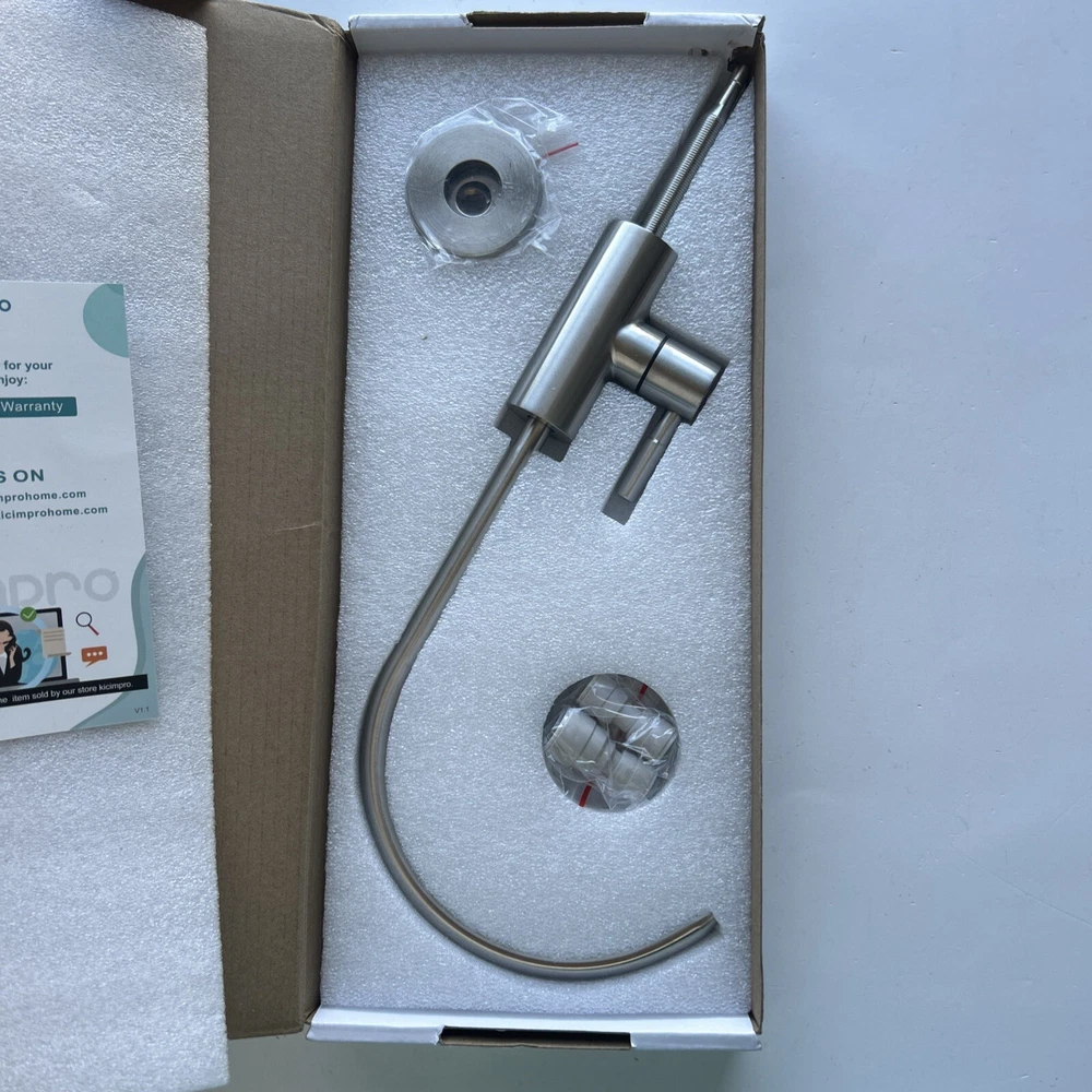 Open box New item! No Splashing: The slender water outlet design and reasonable camber for the water filter faucet make the water in the center, and the water is soft and centralized without splashing, meeting the daily water needs of the family. Healthy Drinking: Healthy materials for reverse osmosis faucet is selected to ensure the safety. The whole process of water passage keeps your water clean all the way from the filter to the spout of drinking water faucet for kitchen sink. Drink healthy water and stay away from inferior sink filter water faucet to enjoy your healthy life. No Leakage: Drinking water faucet high-grade cartridge with excellent sealing, tested before leaving the factory to ensure no leakage and no dripping. Exceed industry longevity standards to assure smooth handle operation. Healthy Materials: RO faucet made by SUS304 stainless steel that is lead-free and never get rust. The all-metal body is for maximum durability. The sink water filter faucet is made of food grade SUS304 stainless steel material. It is the best choice for family health especially kids. Standard Size: Kicimpro filtered water faucet, fitting 0.59 inch to 1.37 inch kitchen sink holes, can be used with RO water purifier, sink water filtration, kitchen, RV to meet different needs. Provide 2 kinds of quick connectors (1/4" and 3/8") to meet your various installation needs. You can also reach out to us for special needs(extra adapters or bigger deck plate).