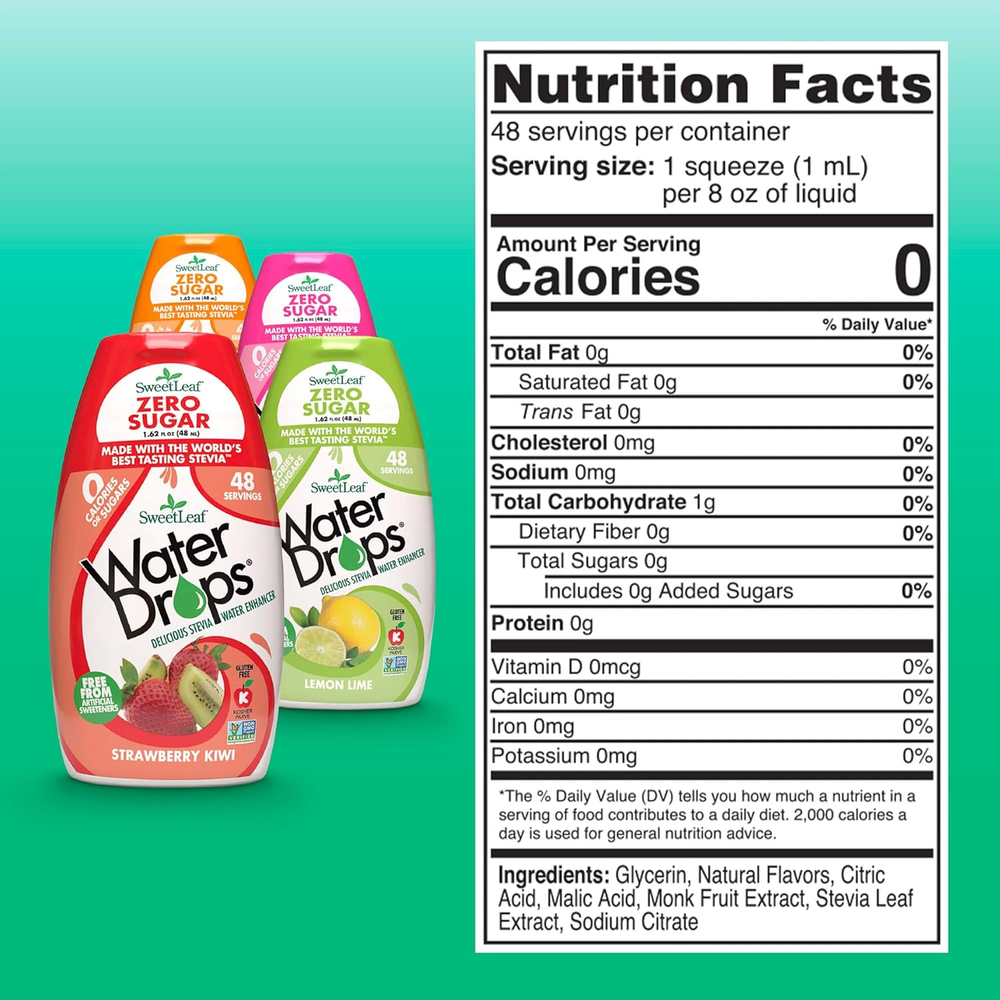 Store New Arrivals Add to Favorite View Feedback Water Flavoring Drops - Stevia Water Enhancer, Sugar Free, Zero Calorie Water Additive for Flavor, Contains Monk Fruit Extract, Gluten Free, Keto Friendly - 1.62 Fl Oz (Variety Pack of 4) Description Is Discontinued By Manufacturer No Product Dimensions 4.5 x 2 x 4.5 inches; 1.62 ounces Item Weight 1.62 Ounces Special Ingredients Natural Flavor Units 6.48 Fluid Ounces Package Information Bottle Item Form Drop LIQUID WATER ENHANCER DROPS: SweetLeaf Water Drops deliver satisfying sweetness without added sugars. Enjoy the taste you love with zero calories, perfect for enhancing your favorite recipes ALL YOUR FAVORITE FLAVORS: Transform plain water with raspberry lemonade, lemon lime, strawberry kiwi, or peach mango. We use stevia leaf and monk fruit extract to brighten your cup full of flavor CONVENIENT FOR ON THE GO: With its compact 1.62 oz squeezable bottle, our water flavoring drops are easy to carry, so you can enjoy zero-calorie sweetness anytime, anywhere NO ADDED SUGAR: Enhance your favorite drink mixes by replacing sugar, not the taste. SweetLeaf's water flavoring drops are sweetened by nature with no sugars, calories, or artificial ingredients PERFECT FOR EVERY LIFESTYLE: Our delicious stevia water enhancer is keto friendly with zero calories or carbs. Enjoy naturally sweet flavor with no artificial ingredients or aftertaste Product description ABOUT US We offer the best prices around on high quality products. Our E-store includes media such as books, movies, music and games while offering electronics, toys, sporting apparel, clothing, tools, general home, garden items and more. SHIPPING We are always working hard to ensure your package arrives as soon as possible. Please understand that some factors like weather, high postal traffic, and the performance of shipping companies are outside of our control. We offer free shipping to the lower 48 states and ship within 2 business days of payment, usually sooner. We do not accept P.O. Boxes. Please provide a physical address. RETURNS We offer a 30-Day Return Policy on items which you are not completely satisfied with. You have the option for a full-refund or an exchange of the item. No returns are available on items shipped outside of the USA. PAYMENT We accept PayPal. CONTACT US This page content is yet to come Please ad us to your favorite seller and visit again later Thank You