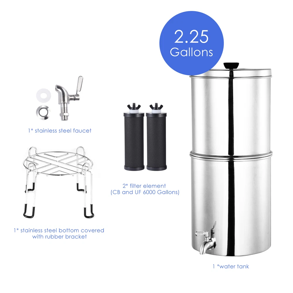 Store category Sign Up Now ! You may also like Product Description Bullet Points: Quality Water Ensured: Secure Healthier Water. Our gravity-fed water filtering system ensures clean, well-maintained water with a 2.25-gallon capacity that's perfect for families of four, providing a constant supply of purified water and eliminating impurities, ideal for health-concentrate individuals. Efficient Filtration: Experience cleaner, better-tasting water as this system removes over 99% of chlorine, along with heavy metals, sand, rust, and odors, ensuring your water is safe and pure. High-class Materials: Crafted with food-grade stainless steel housing, our Water Filter System ensures long-term use with a sturdy structure that's lead-free and rust-free—dependable, not easy to deform or damage. Easily Portable: Featuring a built-in chamber holder, our water filter system is a convenient solution for anyone who's often on the move. You can use it indoors or outdoors without any need for electricity. Eco-Friendly Hydration: By filtering up to 6,000 gallons of water and offering replaceable filters, our Water Filter System reduces waste and spares you the cost of buying 45,000 bottled waters: making it the perfect choice for the environmentally responsible. The Water Filter System is perfect for a family of four. Made with high-quality material, it doesn't cause harm to human health. The convenient chamber holder makes it easy to use, and replaceable filters ensure long-term use. Protect your family with this must-have addition to your household. Specifications: Material: Stainless steel Capacity: 2.25 Gallons Packing List: 1* water tank 2* filter element (CB and UF 6000 Gallons) 1* stainless steel faucet 1* stainless steel bottom covered with rubber bracket Payment Delivery details Terms of sales About us Feedback & DSRs Payment Before you palce an order, please kindly make sure that you have a paypal account. We accept PAYPAL payment only. Payment should be completed within 2 days after auction closed, or unpaid dispute will be filed for an closing auction. An unpaid case will be filled after 4 days. Delivery details We ship to your eBay address. Each package will be shipped to US by UPS Regular Parcel with tracking number. Please check your shipping address carefully before checkout, it can't be changed if order completed. All items will be shipped within 1-2 business day upon receipt of payment.Orders placed on weekend will be shipped within 3 days. If you do not receive your item in 7-10 business days.please contact us immediately for further assistance. We will be responsible for any damages or losses incurred in the shipping process. About us We maintain high standards of excellence FIVE STAR and strive for 100% customer satisfaction! Positive Feedback is very important to us. We hope that you contact us immediately Before you give us neutral or negative feedback, so that we can satisfactorily address your concerns. We promise to offer the lowest price and high quality produce. Our working time: From Monday to Friday(9:30 am to 18:00pm), we don't working on holidays ,hope you can understand and know that , thank you. Please always talk to us via ebay Message. We appreciate your business and look forward to growing our e-Bay sales with satisfied customers. Feedback Contact us If you have any questions, please feel free to contact with us by ebay Message during our business hours ( 9:30a.m. to 5:30 p.m.), or email us through eBay, we will try our best to help you to resolve it. For any presale or after-sale questions,please do feel free to email us! Due to the time difference, each email will be replied within 1 working day,and weekend will be delayed a bit. Feedback