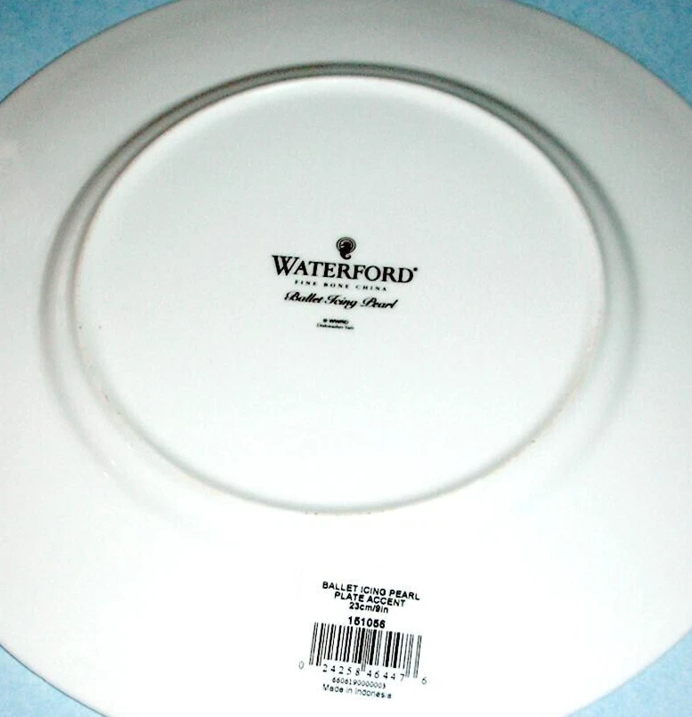 Backstamp: Printed Number of Items in Set: 1 PC. Plate Diameter: 9 inch Type: Accent Plate Seller Notes: “Unused accent plate with a small chipped edge (on platinum band), See details.” gtin13: 024258464476 Color: White, Platinum Era: 21st Century (2000-now) Product Line: Ballet Icing Pearl Shape: Round Antique: No Set Includes: Single Accent/Luncheon Plate Pattern: White-on-white light raised line design Production Technique: Pottery Original/Licensed Reproduction: Original Vintage: No Finish: Glossy Brand: Waterford Department: Adults Handmade: No Occasion: All Occasions Features: Dishwasher Safe, Platinum Trim Material: Bone China Country/Region of Manufacture: Indonesia MPN: 151056 Care Instructions: Dishwasher Safe UPC: 024258464476