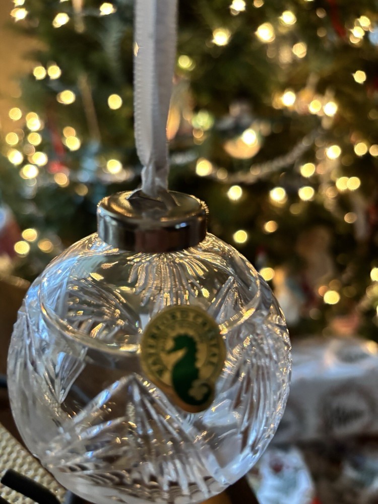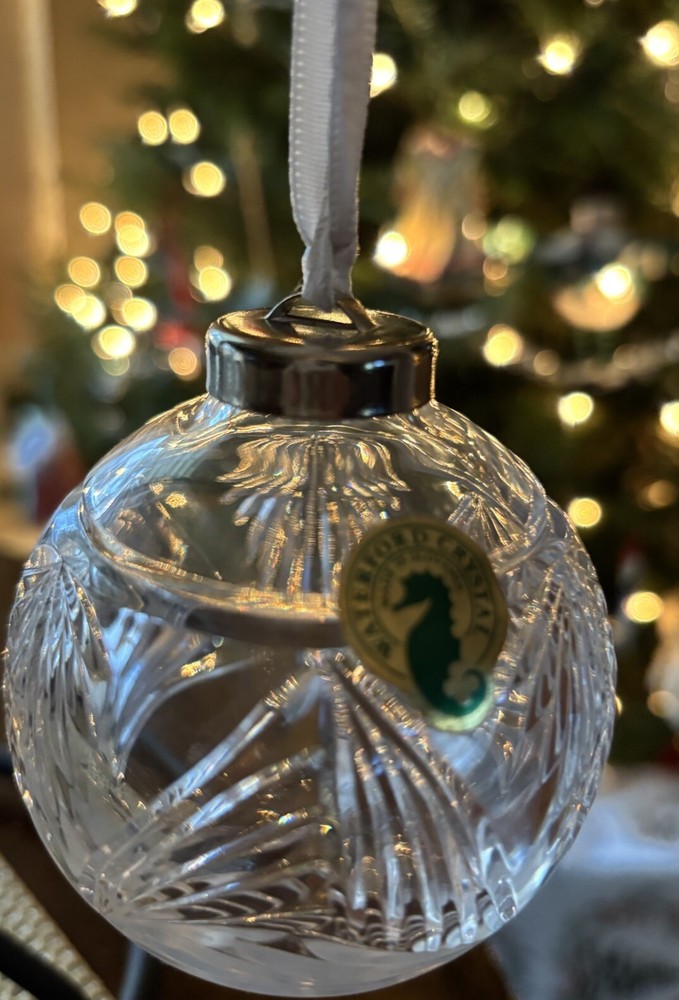 Waterford Crystal 2004 Times Square ornament. The clear glass ornament measures approximately 3” in diameter. It has the Waterford sticker, the Waterford mark on the glass, as well as the Times Square 2004 mark. The white ribbon hanger reads “Waterford Times Square” in silver color lettering. Preowned. Like new condition.