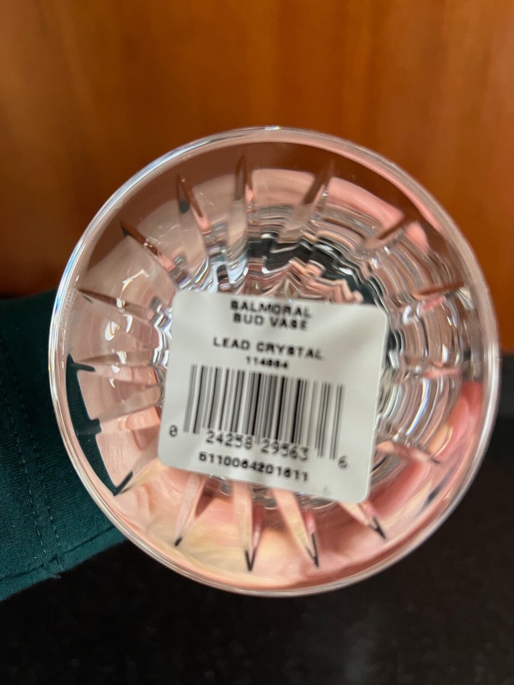 This is a Waterford Crystal Balmoral Bud Vase from Ireland (NEW), featuring a contemporary style with a beautiful cut crystal design. It measures 9" in height and 3" in width and comes in its original packaging box. The Waterford marking is on the bottom of the vase. Please keep in mind that many of the new Waterford crystal pieces are made outside of Ireland. This beautiful vase would make a nice house warming, bridal shower or wedding gift, or just for that special person. Stored in a smoke free environment. Sales are final no returns accepted.