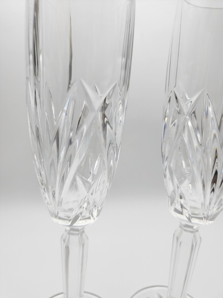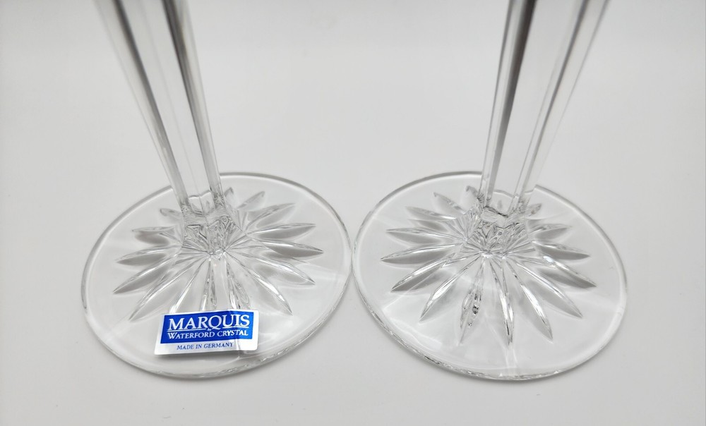 2 Marquis By Waterford Crystal Brookside pattern 9" champagne flutes, in excellent condition. One has original sticker. The odd thing about these two is that there appears not to be a Waterford mark anywhere. I got them in a lot with other Brookside pieces (see my other listings!) But these 2 are the only ones I've seen without any marks that I can find. They show little to no signs of use, no chips or cracks. As always, don't hesitate to message me with questions.