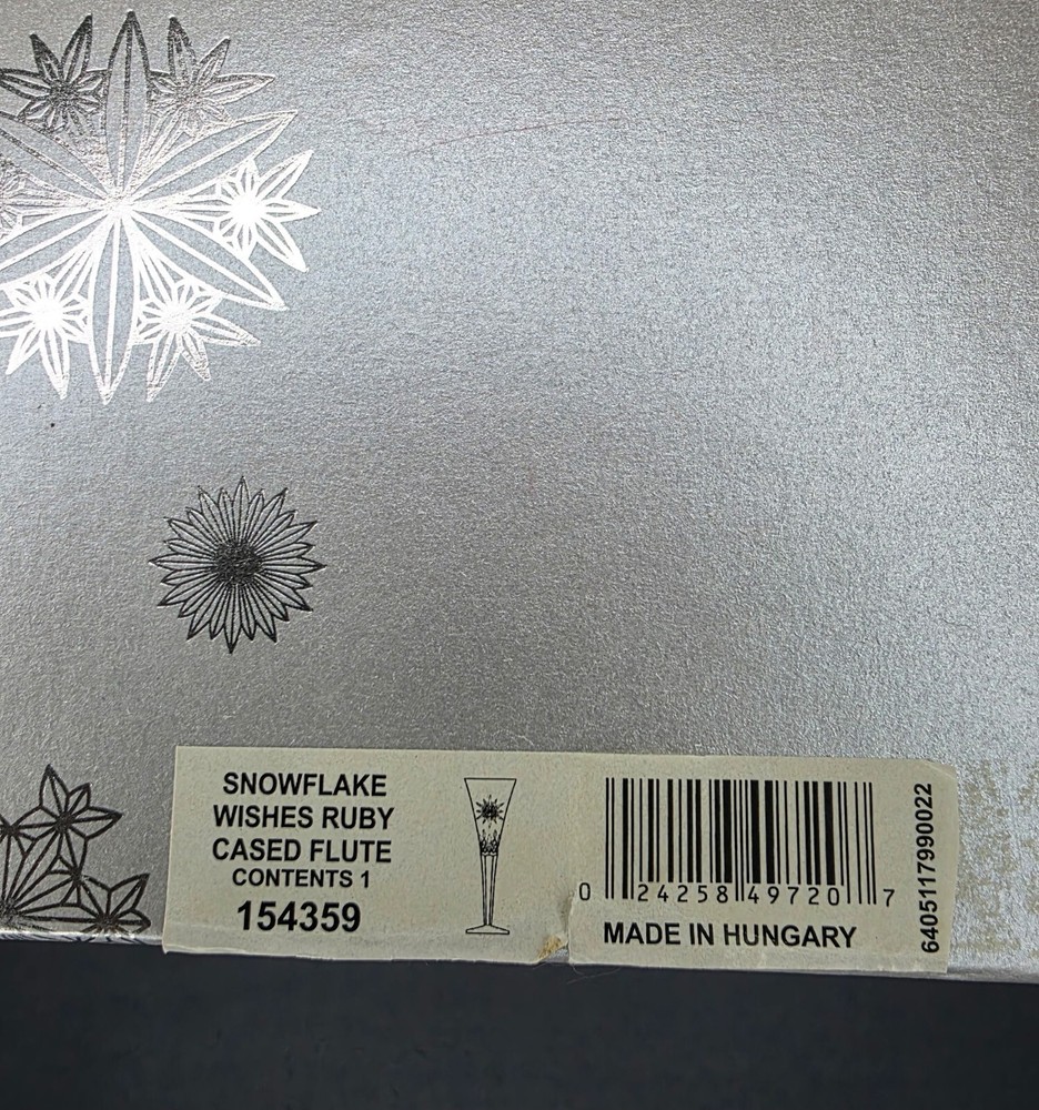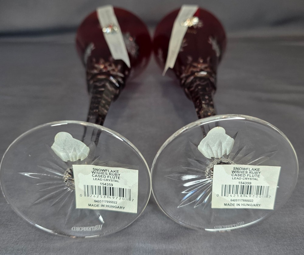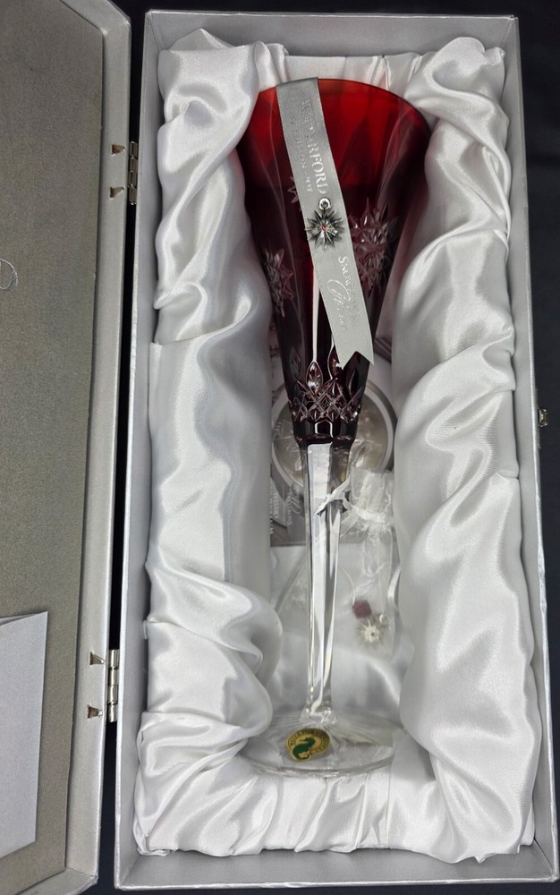 The Waterford Crystal Snowflake Wishes "Joy" Ruby Cased Flute (SET of 2) is a limited edition champagne flute made of crystal, featuring a beautiful ruby color and a theme of joy. This round-shaped flute is perfect for all occasions and comes in its original packaging from 2011. The Waterford brand ensures high quality and elegance, making it a luxurious addition to any drinkware collection.
