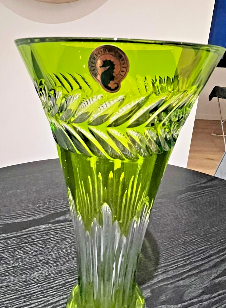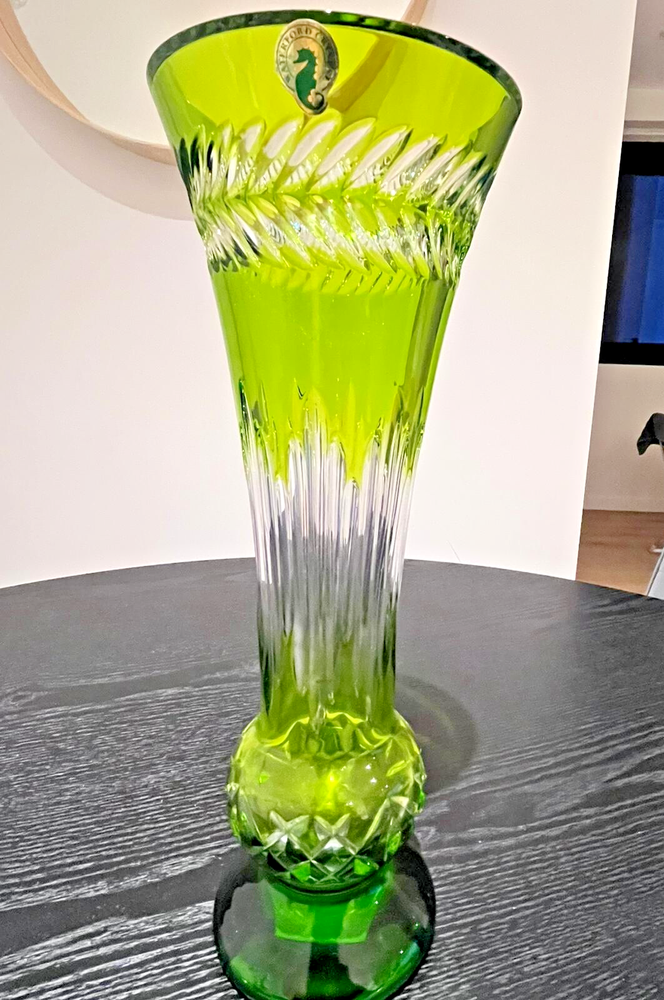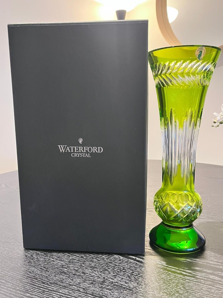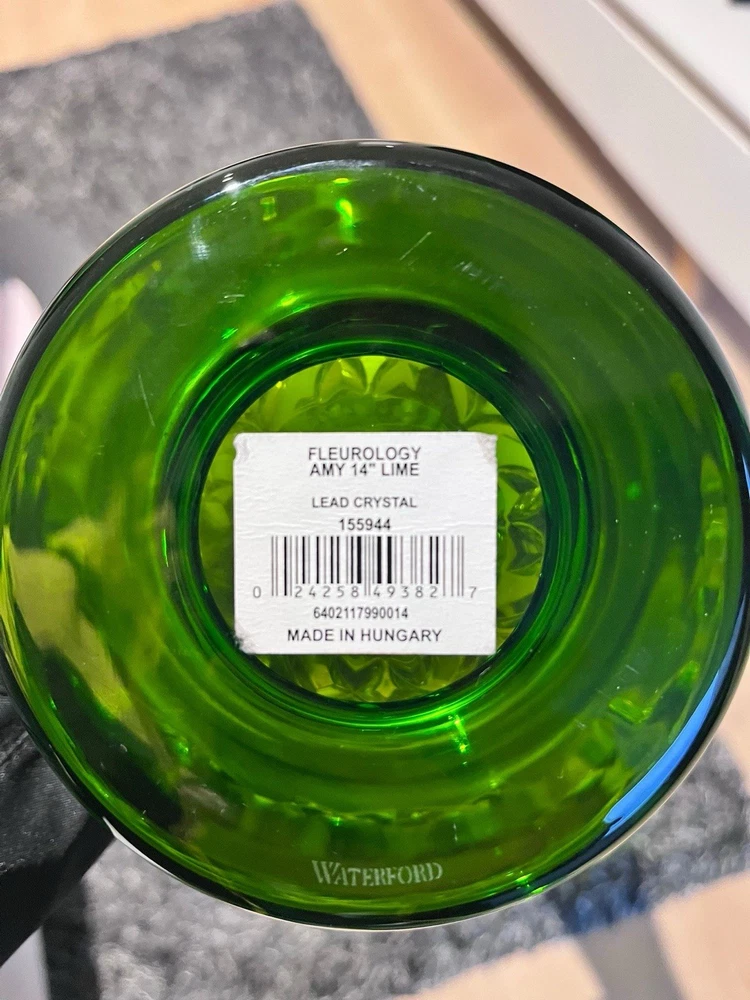 Waterford Fleurology Amy Light Green Vase – 13.8″ (Rarely Used, w/ Original Box) Item Overview Elevate your décor with this stunning Waterford Fleurology Amy Light Green Vase —a rare find standing 13.8 inches tall. This classic trumpet-style crystal vase features Waterford’s signature Fleurology pattern, hand-cut for maximum brilliance and light refraction. It has been rarely used and remains in pristine condition , complete with its original Waterford presentation box . Key Features Brand: Waterford Crystal Series: Fleurology – “Amy” Pattern Color: Light Green (Amy shade) Height: 13.8 inches (35.1 cm) Material: Premium Lead Crystal Condition: Excellent – Rarely Used , no chips, cracks, or scratches Includes: Original Waterford presentation box and protective packaging Origin: Made in Hungary Detailed Description The Waterford Fleurology Amy Light Green Vase is part of Waterford’s celebrated Fleurology collection, known for its botanical-inspired, hand-cut floral and leaf designs. The “Amy” pattern is particularly admired for its delicate interplay of radiating cuts and diamond facets that catch and refract light, creating a vivid sparkle in any setting. This vase stands a generous 13.8 inches tall , making it ideal for showcasing long-stemmed roses, lilies, or orchids. The light green hue provides a subtle, fresh-spring accent—perfect for both traditional and contemporary décor schemes. Because it has been rarely used , you’ll notice the crystal’s clarity is impeccable, with no visible blemishes. Condition & Provenance Condition: Flawless crystal: No chips, cracks, or cloudiness Lightly displayed in a curio cabinet (smoke-free, pet-free home) Hand-wash only (never run through a dishwasher) Provenance: Purchased new from an authorized Waterford retailer. Never passed through multiple owners—owned by the original purchaser and expertly cared for. Measurements Dimension Measurement Height (rim to foot) 13.8 inches (35.1 cm) Maximum Diameter (rim) 5.5 inches (14.0 cm) Base Diameter 5.0 inches (12.7 cm) Weight (empty) Approximately 6.2 lbs (2.8 kg) What’s Included Waterford Fleurology Amy Light Green Vase, 13.8″ Original Waterford branded gift/retail box (with foam inserts and protective wrap)