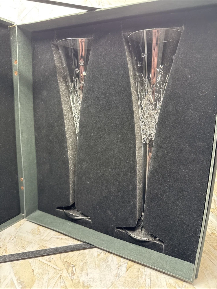 Glasses are used but only time and in amazing condition. Box has signs of wear but nothing is missing. Includes both the glass care, and collection sheets. Listing includes both flutes. Refer to photos. Prompt shipping