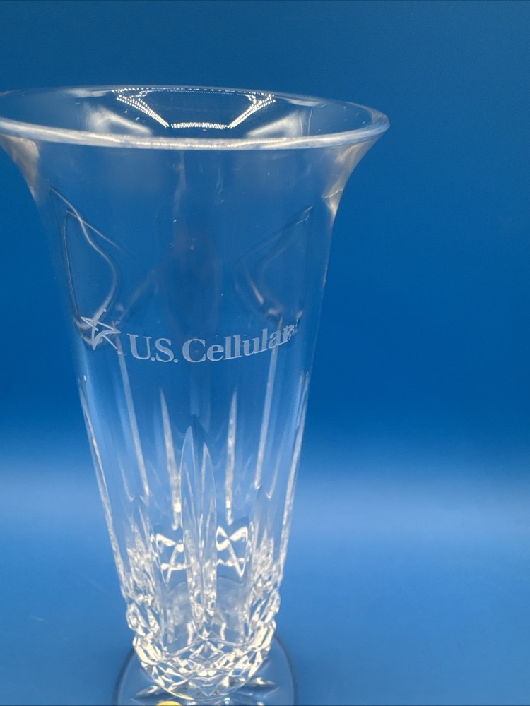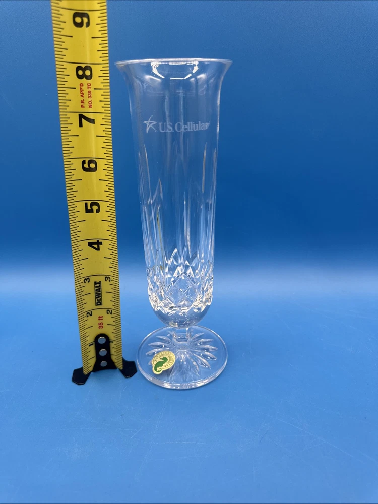 This is a Waterford Crystal Lismore vase with a footed stem, marked with the Waterford logo and measuring 8 inches in length. It comes with its original label intact. The vase features intricate crystal designs, making it a collectible decorative piece. Pre-owned excellent condition. No cracks or damages. No original box. Has engraving. Please check the pictures carefully as part of the description. Feel free to ask questions if you need more information before you buy it. Thank you for your interest C-11