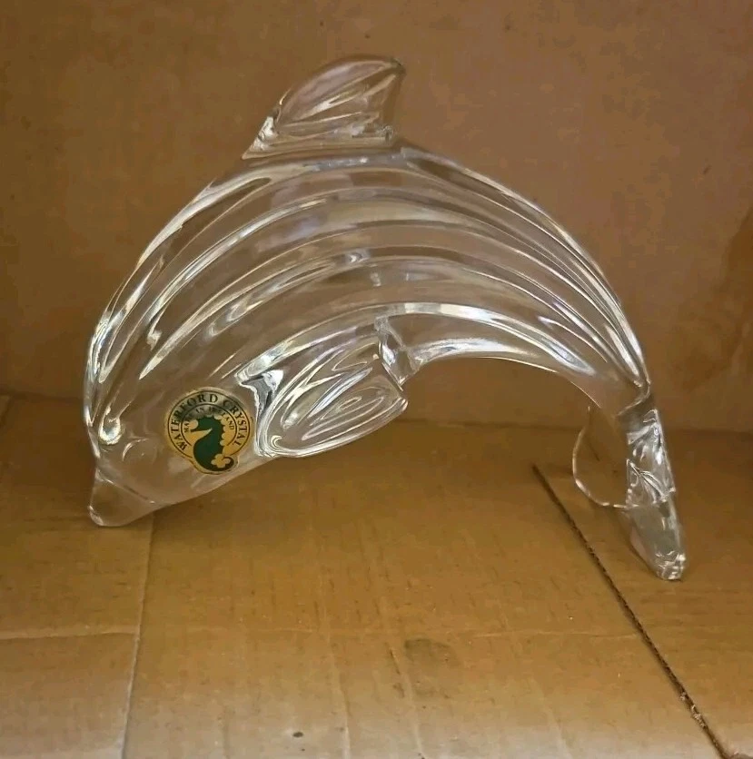 This is a 5 ¼" leaping dolphin, solid crystal. Made in Ireland. It has no visible marks on it. Very clear and shiny. Does have a Waterford sticker on it.