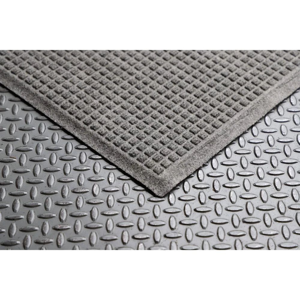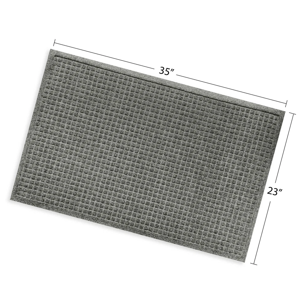 USE INDOOR OR OUTDOORS - SAFE and SKID FREE ON ANY FLOOR SURFACE - Commercial-grade, anti-static, quick-drying doormat runner will not harm any floor surfaces; hardwood, marble, tile, laminate, carpet, vinyl, concrete, deck boards. Certified skid resistant by the National Floor Safety Institute CAPTURES AND HOLDS UP TO 1.5 GALLONS OF WATER PER SQUARE YARD - Exclusive "Water Dam" holds up to 1.5 gallons of water per square yard of fabric. Ridged grid design and rubber border keep water and debris on the mat, not on the floor 100% USA MADE, ECO-FRIENDLY QUALITY CONSTRUCTION - Premium PET fiber surface, made with up to 94% recycled materials. High-grade construction stands up to extreme elements. Durable rubber backing is made of 20% recycled SBR rubber (Styrene Butadiene Rubber) MEASUREMENTS - 2' x 3' mat measures approximately 22-1/2-inches wide by 35-inches long with up to a 3% variance; 3/8-inches high DURABLE AND SIMPLE TO CLEAN - Shake or vacuum to remove loose dirt, hose clean and line dry