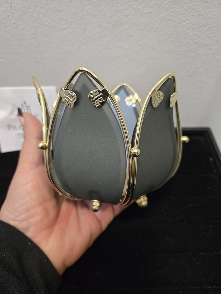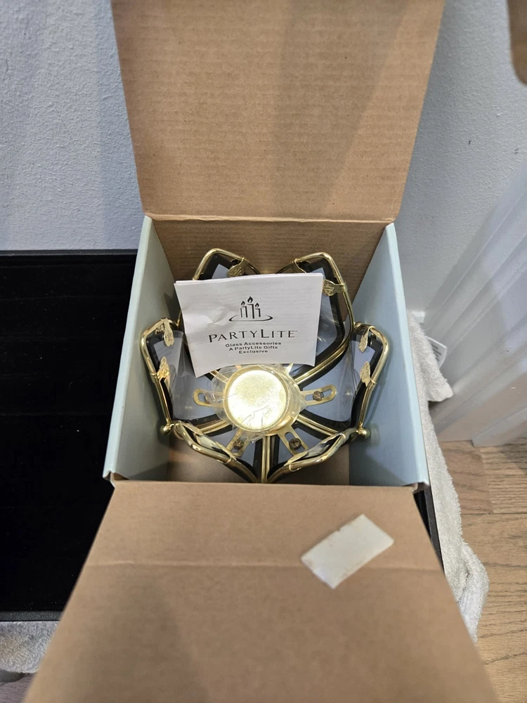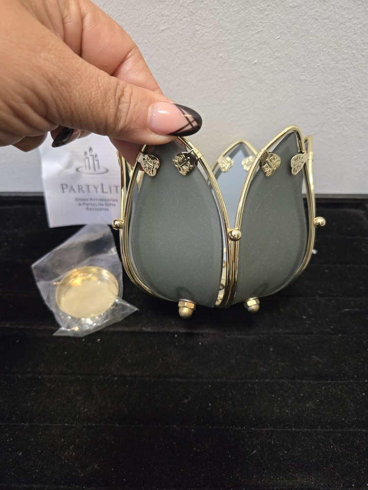 vintage retired Party lite Waterlily tealight votive candel holder approx 5in diameter box 6x5x5 smoke colored frosted glass petals set in brass has original box and paper inside box has small brass cup inside pre-owned not sure if it was ever used it didn't look like it was but dont quote me on that I purchased at a estate sale