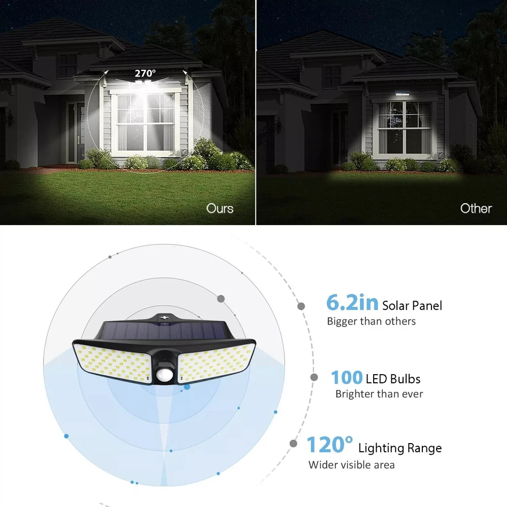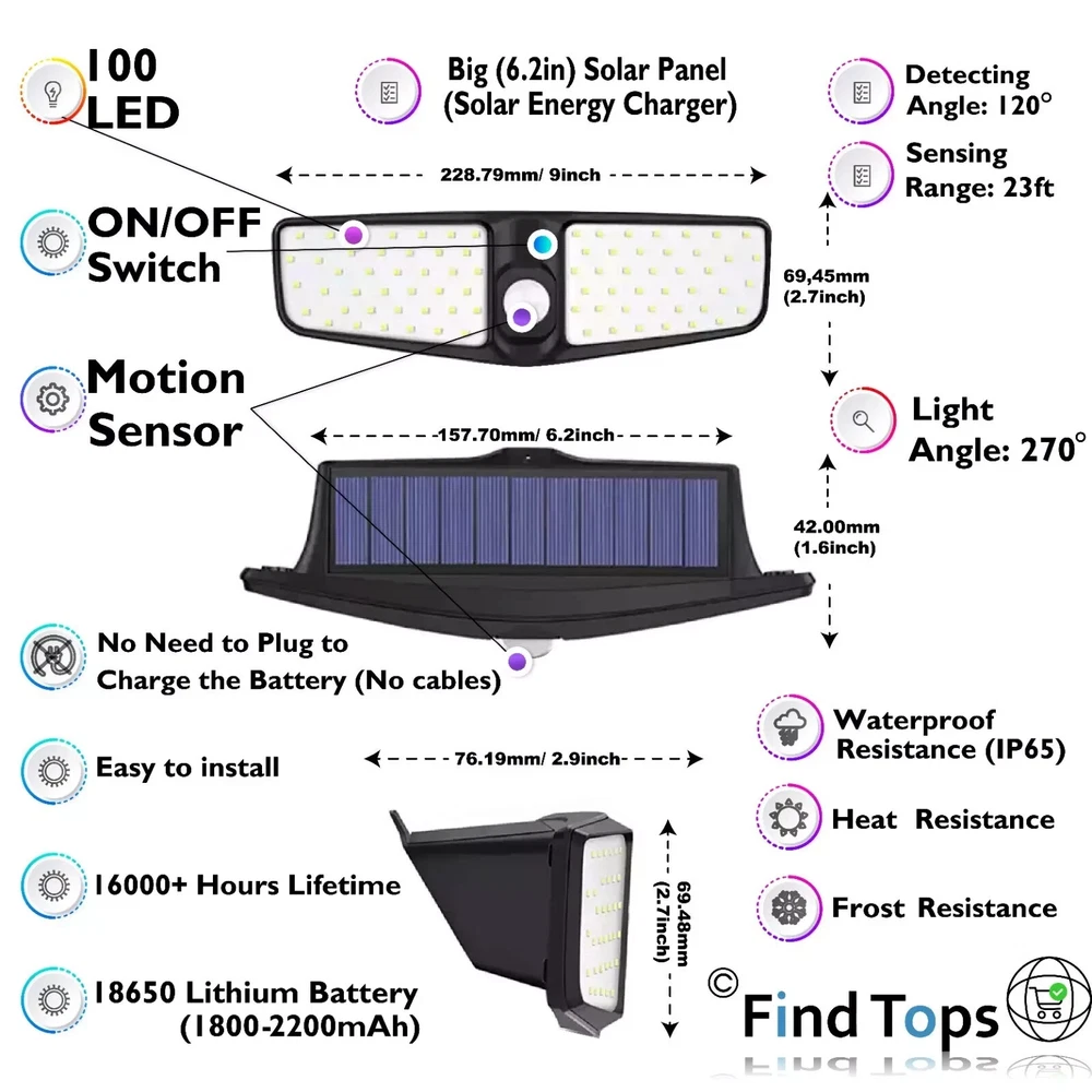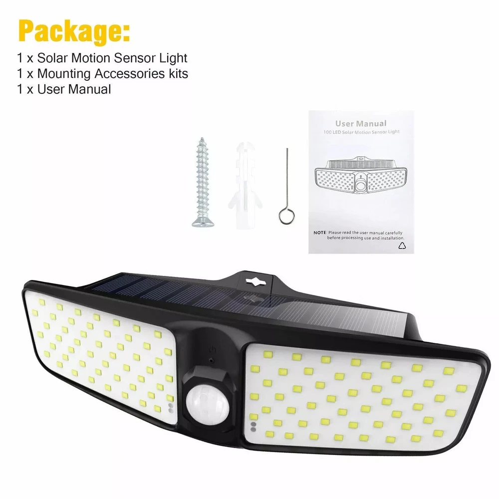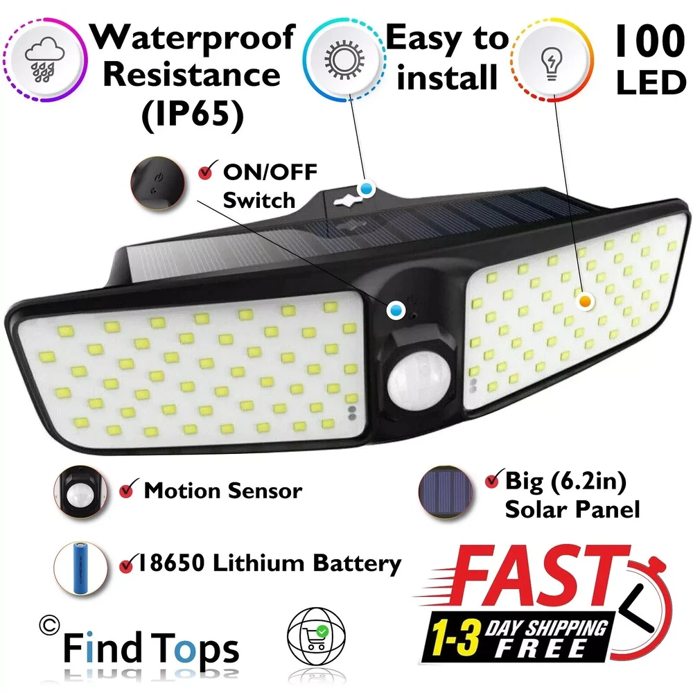 Waterproof 100 LED Solar Powered Light Outdoor PIR Motion Sensor Garden Security FindTops Waterproof 100 LED Solar Powered Light Outdoor PIR Motion Sensor Feature: 1. Super Bright: With 100 Leds and 270° wide light angle, the outdoor solar lights will greatly enhance the brightness. Providing a super bright illuminance for a widely area. 2. Auto ON/Auto Off: The LED solar lights will be automatically turn on in night when the PIR sensor detects the motion, and will be turn off after 30 seconds if no motion detects. No need to turn the switch on or off, it will automatically work at night after fully charged. 3. IP65 waterproof and durable: Waterproof coefficient of IP65. No fear of dust and rain in outdoor. The solar light works very bright even in extreme weather conditions. 4. Unique Two-sided Illumination Design: With two-sided offers wider range illumination, the LED on both sides provide enough extra light. It provides your illumination for security and safety protection. Technical Specification Waterproof 100 LED Solar Powered Light Outdoor PIR Motion Sensor . Material: ABS + PC Impact resistance and Thermal resistance. Led Quantity: 100 SMD Provide high brightness and reliability. Lighting area: 538FT2 270° wide light angle, supply a super bright illuminance for a wide area. Detecting Angle: 120° Motion Sensor The special design of the sensor provides a large angle of motion detection. Sensing Range: 23ft Enhanced sensor detects movement at a distance of 23ft Light source: White Light Provides great visual brightness. Switch: ON/OFF Pinhole Switch Hidden switch. Prevents unauthorized switching OFF. Solar panel power: 0.9W, 5.5v Big (6.2in) Solar Panel (Solar Energy Charger) Battery: 18650 Lithium Battery 3.7v 1800-2200mAh* (Depends on battery discharge level) 16000+ Hours Lifetime, Charging time 8 hours, Working time 6-8 hours. Protection level: Waterproof - Resistance (IP65), Heat - Resistance, Frost - Resistance No fear of dust, sun, rain and snow. Works even in extreme weather conditions. Installation: Fast installation. Easy to install. One attachment point. No Need to Plug to Charge the Battery (No cables). Dimensions: 9x16x2.7in , 8.4oz. Package List: 1 x 100 LED Solar Wall Lights 1 x Mounts set (Expansion Pillar-hinge + Screw) 1 x User manual and Instructions for installation 1 x Pin (For hidden inclusion) Test Results Products with the FindTops status undergo laboratory quality testing. Protection Level Test: IP65 (Dust-tight, Water jets) Dust-tight: No ingress of dust. Complete protection against contact (dust-tight). Test duration of up to 8 hours. Water jets: Water projected by a nozzle (0.25 in (6.3 mm)) against enclosure from any direction shall have no harmful effects. Test duration: 1 minute per square meter for at least 3 minutes. Water volume: 12.5 litres per minute Pressure: 30 kPa (4.4 psi) at distance of 9.8 ft (3 meters). Accelerated Test Methods Simulating Atmospheric Aging: Tested at 140 ºF (60 ºC). At a humidity of 21.5% Accelerated aging is understood as a cyclic effect on adhesive joints together or separately of humidity and temperature in a wide range, approaching the operating conditions of products in atmospheric conditions. Test results table: Test 6 samples by 6 parameters. The tests were carried out from six randomly selected samples. Contact us We can be contacted at any time through eBay messages if you have any questions, comments or product requests. We will respond to you within 24 hours and do our best to help you out! We encourage our customers to contact us with any questions or concerns! We'd like to be sure you are completely satisfied with your purchase. Payment We only sell on eBay, so you must pay via eBay's payment processing system. Your payment is covered by the eBay Money-Back Guarantee. Shipping Please note that specific areas may experience delivery delays based on local conditions. Delivery speed by 1-3 days, with some delays stretching up to 5 days. PlatinumMart