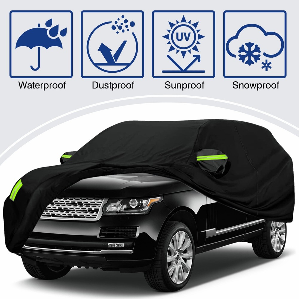 Feature : High quality: Car Covers are made of Heavy Duty 100% Waterproof material.Great for sunproof rainproof. Better for wear-resistant and tear-resistant. 4 Securing Straps : The elasticated edge of the cover will provide a good fit for your car, and 4 securing straps underneath, keeps your car in place even in windy days. Reflective Strips: The fluorescent reflective strips will shine at night to remind others away from the car and help you find the car quickly.With ear design for covering car mirrors. Suitable for All Seasons: Outstanding snow-proof, water-resistant and durable. All-weather protection, the car cover is perfect for indoor and outdoor use and keeps your vehicle look brand new, dust-proof, anti-UV, heat protection, and scratch-resistant. Size Fitment- Dimension:191'' L x 75'' W x 73''H.Please Measure Your Car's Length First.This is Very Important to Avoid Unnecessary Trouble. Specifications : Type: Full Car Cover Size: 191*75*73" Color: Black Note: In Different Years, The Length Of The Car Is Different. Please Choose The Cover According To Your Car Length. Package include : 1 x Full Car Cover