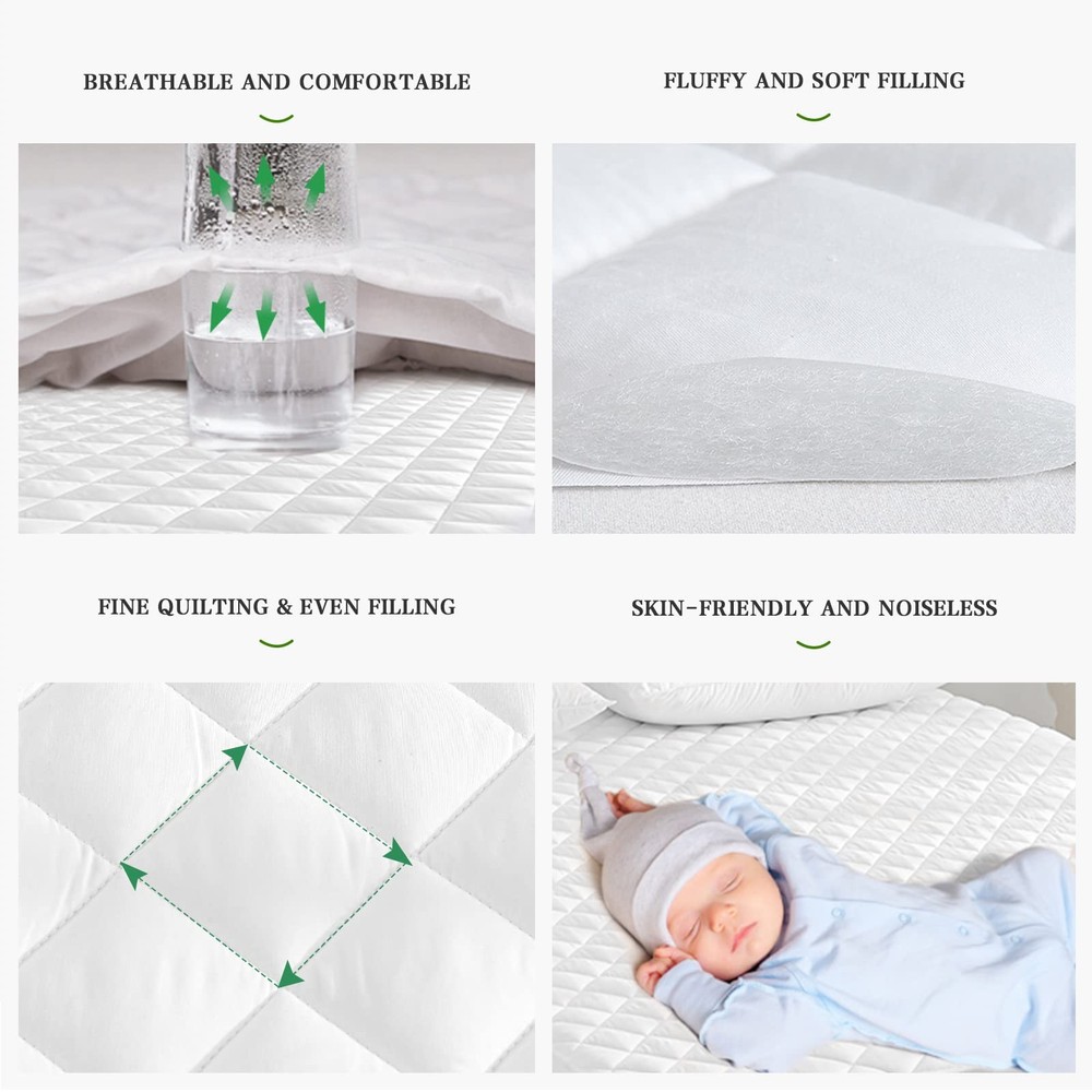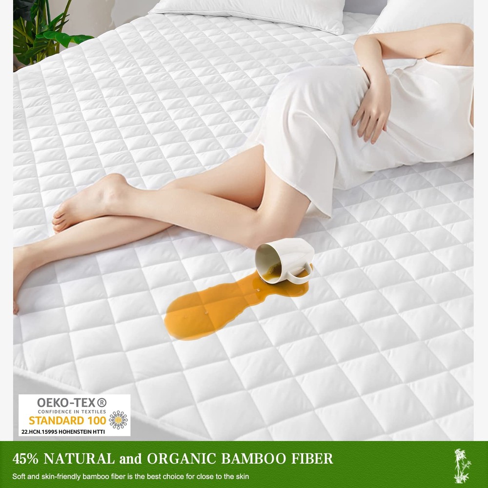 👍Comfy Mattress Pad waterproof full mattress pad is covered with high density of premium fabric, not only adding extra softness to the mattress, but also providing great breathability with thermo-regulating capability. Our waterproof full mattress topper can absorb body heat to keep you and your family comfortable during all seasons. Enjoy a beautiful good night’s sleep. 👍Fitted Sheet Style Design The waterproof full mattress protector provides 360° protection of your dear mattress with high elasticity. The well-knitted skirt not only fixs your thick mattress into place all night, but also supports you get rid of the annoying crinkling noise. You and your family deserve enjoyable and quiet sleep throughout the night. 👍Machine Washable Stress-free and time-saving cleaning by washing machine under gentle cycle. You will find that full waterproof mattress cover still maintains excellent waterproofness after many washes. About Over the decades, has been dedicating to improving your sleep experience by making the top quality waterproof full mattress protectors, mattress pad with good price. We deliver quality product to earn your trust. Let's Sleep Better and Longer with ! 💦 【Skin-friendly MATTRESS PAD】: full waterproof mattress pad is made of 45% Rayon Made from Bamboo, which has a natural countless oval meshes, quickly absorbs heat and moisture, so provides you with a cool and dry sleep environment. With waterproof mattress pad full size bed, you can say goodbye to sweaty nights! 💦 【100% WATERPROOF MATTRESS PAD】: Our waterproof mattress cover full has upgraded 100% water resistant TPU membrane, protecting your mattress from pee, perspiration, urine, and accidental spills. Our waterproof full size mattress pads fitted is exclusively designed for kids who are in the process of potty training. No more frustration about the accidents caused by kids or pets. 💦 【SOFT & BREATHABLE MATTRESS PROTECTOR】: Waterproof full bed mattress protector is surfaced with high-quality Rayon Made from Bamboo, which is more breathable and skin-friendly than other fabrics. The soft filling makes our waterproof full mattress pad protector add extra softness to your mattress without adding heat. 💦 【DEEP POCKET NOISELESS MATTRESS COVER】: Full mattress cover waterproof protects all sides of your pricy mattress from all kinds of fluids, keeping the mattress fixed in place all the time. Deep pocket full mattress cover (54"x75") fits the mattress with depth of 6"-19". Feel free to roll on bed and no worry about any noise with mattress cover full quilted. 💦 【MACHINE WASHABLE Waterproof MATTRESS Cover】: Durable and wear-resistant fabric makes our full mattress cover waterproof washable is still waterproof after hundreds of washes and keep your mattress brand new. PLEASE NOTE: Mild Mode Machine Wash, Low Temperature Dry, No Iron, No Bleach. Your satisfaction is our top priority. We will reply to your request within 24 hours.