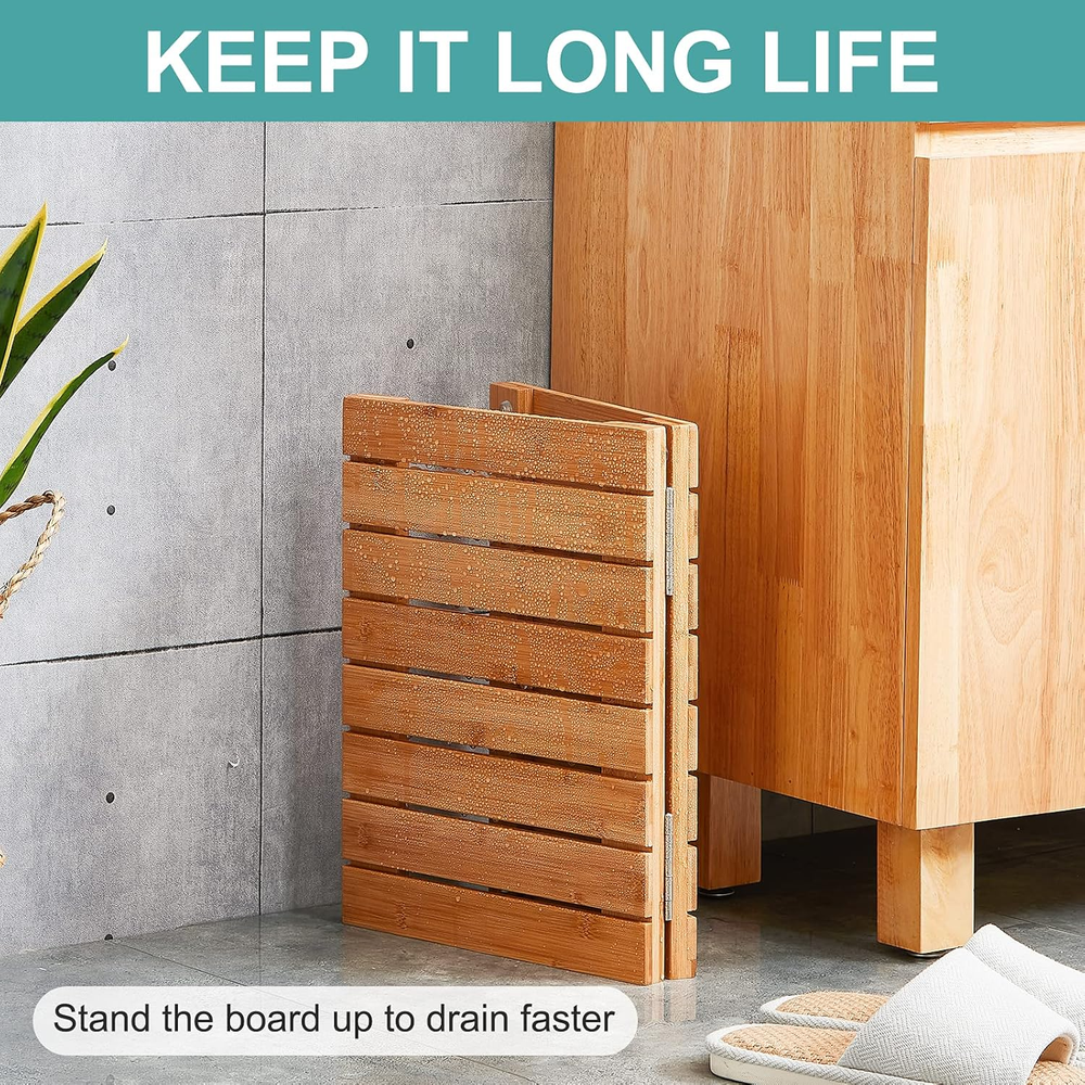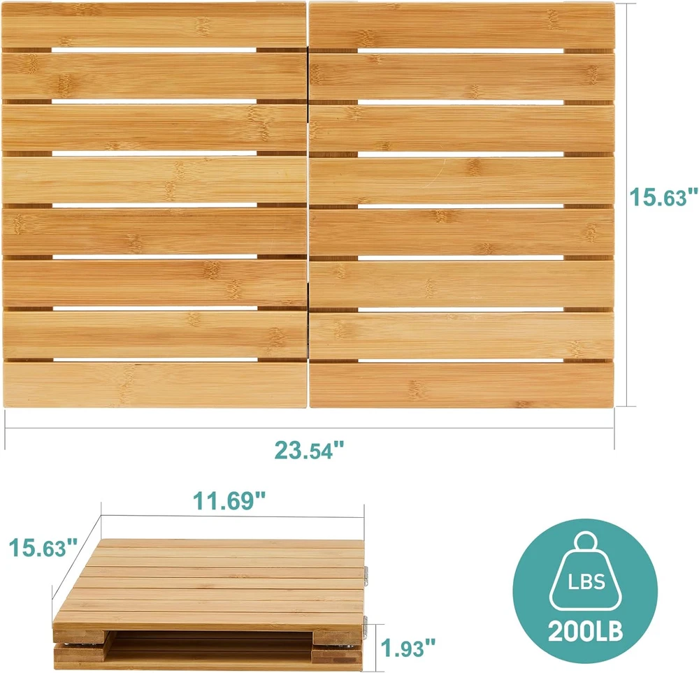 【Fodable】Folded: 15.7" x 11.7", Full: 23.5" x 15.7". It's fully assembled when you get it. 【Safety for Family】Anti-slip gaskets: 8 Pcs, Max load: 200 lbs. 100% durable Moso bamboo. 【Perfect for Indoor & Outdoor】 Great for bathroom, poolside, backyard, doormat, admirable gift to your lover. 【Waterproof & Stain Resistant】3 coats for extra water resistance. Its height off the ground will also allow water to more easily evaporate. 【No Washing & Durable】Forget the terrible smell of wet towels! You can keep it long life with no difficulty and just needs to be erected after showering. Product Description The floor mat is a perfect addition to your bathroom, bathtub, sauna, or spa area and entryway, even outdoors, such as backyard, pool. STURDY 100% MOSO BAMBOO The bath mat is made of MOSO bamboo, more sturdy and durable than wood and oak. GOOD QUALITY MATERIAL: Bamboo has the characteristics of renewability and shorter growing duration which are accordant, but as sturdy as that synthetic material. EXCELLENT SLIP RESISTANCE Soft non-slip rubber feet under the bamboo shower mat will not only ensure your safety but also protect your floor away from scratches. PERFECT SIZE The full size is 23.5''x 15.7'', with slotted panels which allows it to dry faster. FOLDS for EASY STORAGE This bamboo shower mat is assembled when you receive it. The folded size is 11.7"x 11.57",which is very convenient to carry when you go to the beach.