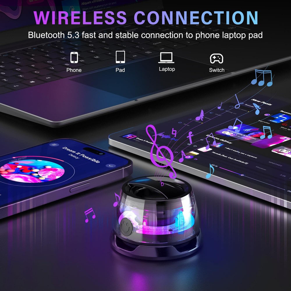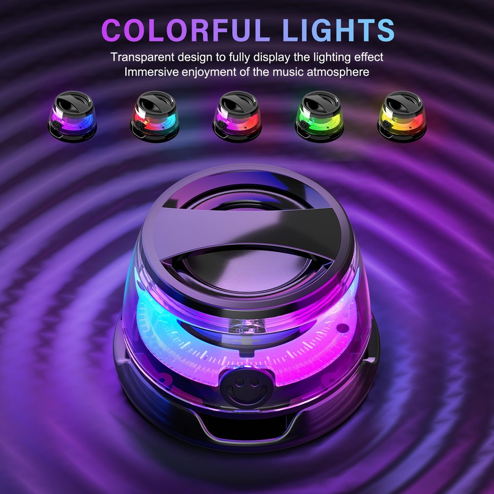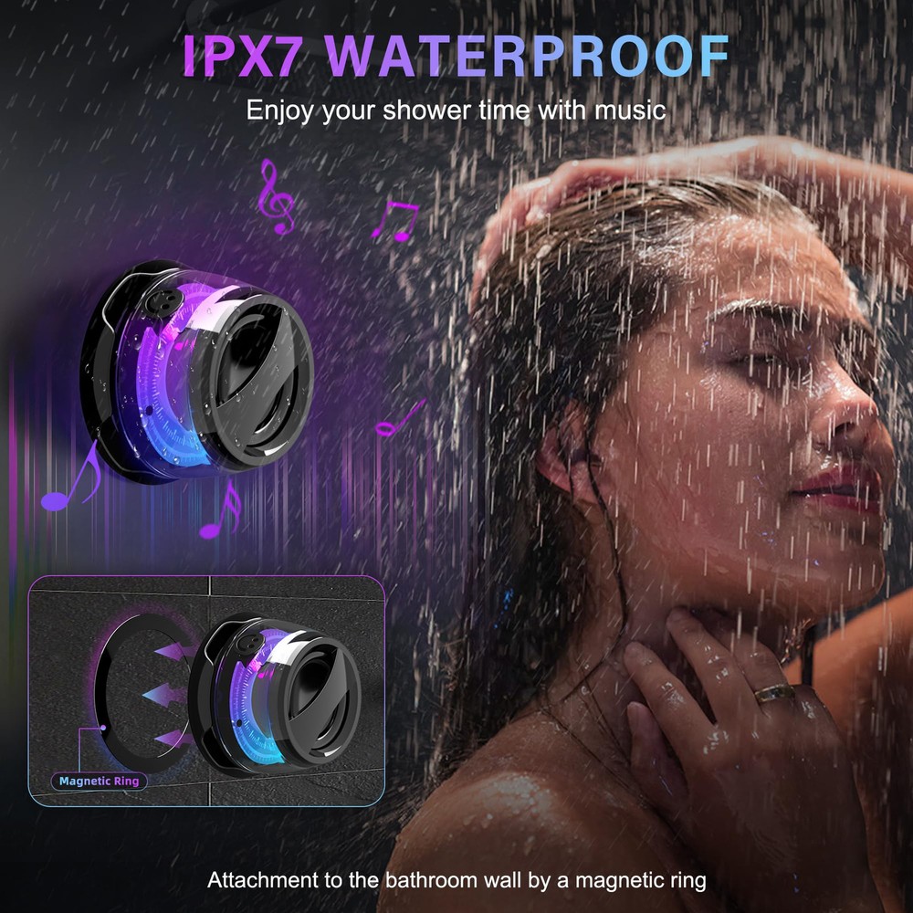 IPX7 WATERPROOF: This waterproof shower speaker has IPX7 waterproof protection, so whether it's raining, snowing, or completely submerged in water, this wireless speaker will keep working. You can use the included magnetic ring to magnetize the Bluetooth headphones to your bathroom wall. Enjoy your shower music time. No need worry about the weather and outdoor conditions, enjoy the freedom of outdoor activities and the rhythm of music. 2 IN 1 BLUETOOTH SPEAKER & STAND: The cell holder frees your hands, the wireless Bluetooth speaker makes your cell sound louder and clearer. Magnetically attaches to the back of your as a stand for watching movies, video chatting and playing music. This is a creative small gift. UPGRADED BLUETOOTH 5.3 & TWS PAIRING: Next-generation Bluetooth 5.3 chips with better, more stable signals and higher transmission rates for reliable connectivity. TWS pairing supports simultaneous connection of two bluetooth speaker. Forms a wireless 360-degree sound system. Provides you with true movie theater surround sound. The small bluetooth speaker supports connection to any device such as smartphones, laptops, etc. Stable wireless connectivity over a range of 33 feet (10 meters). 3D STEREO SOUND: This waterproof bluetooth shower speaker is crisp and clear, delivering clear, rich 360° full-range sound. Music mode enables full-range listening with the equalizer adjustment function. Game mode features powerful bass and low latency to immerse you in the game. RGB LIGHT SHOW & ULTRA PORTABLE: Wireless Bluetooth speaker with different light modes. Cool light effects can jump and change with the beat of the music. Like an elf in the night to add to the ambiance of your party. Its compact design makes it easy to carry. You can put this mini speaker anywhere such as a backpack, suitable for traveling camping and other outdoor activities.
