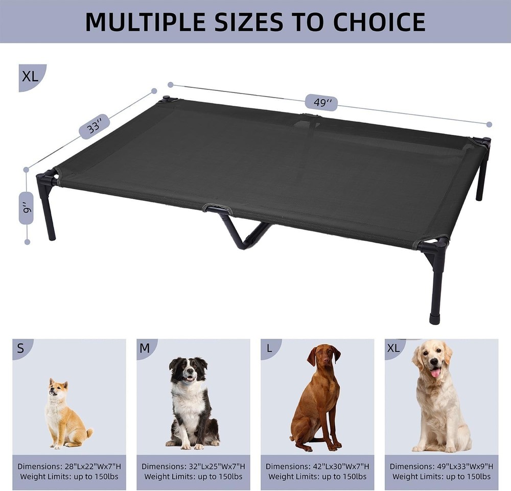 Brand: Unbranded Unit Count: 1.00 Count Item Dimensions L X W X Thickness: 49"l X 33"w X 9"th Breed Recommendation: All Breed Sizes Item Weight: 3.4 Kilograms gtin13: Does not apply Material Type: Polyester Item Height: 9 Inches Special Feature: Easy To Clean Features: Cooling, Waterproof, Outdoor, Machine Washable, Portable Personalize: No Type: Raised Bed Maximum Weight Recommendation: 150 Pounds Product Dimensions: 49"l X 33"w X 9"th Dog Breed Size: Large Frame Material: Metal Item Form: Open Frame Cover Material: Teslin Mesh Item Shape: Rectangular Other Special Features Of The Product: Easy To Clean Dog Breed: All breed sizes Target Species: Dog UPC: Does not apply Color: Black Dog Size: XL Fill Material: Teslin Mesh Size: Xl: 49x33x9 Inches Material: Teslin Mesh