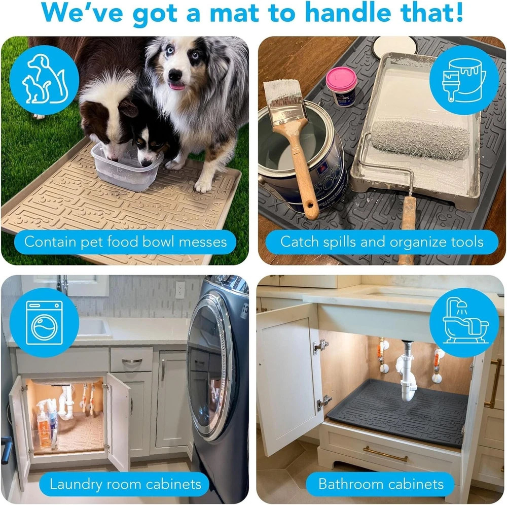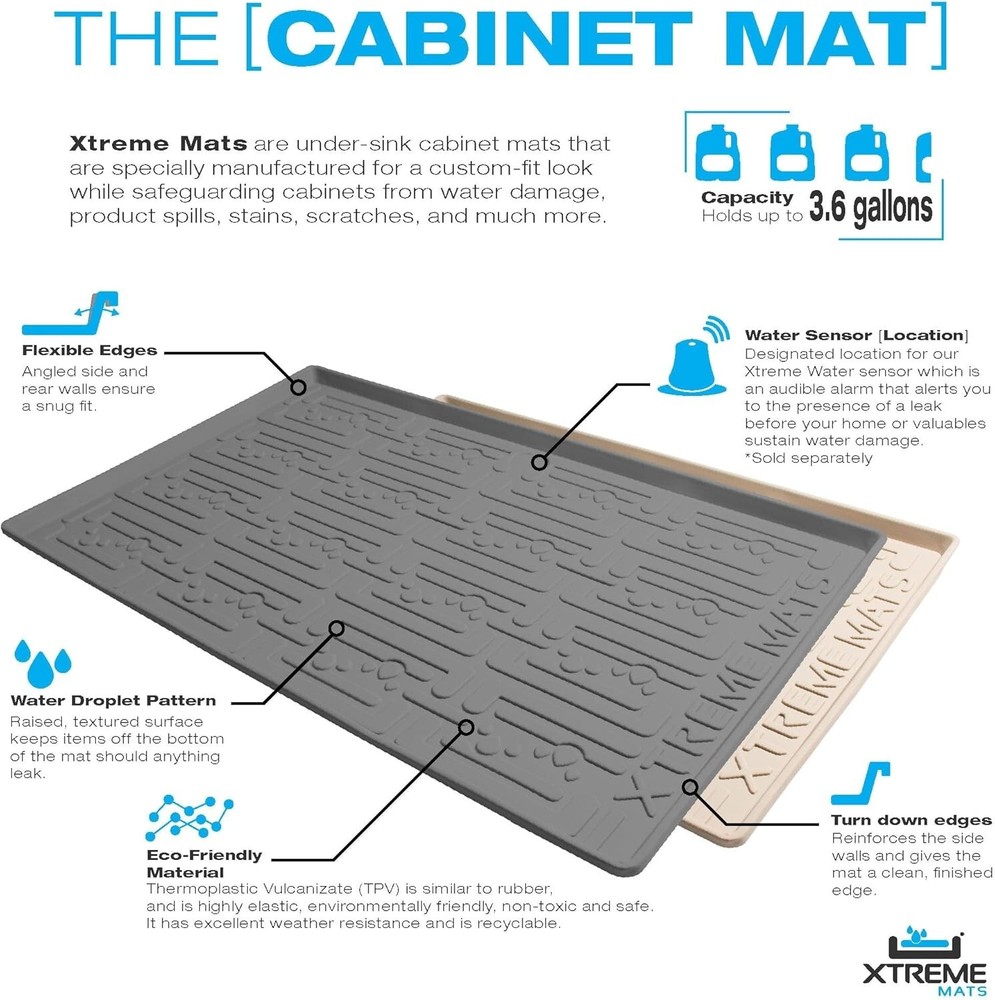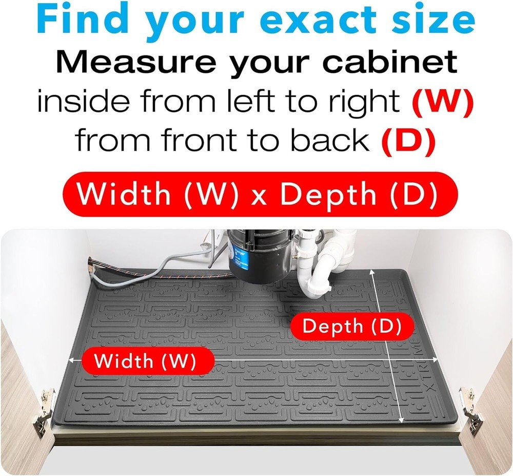 Waterproof Under Sink Mat Gray 37" 1/4 x 22 1/4 Shelf Liner Cabinet Liner for Home Kitchen & Laundry Cabinets Plumbing Leak Water Damage Prevention Flexible Under Kitchen Sink Driptray Superior Protection: L x 22" = kitchen cabinet; L x 19" = bathroom cabinets; are the ORIGINAL Under Sink mat designed to protect your cabinets, shelves, and floors from damage caused by plumbing leaks, stains, scratches, product or chemical spills; can hold up to gallons of liquid in the event of a leak or product spill, making our mats the leader in the industry; Our mats have a multipurpose function as a driptray, under sink cabinet mat, and a shelf liner all-in-one Flexible and strong design, our waterproof, low-density polyethylene mats allow for flexibility and durability and produce no toxic VOC's, featuring raised, angled side walls and a textured surface to ensure a snug fit while keeping stored items from getting wet in the event of a leak; Sturdy enough to support gallons of water yet flexible enough to install through small cabinet openings and open back up to its original shape once inside Easy to clean and install and can be removed quickly for clean-up; Our under sink drip tray pans are the perfect solution for messy, dirty, or disorganized bathroom cabinets; Great for vacation homes and rental properties; if you do not see your measurements, please contact me and we will guide you to the best fit satisfaction against manufacturing defects; Water sensor sold separately; please check for plumbing coming through the bottom of your cabinet before ordering; Measure the inside of your cabinet and make sure your supply lines and drain aren't coming from the floor or your cabinet or else the mat will require modification American Company: are designed and engineered in the USA, headquartered in Central Florida; Available 8 am - 5 pm EST to answer any questions Ships Flat: Unlike cheaper silicone alternatives, our mats ship flat and arrive ready to install without dents or creases, ensuring a perfect fit and long-lasting protection for your cabinets. Under Sink Cabinet Mats feature a robust construction designed to withstand daily use