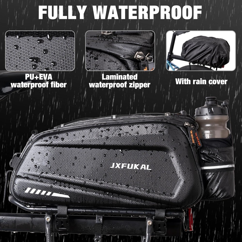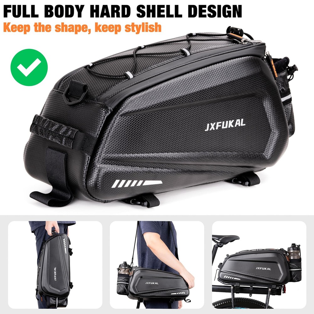 🚴WATERPROOF HARD SHELL DESIGN: The bike rack bag is made of EVA, coated with PU. It features water resistant, sturdy, lightweight, and easy to clean. Solid shapes make it not deform and look stylish. The bike bag also comes with a rain cover, so no worry about cycling on a rainy day. 🚴9.5L CAPACITY: Our bike trunk bag includes a 9.5L main compartment, 3 inner mesh pockets, an extra top pocket, and an adjustable elastic cord. This help keep your riding essentials well organized. Dimension of 15.35 x 6.89 x 7.87 inches(L x W x H), large enough to store bike tool kit, pump, wallets, phones, power banks, small speakers, towels, clothes, food, drinks, bike locks, sunglasses, etc. 🚴REFLECTIVE: The reflective design on four sides increases nighttime visibility, and the taillights (not included) are hung on the rear strap making your cycling safer. 🚴EASY TO INSTALL: With 2 buckle mounting straps and a velcro strap, the bike pannier is installed and unloaded in seconds and it ensures its max stability and security. Adjustable straps make it fit on most bicycle racks, like mountain bikes, road bikes, e-bikes, hybrid bikes, and gravel bikes. 🚴YOUR GREAT BIKING BUDDY: With the shoulder strap and the handle, the bicycle bag is easy to carry. No matter what kind of occasion, such as picnics, camping, commuting, hiking, or travel, it will be your good partner.