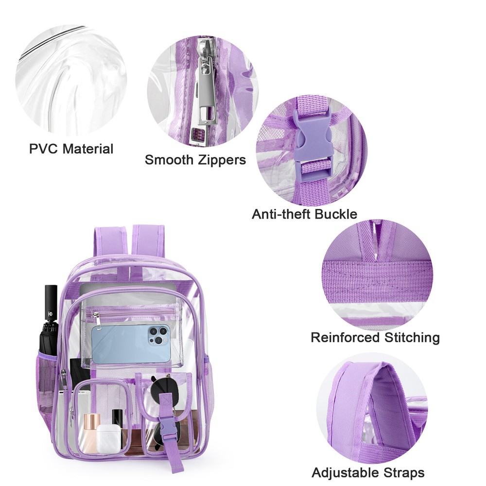 Product Description This waterproof clear backpack is crafted from heavy-duty materials, offering durability and security. Perfect for school, work, or events, it features a see-through design and spacious compartments for men and women. Product Feature π Clear PVC Material: thicker and smell-less, durable and sturdy. π Wide Shoulder Strap: can release the stress from heavy stuff. π Waterproof Fabric: protect inside items dry from rainy and snowy day. π Stadium Approved: suitable for sport event, traveling, concert, college, work. π 1 Large Main Double Zipper Pocket: for binders, laptops, books. π 1 Front Zipper Pocket: for book, phone, extra items. π 2 Small Front Zipper Pockets: for earphone, charger, pen, easy access. π 2 Side Mesh Pouches: for water bottles or folding umbrellas. Product Specification Type Clear Backpack Color Purple Bag Size 16.1 x 12.5 x 5.1" Strap Size can be adjusted from 16" to 30" Material PVC Package Included π1 x Waterproof Clear Backpack Location Descriptions To improve your buying experience and ensure fast delivery, Your order will be shipped from the warehouse located in either new jersey or california that is closest to your address. If you have any questions, Please contact us. Thank you for your support !