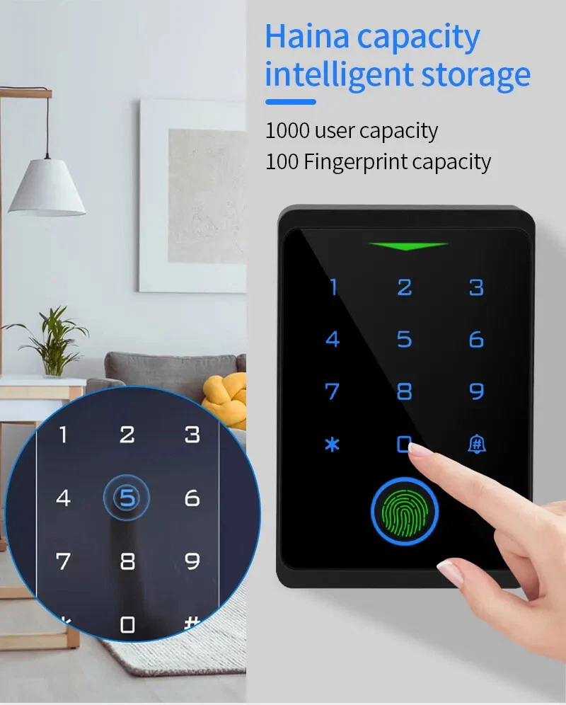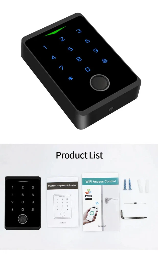 Product sellpoints Tuya APP Integration:Seamless smart home integration with Tuya APP for easy access control and management. High User Capacity:Accommodates up to 1000 users, including 990 common users and 10 visitor users. Electronic Door Lock With Key Fob|Fingerprint Door Lock External|IP66 Waterproof Grade:Engineered for durability, this lock withstands harsh weather with its IP66 waterproof rating. Multiple Access Modes:Supports fingerprint, PIN, and RFID card access, offering versatile entry options. Wireless Connectivity:Enjoy the convenience of 2.4G WiFi connectivity for remote access control. Tuya APP Door Lock IP66 Waterproof Keyless Fingerprint WIFI Access Control Standalone Keypad Fingerprint EM RFID Card Door Entry Note : CF1-EM-WIFI has no doorbell cables and no funtion for connection to external doorbell CF1-EM-WIFI Economic Touch Fingerprint Keypad > material:ABS plastic material > One relay, 1000 users (990 common users+10 visitor users) > Fingerprint Touch keypad, PIN length:4~6 digits > Card Type:125KHz EM > Wiegand 26 bits output > Wiegand 26/34 bits input automatic identification > Backlit keypad,can set automatic OFF after 20 seconds > IP66 Waterproof version >The standard version is 125khz ID EM version