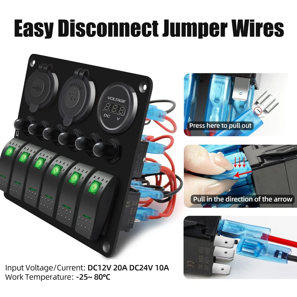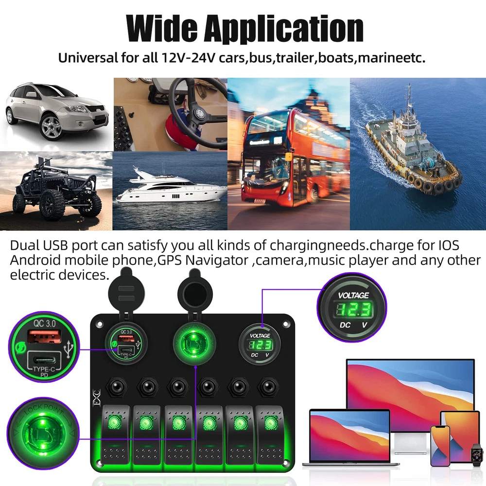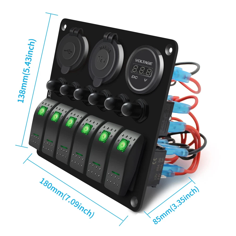 Waterproof Marine Boat Rocker Switch Panel 6 Gang with QC3.0 USB & Type-C Slot S