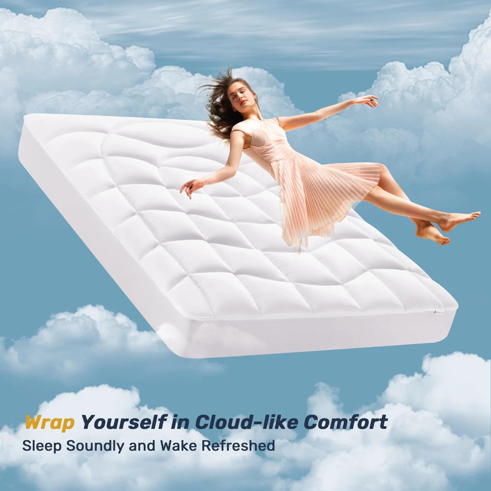 Ergonomic Comfort: Experience ultimate comfort with our ergonomically quilted queen mattress pad. Its specially designed-stitching contours your body, providing gentle support that soothes muscles and eases tension. Enjoy a relaxing sleep environment with our white queen mattress topper that helps reduce stress, waking you up refreshed and recharged every morning. Five-Layer Design: Our 5-layer waterproof mattress pad queen offers the perfect balance of comfort and durability. The breathable microfiber surface keeps you cool, while the soft, supportive Blended fillings provide plushness without sacrificing support. An extra sturdy base upgraded waterproof TPU layer, and quiet knit fabric ensure lasting protection and a peaceful night’s sleep. Quiet Waterproofing: Stay comfortable and protected with our waterproof mattress topper queen, designed for a peaceful and restful sleep. The advanced 100% waterproof layer keeps spills and stains at bay without the crinkling sounds of traditional waterproofing so you can enjoy a quiet, undisturbed night in soft, cozy comfort with our queen mattress protector waterproof. Perfect Fit: Our white mattress pad queen size offers a secure and convenient fit with its 360° full-wrap design and deep pockets that accommodate mattresses up to 8"-21" thick. The 1.6" high-elastic, extra-wide straps ensure a snug, slip-free fit, making installation a breeze. Our queen mattress cover is available in a complete range of sizes to perfectly complement any bed. Easy Care: Our queen size mattress protector is simple to care for—toss it in the washing machine on a gentle cycle with cold water. Tumble dry on low heat (below 105°F). Do not dry clean, iron, or use bleach. Since it's vacuum-packed, allow the queen size mattress toppers to air out for at least 12 hours to fluff up.