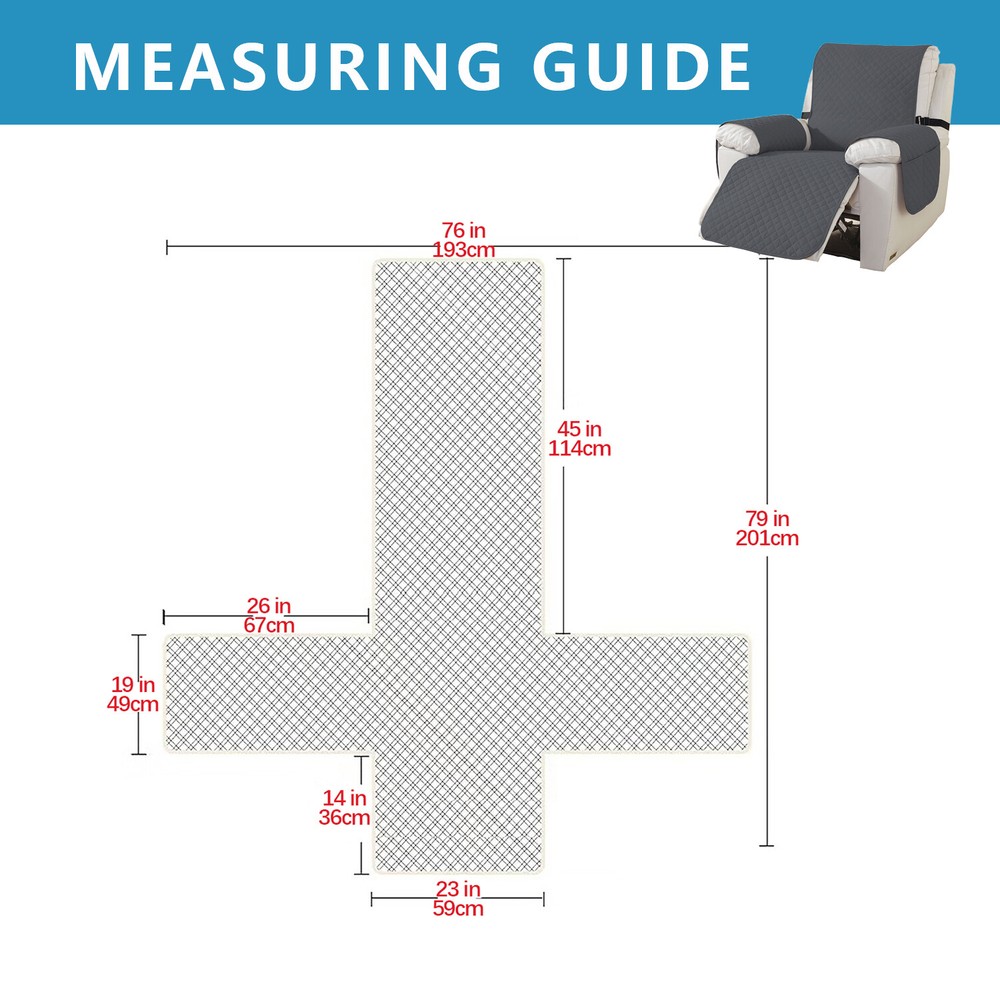 COMFORTABLE FABRIC: This recliner cover is made of high-quality fabric, which is comfortable and does not irritate the skin. This recliner cover fits recliner sofas with a recliner width of 23 inches, please measure your sofa before purchasing. Anti-slip design: There are anti-slip rubber particles on the back of the recliner cover, which increases friction and is not easy to fall off. And the recliner cover has an elastic straps, which can fix the recliner cover to the recliner nicely. The head and arm lengths of the recliner cover have also been extended. PROTECT YOUR RECLINER: This recliner cover is made of 100% waterproof fabric, perfect for protection from splashes, pet fur, normal wear and tear or any possible accident. It protects your recliner well and gives your old recliner a new look. EASY INSTALLATION: This recliner cover is easy to install and takes less time. Simply drape the recliner cover over the recliner, tie the elastic straps, and tuck any extra fabric into the gap. You can install it very well. EASY CARE: This recliner cover is directly machine washable and tumble dry. Please wash at around 30 degrees Celsius. Do not bleach. Do not iron.