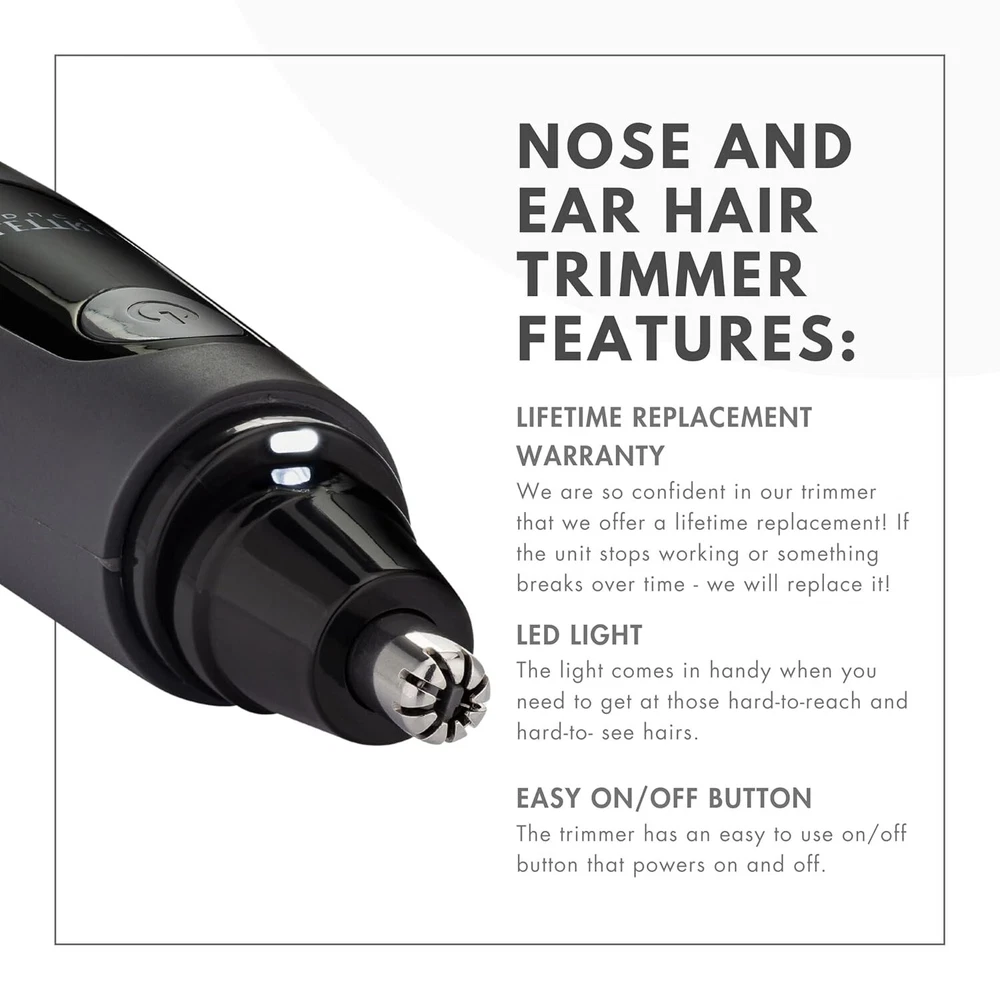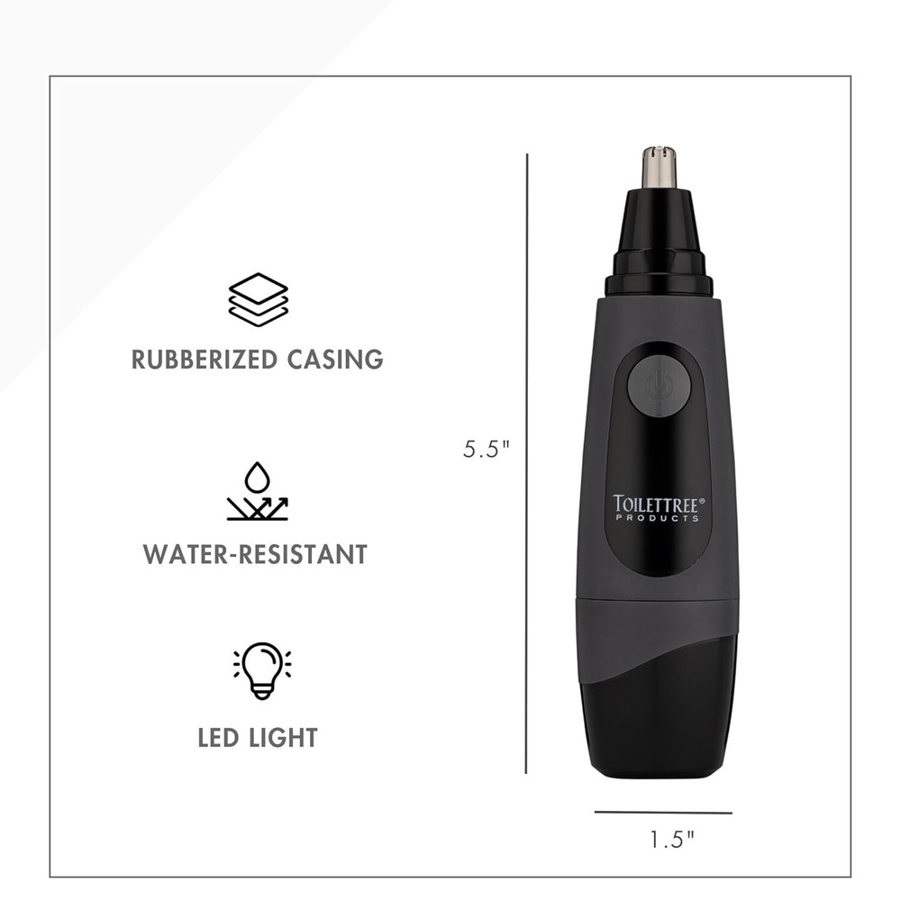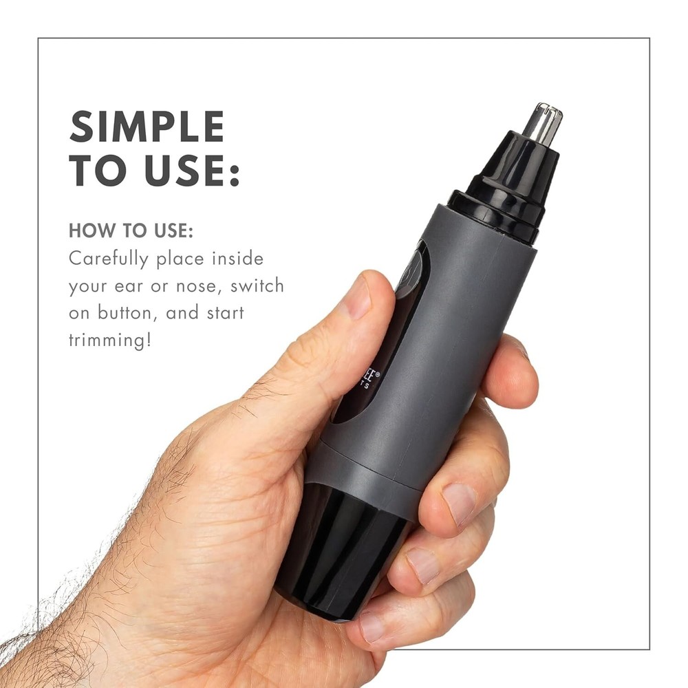 This high-end cordless battery-operated nose trimmer with bright LED light is made with a soft rubber grip finish; the light comes in handy when you need to get at those hard-to-reach and hard-to-see hairs. The lightweight, but powerful, rotary cutting system allows hairs to enter the trimmer tip from the top and also from the sides, which is very helpful for stray hairs not only in the nose but also on your eyebrows, beard, and ears Right out of the box, you will feel the difference, precision, and quality of this trimmer; it offers a smooth trim with its stainless steel high quality blades and gives you a perfect cut every time; no painful pulled hairs Our best water resistant design allows you to use this trimming tool in the shower and it makes clean-up afterwards quick and easy; it's the best trimming and cutting tool you'll ever experience from a men's clipper product This nose trimmer operates on 2 AA batteries (not included), which makes it an economically affordable way to take care of the daily trimming needs of your nose, brows, and ears
