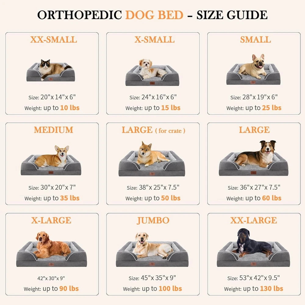 28D EGG CREAT FOAM: 4 inch high 28D egg sponge large dog beds, the sponge is soft and elastic, can support the dog's joints and muscles evenly, especially suitable for older dogs with anxiety and extra large dogs with arthritis. The classic padded dog cushion offers high loft orthopedic padding as well as a super cozy nesting and digging for dogs and cats. SMART DESIGNED: This pet bed adopts four-sided wrapping design that provides the dog enough security. The soft and comfortable broken foam arm rest surrounds your pet's neck and head, providing extra comfortable support for your dog's neck and head. Soothing and relaxing to help your dog sleep better. SOFT SLEEP SURFACE: The sleeping area of the plush dog bed is 34 x 26 inchs, which gives the dog enough space to move. The surface is made of high quality PV plush, which feels comfortable and does not fluff or fade. The materials are gentle on skin, nose and paws. WATERPROOF & EASY TO CLEAN: Don't worry about getting the orthopedic foam dog bed wet, the washable dog bed cover has a lining on the back to keep off liquid leakage and protect the foam. Removable cover with zipper support machine washing and low-temperature drying. NON-SLIP BOTTOM: There are non-slip rubber particles on the Oxford cloth at the bottom of this extra large dog bed, which can be fixed on the floor to ensure that the dog will not slide easily when playing or sleeping on the dog beds for extra large dogs, providing the dog with a sense of security. Product Description The video showcases the product in use. The video guides you through product setup. The video compares multiple products. The video shows the product being unpacked. hero-video Merchant Video The video showcases the product in use. The video guides you through product setup. The video compares multiple products. The video shows the product being unpacked. hero-video Merchant Video The video showcases the product in use. The video guides you through product setup. The video compares multiple products. The video shows the product being unpacked. hero-video Merchant Video Dog Sofa Bed Collection of Comfort Expression Add to Cart Add to Cart Customer Reviews 4.4 out of 5 stars 8,477 4.4 out of 5 stars 110 4.5 out of 5 stars 196 4.7 out of 5 stars 96 Price $58.99 $ 58 . 99 $32.99 $ 32 . 99 — — Material Polyester Polyester Polyester Polyester Foam Egg-crate Foam Egg-crate Foam Egg-crate Foam & Memory Foam Egg-crate Foam Waterproof ✔ ✔ ✔ ✔ Washable Cover ✔ ✔ ✔ ✔ Nonskid Bottom ✔ ✔ ✔ ✔