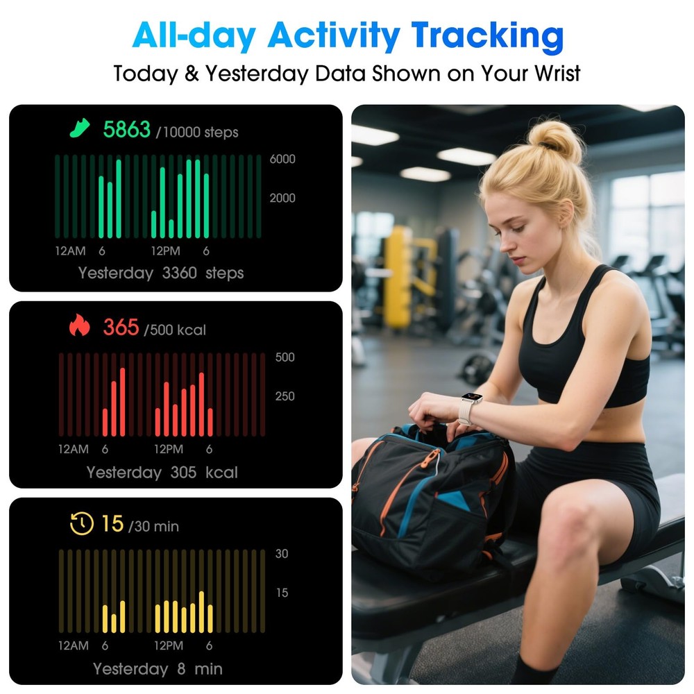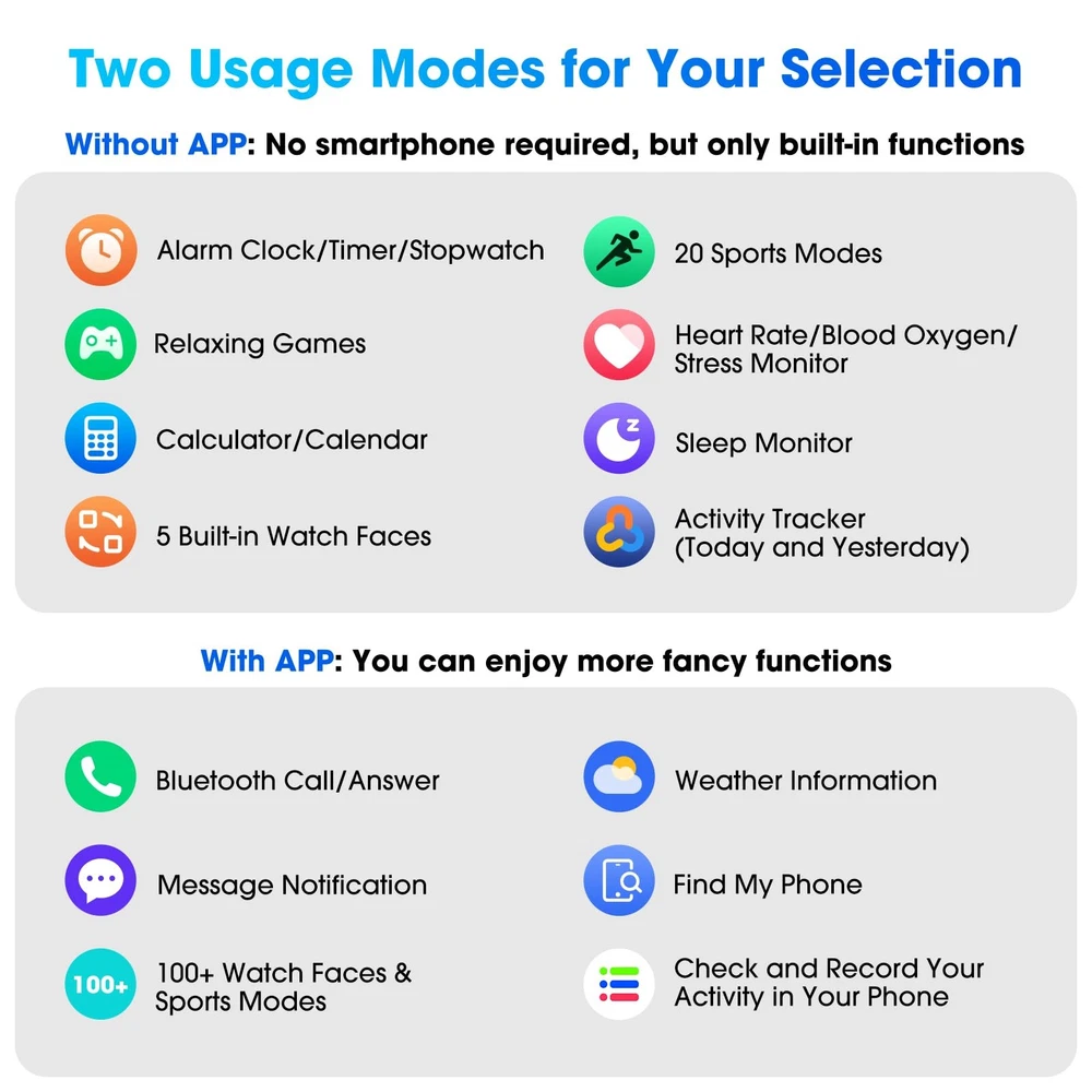 Fitness Tracker No APP & Phone Required Pedometer Watch: The pedometer watch can be used seperately without APP or smartphone connections! It's easy to enjoy features like pedometer, stop watch and so on. Perfect for anyone looking for an easy fitness tracker without the hassle of smartphone setups. Fitness & Activity Tracker: The smart watch monitors your heart rate, stress levels, steps, calories and distance in real time. You can monitor blood oxygen manually on watch. Also, it tracks your sleep data after you fall asleep, assisting you impove sleep habits. IP68 Waterproof & Battery Life: This fitness tracker meets IP68 waterproof standard, ensuring no worry wear during swimming, allowing you to fully enjoy aquatic activities. It only takes 1.5 hours to fully charge and can last up to 7 days on a single charge. More to Explore with APP: When connected APP, the watch will unlock more features like bluetooth calls, message reminder, music control, cycle tracking, weather display and more. Just turn on smartphone bluetooth, simple download VeryFit App and scan OR code to connect, there are more suiprises on the go. Multiple Sports Modes: Enjoy your fitness journey with multi-workout modes. It is easier and effective with detailed data recorded. Note: there are 20 sports modes without APP. When connected APP, it offers 100+ sports modes. Large Clear Display & Customizable Watch Dials: This smartwatch features a large LCD color display, more clear to view and easier to operate on watch, especially friendly for both elderly! There are 5 built-in dials available without App. If paired with APP, there are cloud watch faces and customize exclusive dials.
