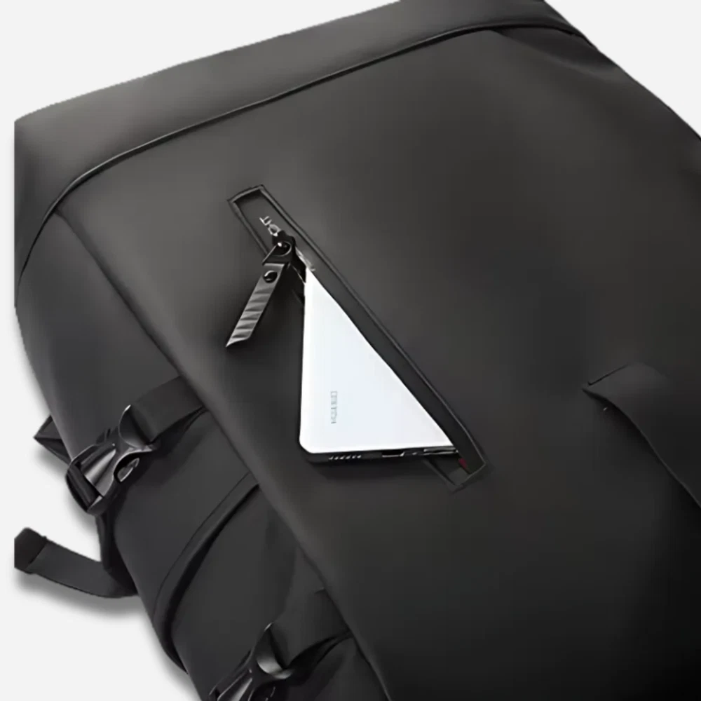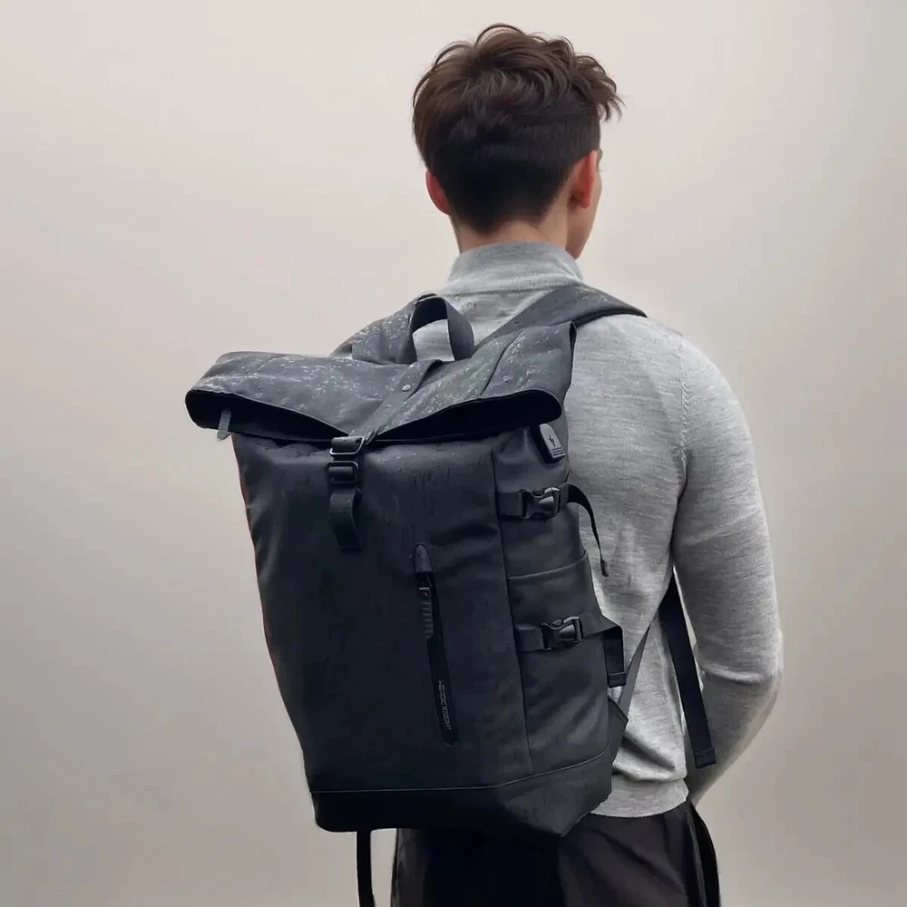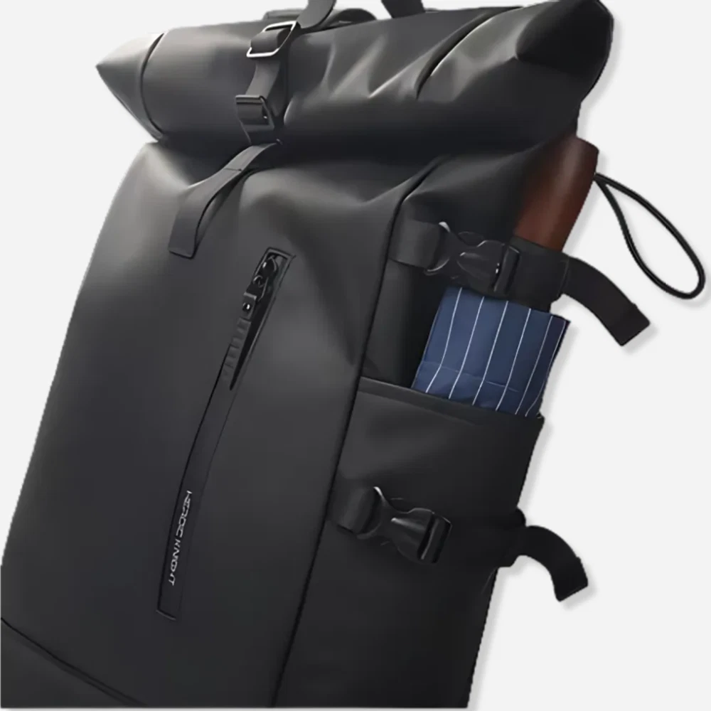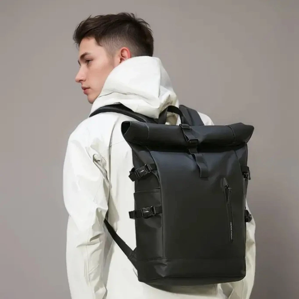 This backpack is a game-changer! The water-repellent material keeps my stuff dry, and the roll-top design adds extra security. Super comfortable for all-day wear, whether I'm commuting or hiking. The laptop sleeve fits my 15" laptop perfectly, and the luggage sleeve is a nice touch for travel. Love the sleek black look—stylish yet functional. Highly recommend for anyone who needs a reliable, versatile bag!