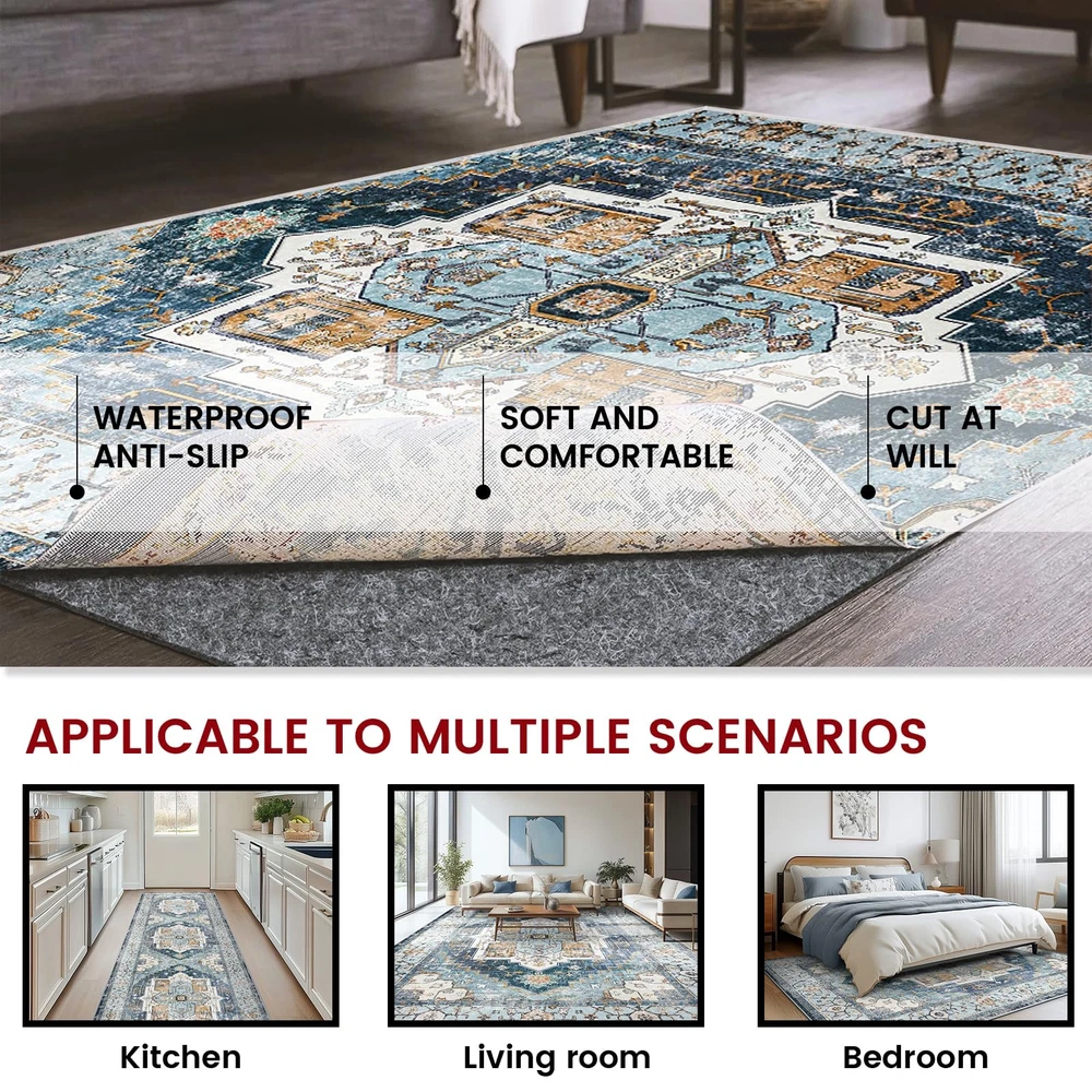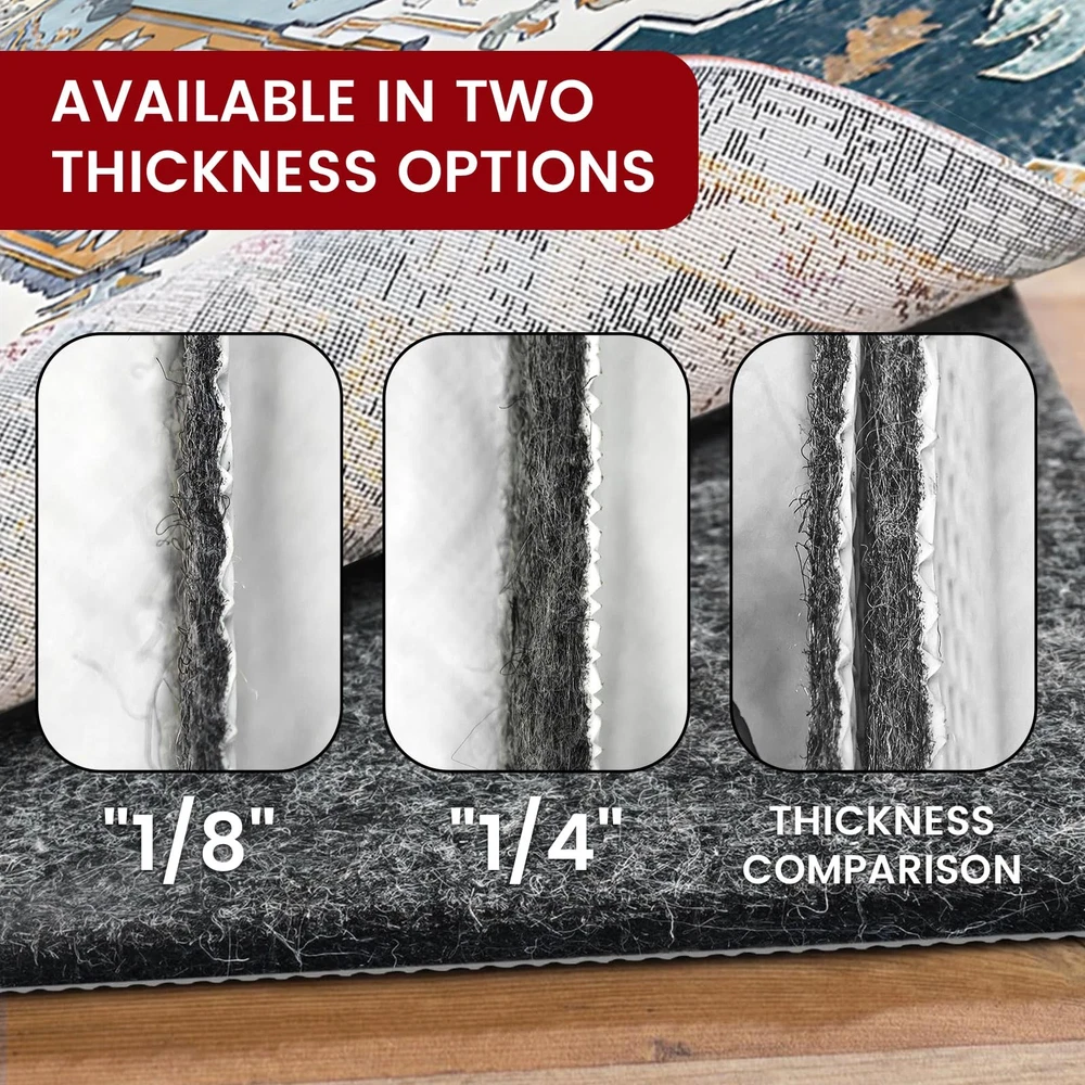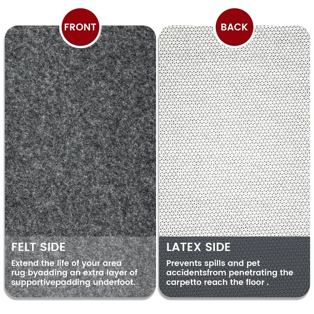 Waterproof Rug Pad, 8x10 ft Area Rug Non-Slip Carpet Pad, Non-Slip Rug Pads for All Floors and Finishes, Felt Pad for Hardwood Floors, Keeps Carpets in Place Soft and Safe 100% Waterproof : This rug pad made of Thick felt and Waterproof TPR materials for all types of floorboards. Provide varying degrees of underfoot softness, floor protection, sound absorption, insulation and all-around extra comfort to any room in your home with carpeting. Rug Pad Only : Rug not included. Oversized and perfect for living room and bedside rugs. Made of felt and waterproof TPR that won't stain, damage or mark your floors, this rug pad is sturdy and durable, bringing comfort and convenience to your life. RUG PAD ONLY : Rug pad only, area rug not included. Extra large size, perfect for living room and bedside rugs. Made of felt and waterproof TPR, won't stain, damage or mark your floors, sturdy and durable, providing you with enough PROTECT YOUR CARPET : This carpet pad is made of high quality material with a waterproof TPR backing that is safe to use on hard floors such as hardwood floors and tile. Prolonged friction can damage the carpet backing and cause the pile to loosen. Acts as an extended cushion between the carpet and the floor, tightening the carpet fibers and preventing them from being crushed, while helping to ensure that the carpet stays clean and extends the life of the carpet, providing more for your life. Non Skid :Put the felt pad under the carpet and you'll feel something completely different! This rug pad prevents carpet from shifting, knotting and wrinkling on hard floors. Perfect for high traffic areas and families with children and pets.Free Cut: The carpet padding can be easily trimmed, Just 2 inches smaller than the carpet size to fit the size of the rug carpet. Edges will remain firm and smooth.