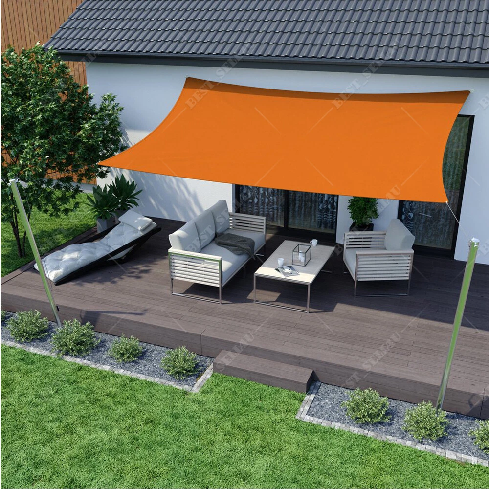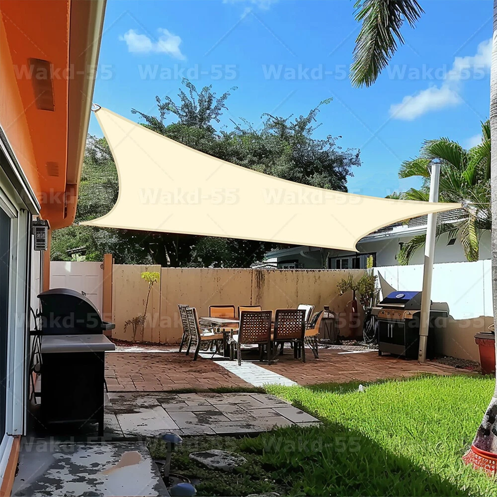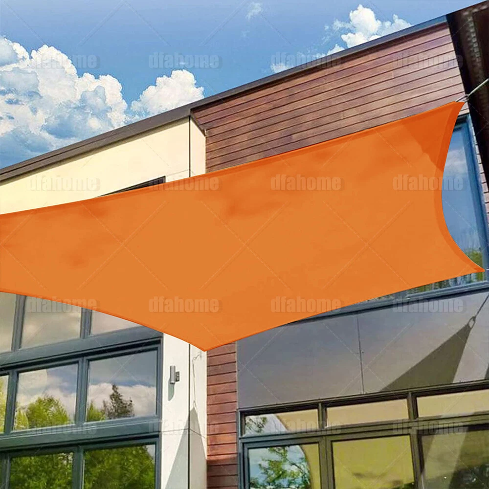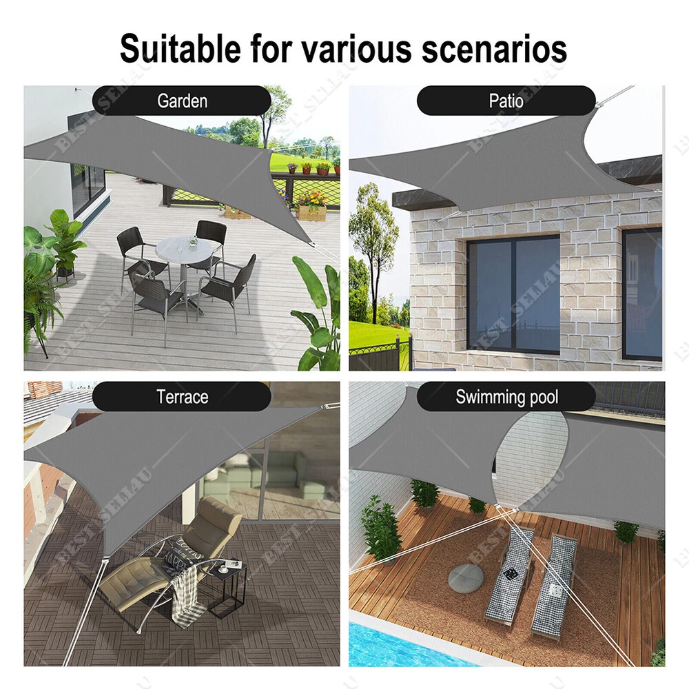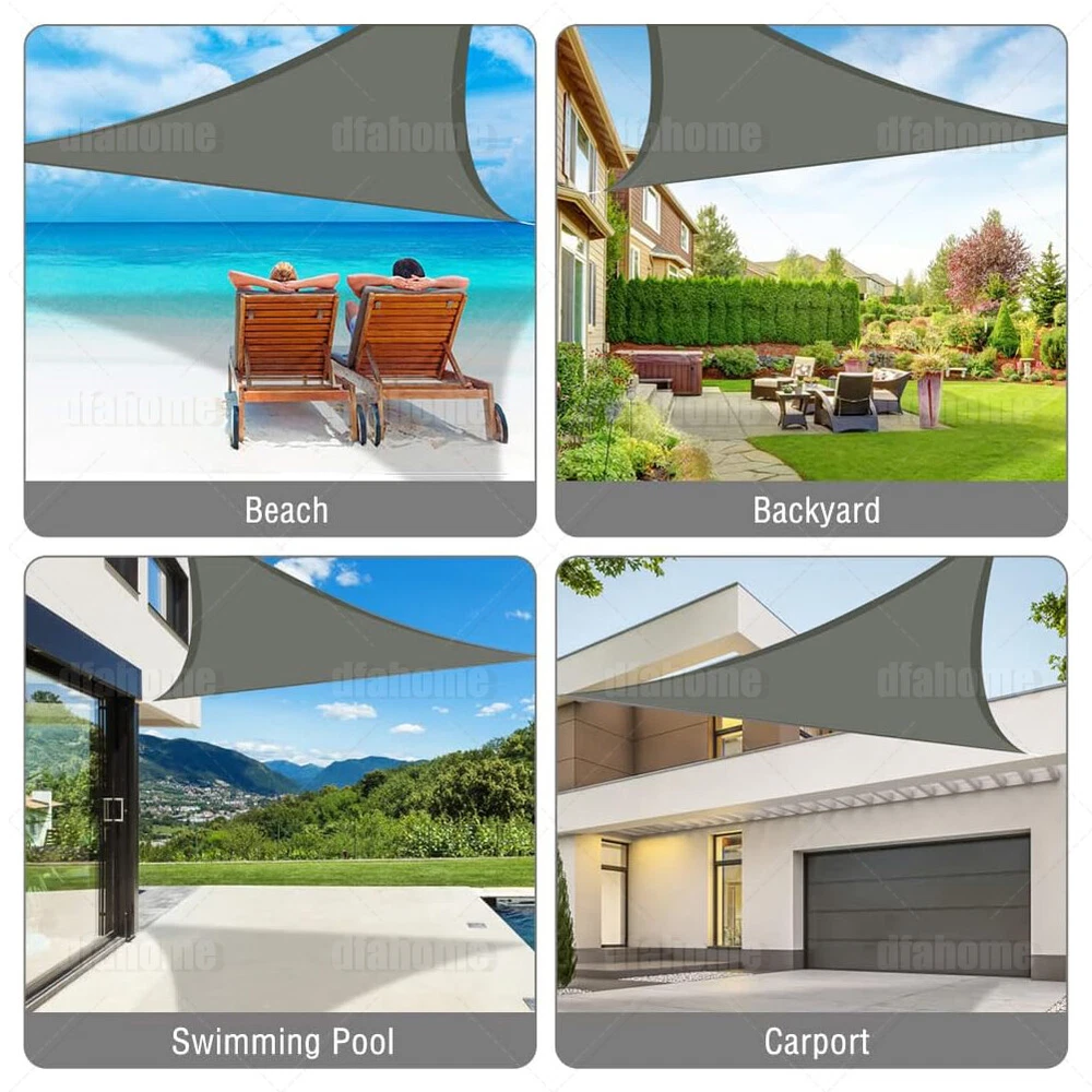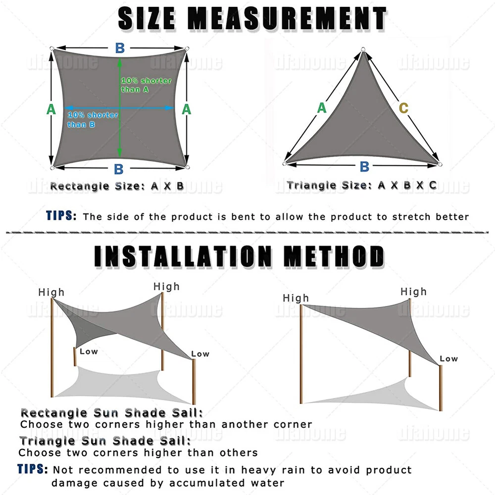Descriptions: The Waterproof Sun Shade Sails Perfect for gardens, patios, swimming pools, BBQ areas and etc. Give you a cool and comfortable experience in the hot summer. It can also create a good mood for you in Rainy days. 【WATER RESISTANT】Sun shade sail is 300D high density polyester fabric with PU coating(160 g/m²), can withstand 2000MM water pressure. It's tear resistant, waterproof and weatherproof. But we don't suggest to use shade sail in heavy rain, continuous heavy rain may cause slight water seepage. 【MULTIFUNCTIONAL & DURABLE】Double stitched edges and reinforced corners, making both sides more robust. Our solar sail is suitable to be used in garden, backyard, patio, courtyard, carport, pergolas, swimming pool, balcony, terrace, camping trip, lawn or another outdoor area. Protecting your privacy safe. 【EASY TO INSTALL】Durable anti-rust D-ring is placed at the edge of the four corners, you can use ropes or fixing kits easily to fix it. We recommend that you adjust the angle of the garden shade sail to 20-40 degrees, it needs a certain angle to drain the rain to avoid damage the product due to excessive water. 【UV PROTECTION】Our outdoor awning can block 95% harmful UV. It can provides excellent shade on sunny days/rain days, give you a wonderful space to enjoy your time. 【PAKAGE CONTAIN】You will get Awning Canopy x1, Ropes x4/3 . Specification: Type: Waterproof shade sails Material: 300D Oxford cloth Material of D-Rings: Stainless Steel Color: Grey, Cream, Beige, Orange, Blue, Anthracite, Sand, Green, Terracotta Shape: Rectangle/Triangle/Square Ropes Length : 1.5m / 4.92 ft Features: Stainless Steel D Rings, Waterproof Waterproof Materials 160 gsm high density polyester with PU coating, water and tear resistant. The material is waterproof and can be protected from water even on rainy days. The material is more sturdy, thick fabric and braided rope, good windproof effect. High Quality Materials 95% UV protection Strong and high-quality materials, can be used in sunny and rainy days, not recommended for use in bad weather UV Protect This sun shade sail has a sunscreen coating that effectively prevents UV rays, blocks the sun, and prevents tanning.95% anti-UV effect, effectively blocking UV rays. Multiple Sizes in Varied Shapes: ## Triangle Sun Shade Sails Size ## 2 x 2 x 2M / 6.56 x 6.56 x 6.56 FT 3 x 3 x 3M / 9.84 x 9.84 x 9.84 FT 3.6 x 3.6 x 3.6M / 11.81 x 11.81 x 11.81 FT 5 x 5 x 5M / 16.40 x 16.40 x 16.40 FT ## Rectangle Sun Shade Sails Size ## 2 x 3 M / 6.56 x 9.84 FT 2 x 4 M / 6.56 x 13.12 FT 3 x 4 M / 9.84 x 13.12 FT 3 x 5 M / 9.84 x 16.40 FT 4 x 5 M / 13.12 x 16.40 FT 4 x 6 M / 13.12 x 19.68 FT ## Square Sun Shade Sails Size ## 2 x 2 M / 6.56 x 6.56 FT 3 x 3 M / 9.84 x 9.84 FT 3.6 x 3.6 M / 11.81 x 11.81 FT Package include 1x Waterproof shade sail with 3/4 Ropes The edge of the shade sail is curved, and the actual use area is about 10% less than the measured area. Please purchase with cautious,thank you. 【How-To Install a Shade Sail 】 The shade sail came with D ring & Wind ropes for you to be able to make the connections to the house/trees/other structure pretty easily. If you want to strengthen the fixing, you can buy a set of hardware from our store. How-Totighten the rope after installation/Buyer's Experience Sharing From the opposite corners, I assembled the proper length of wire rope with the thimble and clamp for the end, and attached to eye bolts in the trees with a turnbuckle to tighten the span. Once I had these four anchor points established and installed, the shade sail was in the proper position and I could tighten all four anchor points to get the desired tension.