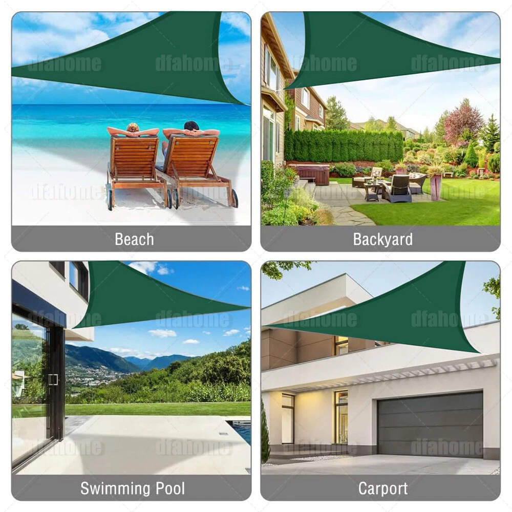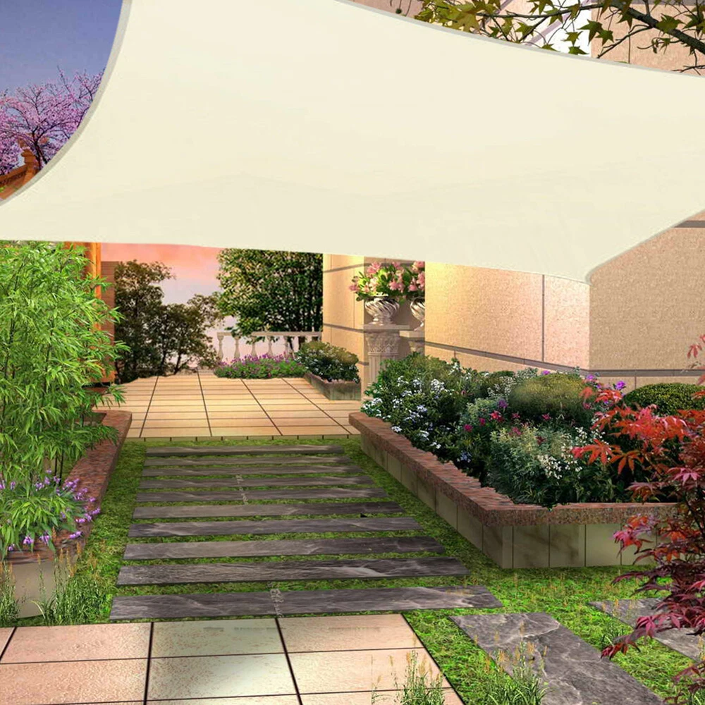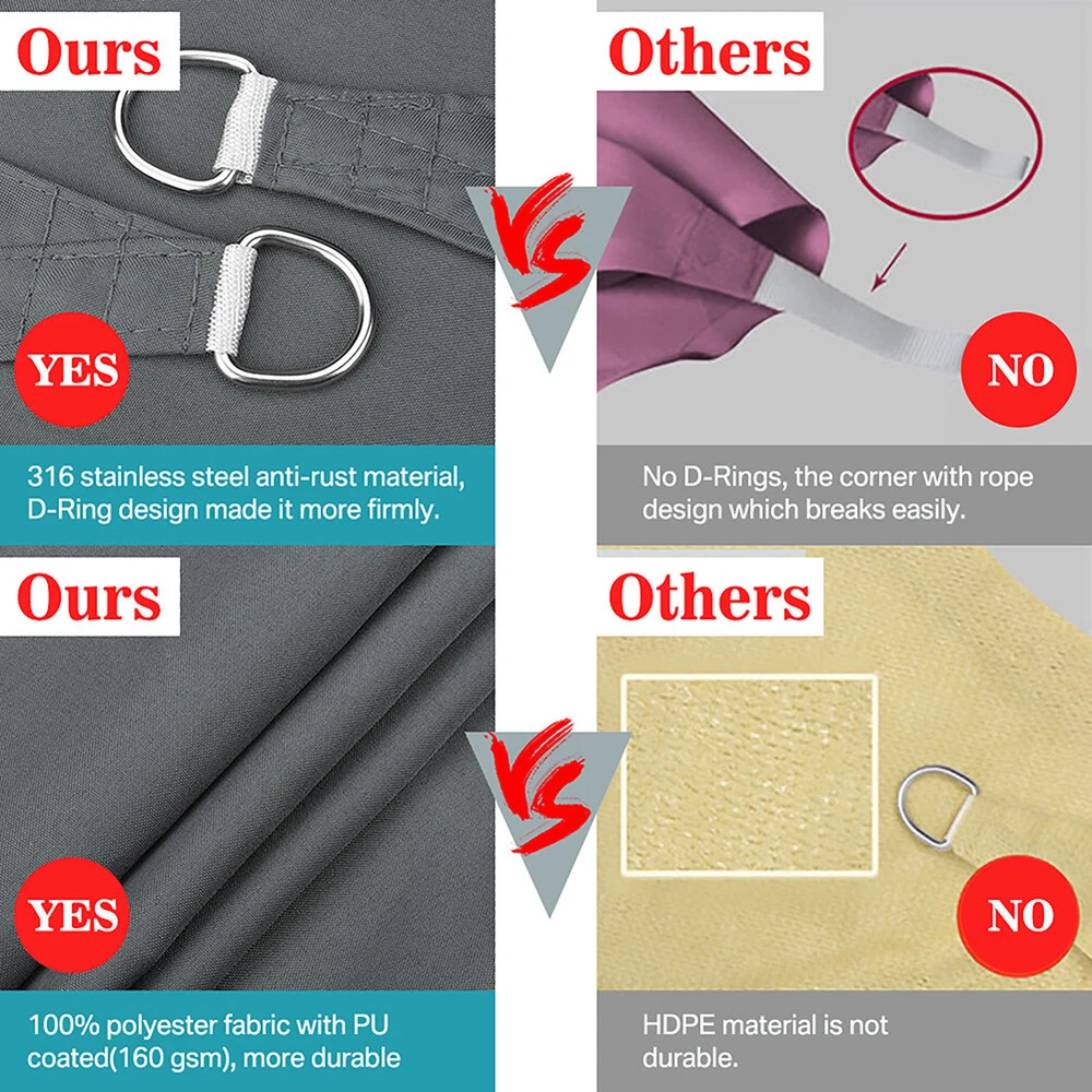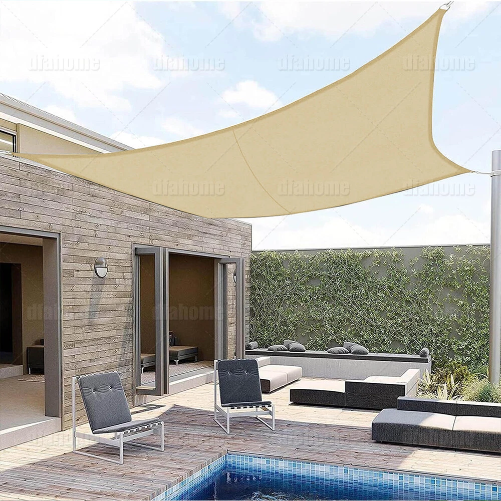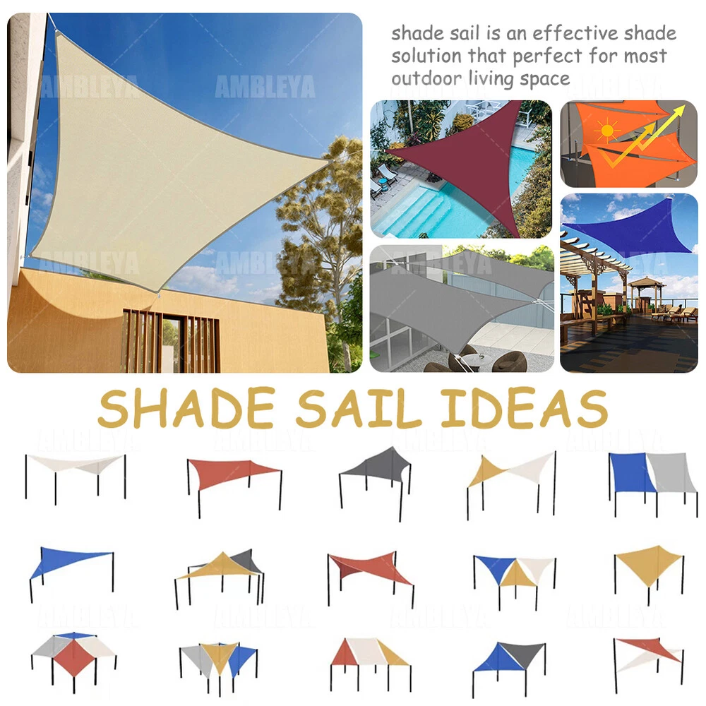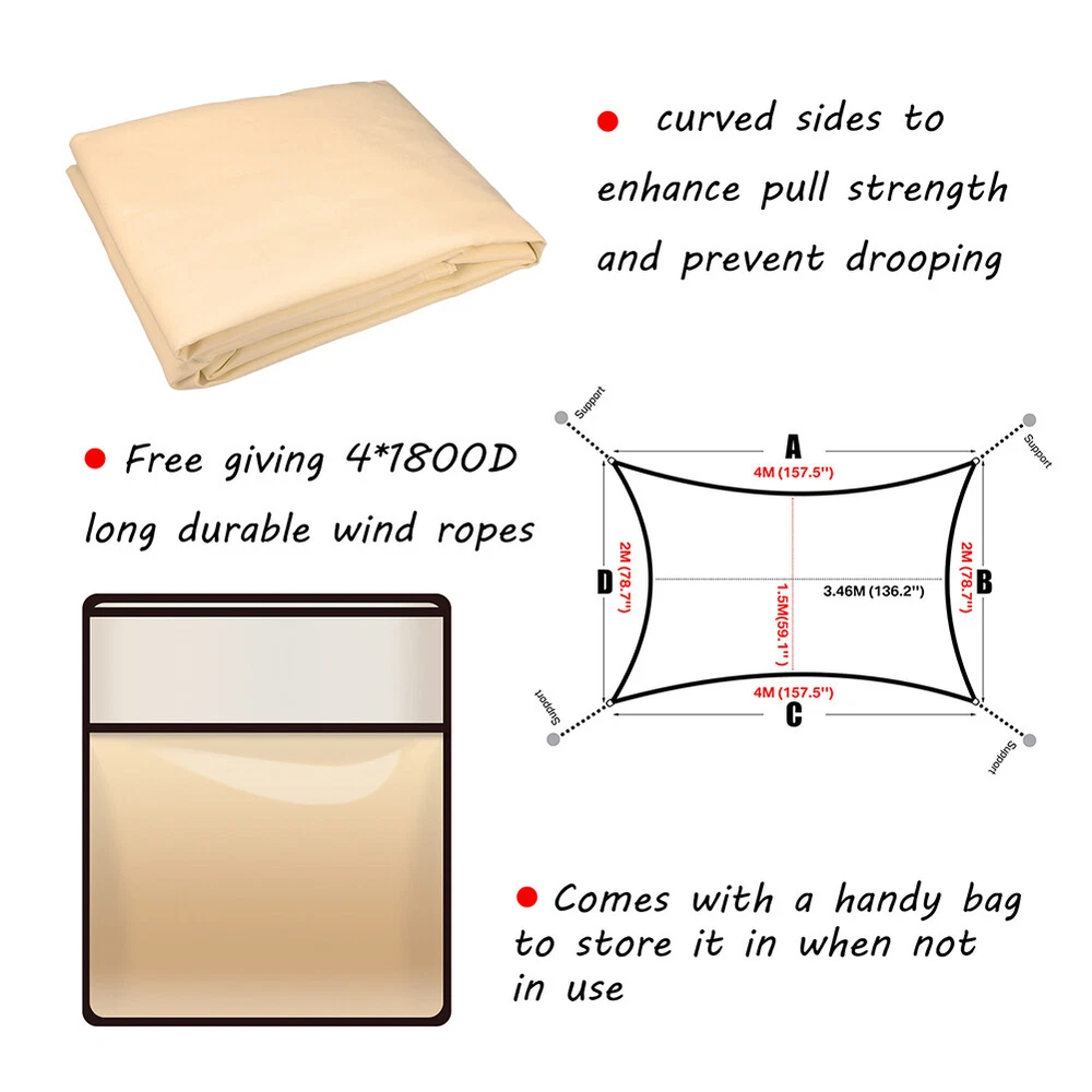Descriptions: The Waterproof Sun Shade Sails Perfect for gardens, patios, swimming pools, BBQ areas and etc. Give you a cool and comfortable experience in the hot summer. It can also create a good mood for you in Rainy days. 【WATER RESISTANT】Sun shade sail is 300D high density polyester fabric with PU coating(160 g/m²), can withstand 2000MM water pressure. It's tear resistant, waterproof and weatherproof. But we don't suggest to use shade sail in heavy rain, continuous heavy rain may cause slight water seepage. 【MULTIFUNCTIONAL & DURABLE】Double stitched edges and reinforced corners, making both sides more robust. Our solar sail is suitable to be used in garden, backyard, patio, courtyard, carport, pergolas, swimming pool, balcony, terrace, camping trip, lawn or another outdoor area. Protecting your privacy safe. 【EASY TO INSTALL】Durable anti-rust D-ring is placed at the edge of the four corners, you can use ropes or fixing kits easily to fix it. We recommend that you adjust the angle of the garden shade sail to 20-40 degrees, it needs a certain angle to drain the rain to avoid damage the product due to excessive water. 【UV PROTECTION】Our outdoor awning can block 95% harmful UV. It can provides excellent shade on sunny days/rain days, give you a wonderful space to enjoy your time. 【PAKAGE CONTAIN】You will get Awning Canopy x1, Ropes x4/3 . Specification: Type: Waterproof shade sails Material: 300D Oxford cloth Material of D-Rings: Stainless Steel Color: Grey, Cream, Beige, Orange, Blue, Anthracite, Sand, Green, Terracotta Shape: Rectangle/Triangle/Square Ropes Length : 1.5m / 4.92 ft Features: Stainless Steel D Rings, Waterproof Waterproof Materials 160 gsm high density polyester with PU coating, water and tear resistant. The material is waterproof and can be protected from water even on rainy days. The material is more sturdy, thick fabric and braided rope, good windproof effect. High Quality Materials 95% UV protection Strong and high-quality materials, can be used in sunny and rainy days, not recommended for use in bad weather UV Protect This sun shade sail has a sunscreen coating that effectively prevents UV rays, blocks the sun, and prevents tanning.95% anti-UV effect, effectively blocking UV rays. Multiple Sizes in Varied Shapes: ## Triangle Sun Shade Sails Size ## 2 x 2 x 2M / 6.56 x 6.56 x 6.56 FT 3 x 3 x 3M / 9.84 x 9.84 x 9.84 FT 3.6 x 3.6 x 3.6M / 11.81 x 11.81 x 11.81 FT 5 x 5 x 5M / 16.40 x 16.40 x 16.40 FT ## Rectangle Sun Shade Sails Size ## 2 x 3 M / 6.56 x 9.84 FT 2 x 4 M / 6.56 x 13.12 FT 3 x 4 M / 9.84 x 13.12 FT 3 x 5 M / 9.84 x 16.40 FT 4 x 5 M / 13.12 x 16.40 FT 4 x 6 M / 13.12 x 19.68 FT ## Square Sun Shade Sails Size ## 2 x 2 M / 6.56 x 6.56 FT 3 x 3 M / 9.84 x 9.84 FT 3.6 x 3.6 M / 11.81 x 11.81 FT Package include 1x Waterproof shade sail with 3/4 Ropes The edge of the shade sail is curved, and the actual use area is about 10% less than the measured area. Please purchase with cautious,thank you. 【How-To Install a Shade Sail 】 The shade sail came with D ring & Wind ropes for you to be able to make the connections to the house/trees/other structure pretty easily. If you want to strengthen the fixing, you can buy a set of hardware from our store. How-Totighten the rope after installation/Buyer's Experience Sharing From the opposite corners, I assembled the proper length of wire rope with the thimble and clamp for the end, and attached to eye bolts in the trees with a turnbuckle to tighten the span. Once I had these four anchor points established and installed, the shade sail was in the proper position and I could tighten all four anchor points to get the desired tension.