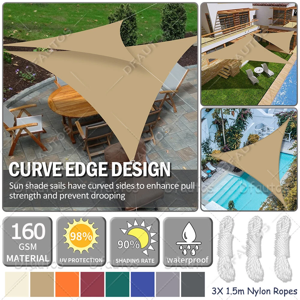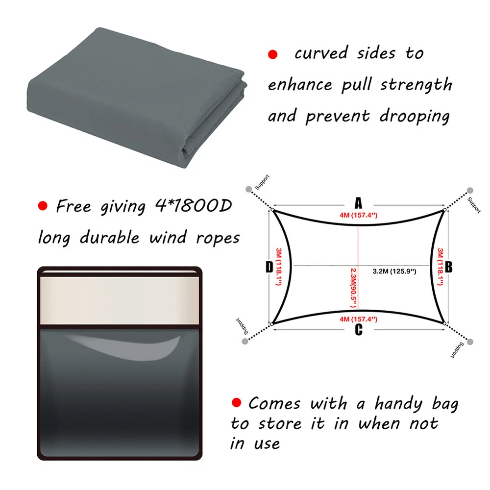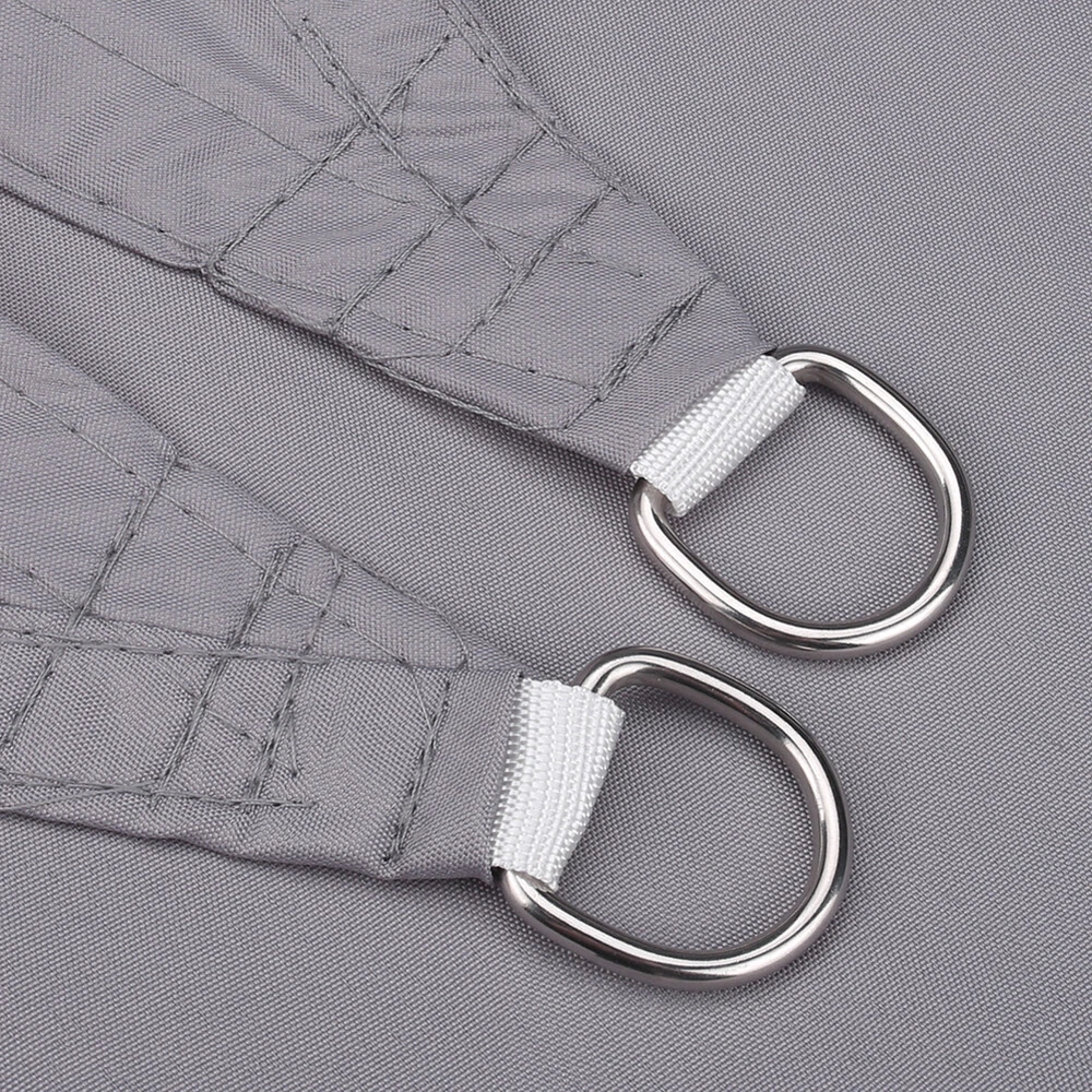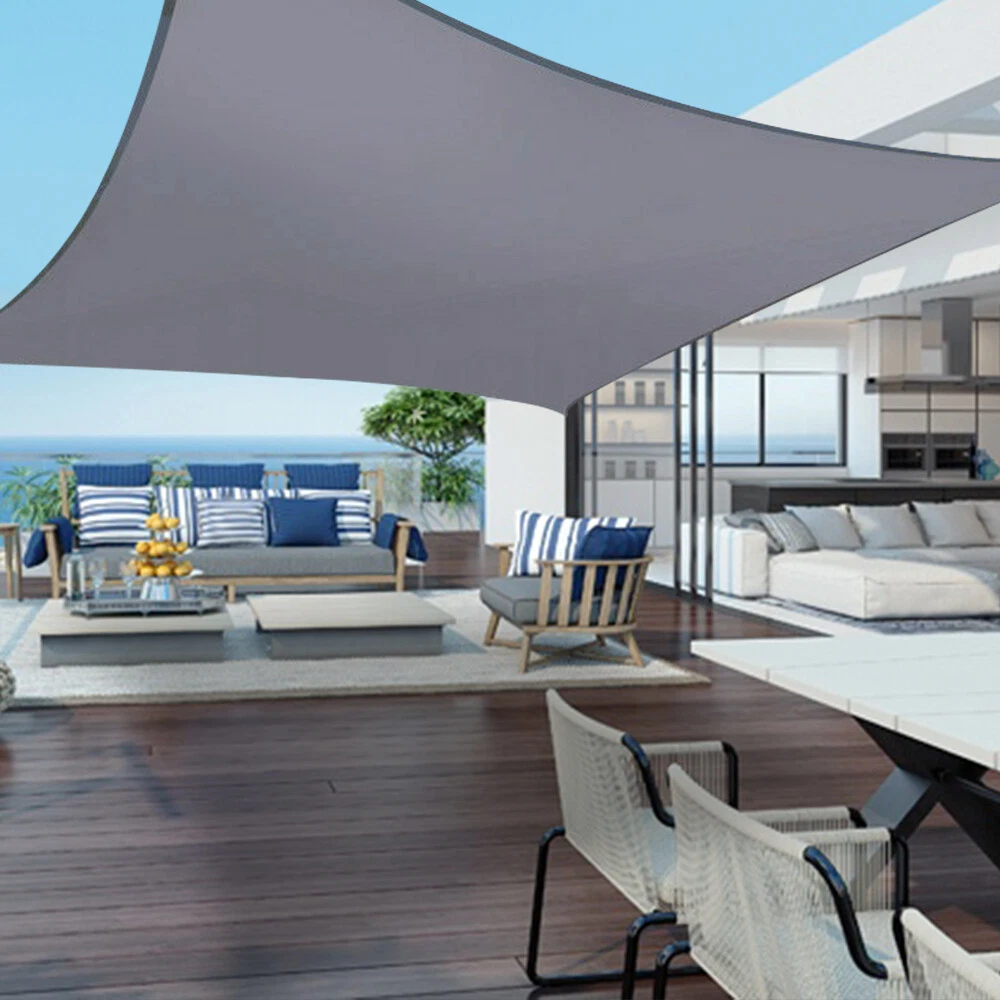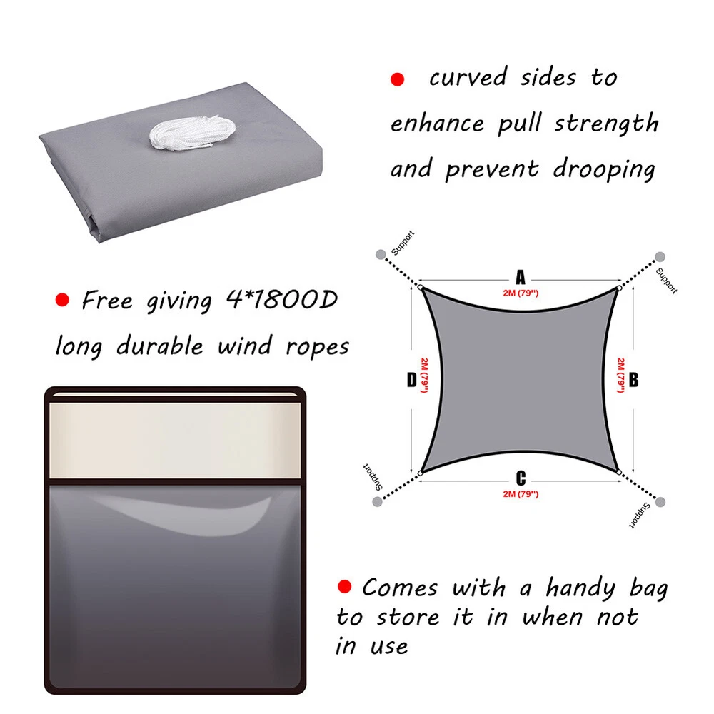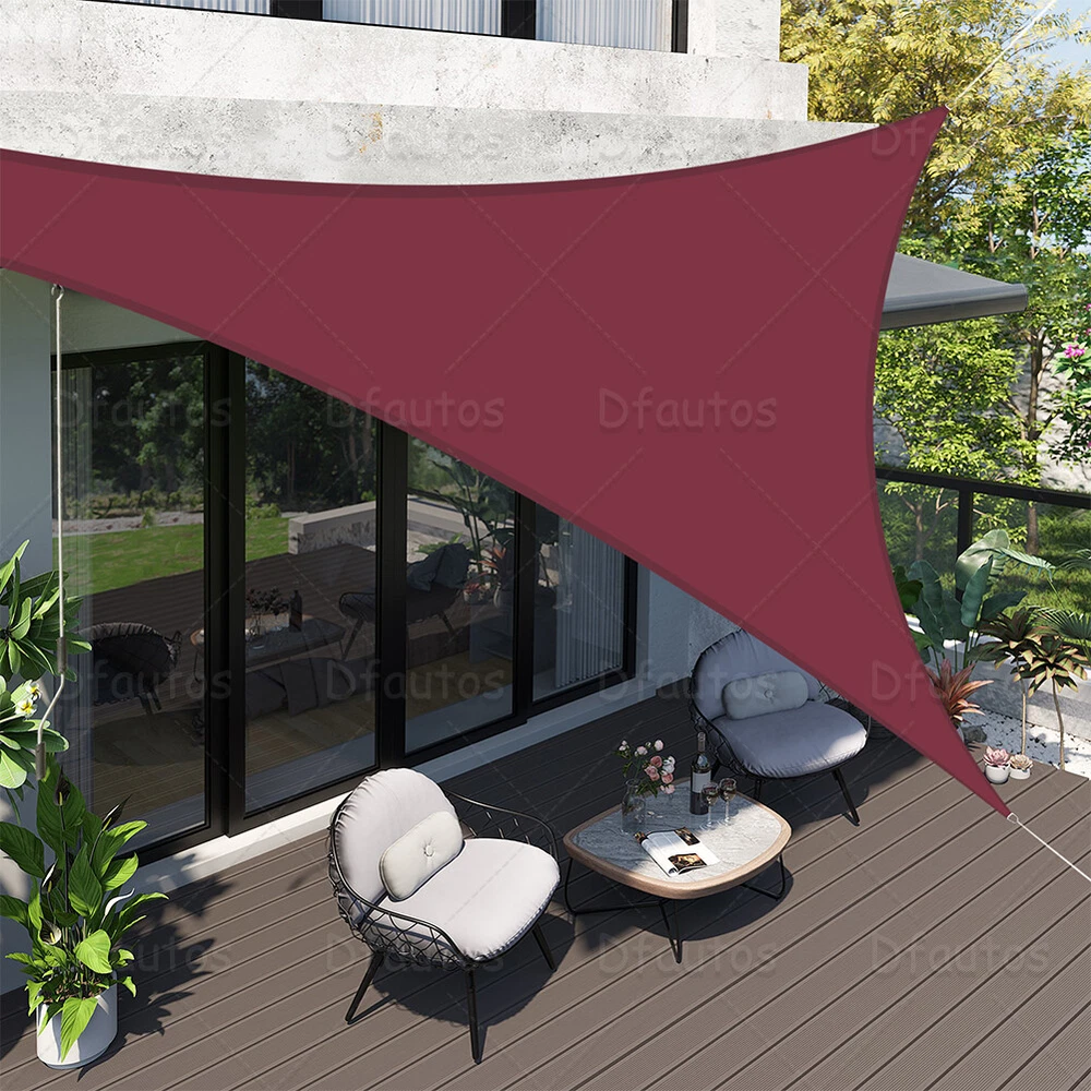 Descriptions: The Waterproof Sun Shade Sails Perfect for gardens, patios, swimming pools, BBQ areas and etc. Give you a cool and comfortable experience in the hot summer. It can also create a good mood for you in Rainy days. 【WATER RESISTANT】Sun shade sail is 300D high density polyester fabric with PU coating(160 g/m²), can withstand 2000MM water pressure. It's tear resistant, waterproof and weatherproof. But we don't suggest to use shade sail in heavy rain, continuous heavy rain may cause slight water seepage. 【MULTIFUNCTIONAL & DURABLE】Double stitched edges and reinforced corners, making both sides more robust. Our solar sail is suitable to be used in garden, backyard, patio, courtyard, carport, pergolas, swimming pool, balcony, terrace, camping trip, lawn or another outdoor area. Protecting your privacy safe. 【EASY TO INSTALL】Durable anti-rust D-ring is placed at the edge of the four corners, you can use ropes or fixing kits easily to fix it. We recommend that you adjust the angle of the garden shade sail to 20-40 degrees, it needs a certain angle to drain the rain to avoid damage the product due to excessive water. 【UV PROTECTION】Our outdoor awning can block 95% harmful UV. It can provides excellent shade on sunny days/rain days, give you a wonderful space to enjoy your time. 【PAKAGE CONTAIN】You will get Awning Canopy x1, Ropes x4/3 . Specification: Type: Waterproof shade sails Material: 300D Oxford cloth Material of D-Rings: Stainless Steel Color: Grey, Cream, Beige, Orange, Blue, Anthracite, Sand, Green, Terracotta Shape: Rectangle/Triangle/Square Ropes Length : 1.5m / 4.92 ft Features: Stainless Steel D Rings, Waterproof Waterproof Materials 160 gsm high density polyester with PU coating, water and tear resistant. The material is waterproof and can be protected from water even on rainy days. The material is more sturdy, thick fabric and braided rope, good windproof effect. High Quality Materials 95% UV protection Strong and high-quality materials, can be used in sunny and rainy days, not recommended for use in bad weather UV Protect This sun shade sail has a sunscreen coating that effectively prevents UV rays, blocks the sun, and prevents tanning.95% anti-UV effect, effectively blocking UV rays. Multiple Sizes in Varied Shapes: ## Triangle Sun Shade Sails Size ## 2 x 2 x 2M / 6.56 x 6.56 x 6.56 FT 3 x 3 x 3M / 9.84 x 9.84 x 9.84 FT 3.6 x 3.6 x 3.6M / 11.81 x 11.81 x 11.81 FT 5 x 5 x 5M / 16.40 x 16.40 x 16.40 FT ## Rectangle Sun Shade Sails Size ## 2 x 3 M / 6.56 x 9.84 FT 2 x 4 M / 6.56 x 13.12 FT 3 x 4 M / 9.84 x 13.12 FT 3 x 5 M / 9.84 x 16.40 FT 4 x 5 M / 13.12 x 16.40 FT 4 x 6 M / 13.12 x 19.68 FT ## Square Sun Shade Sails Size ## 2 x 2 M / 6.56 x 6.56 FT 3 x 3 M / 9.84 x 9.84 FT 3.6 x 3.6 M / 11.81 x 11.81 FT Package include 1x Waterproof shade sail with 3/4 Ropes The edge of the shade sail is curved, and the actual use area is about 10% less than the measured area. Please purchase with cautious,thank you. 【How-To Install a Shade Sail 】 The shade sail came with D ring & Wind ropes for you to be able to make the connections to the house/trees/other structure pretty easily. If you want to strengthen the fixing, you can buy a set of hardware from our store. How-Totighten the rope after installation/Buyer's Experience Sharing From the opposite corners, I assembled the proper length of wire rope with the thimble and clamp for the end, and attached to eye bolts in the trees with a turnbuckle to tighten the span. Once I had these four anchor points established and installed, the shade sail was in the proper position and I could tighten all four anchor points to get the desired tension.