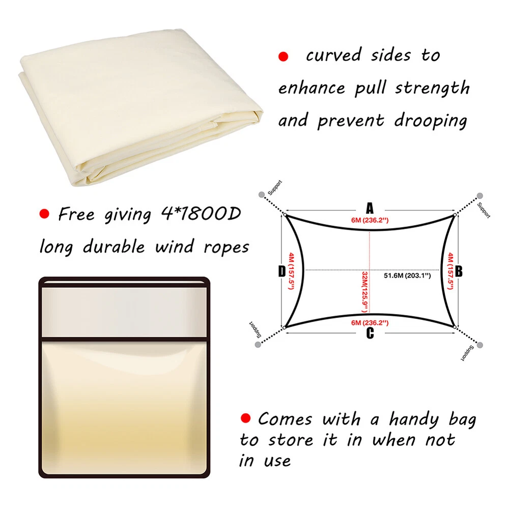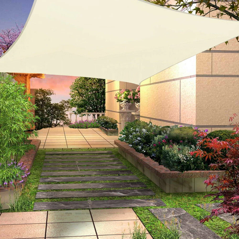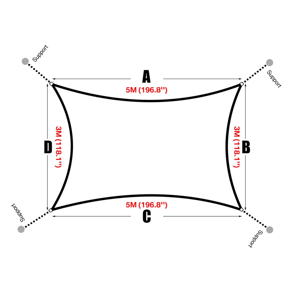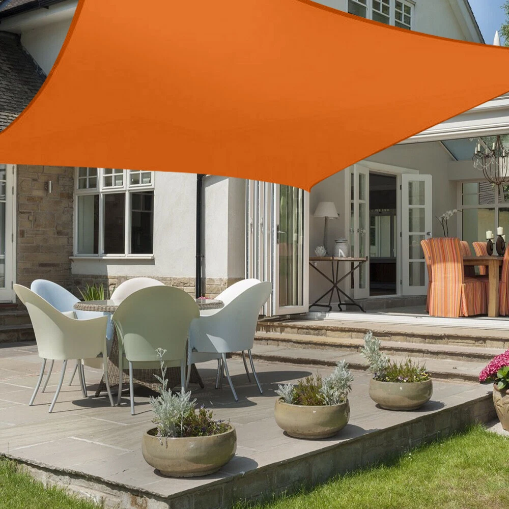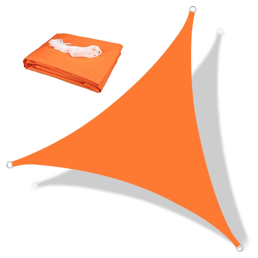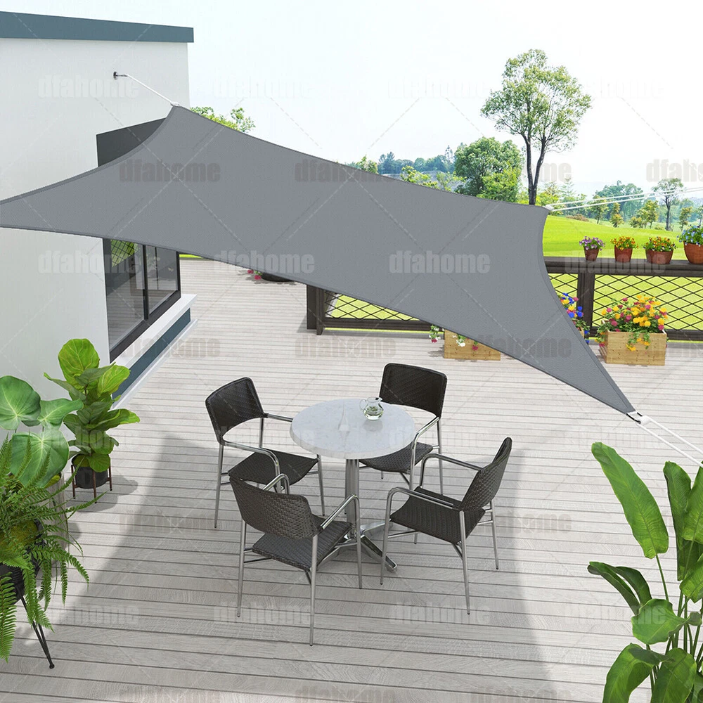 Descriptions: The Waterproof Sun Shade Sails Perfect for gardens, patios, swimming pools, BBQ areas and etc. Give you a cool and comfortable experience in the hot summer. It can also create a good mood for you in Rainy days. 【WATER RESISTANT】Sun shade sail is 300D high density polyester fabric with PU coating(160 g/m²), can withstand 2000MM water pressure. It's tear resistant, waterproof and weatherproof. But we don't suggest to use shade sail in heavy rain, continuous heavy rain may cause slight water seepage. 【MULTIFUNCTIONAL & DURABLE】Double stitched edges and reinforced corners, making both sides more robust. Our solar sail is suitable to be used in garden, backyard, patio, courtyard, carport, pergolas, swimming pool, balcony, terrace, camping trip, lawn or another outdoor area. Protecting your privacy safe. 【EASY TO INSTALL】Durable anti-rust D-ring is placed at the edge of the four corners, you can use ropes or fixing kits easily to fix it. We recommend that you adjust the angle of the garden shade sail to 20-40 degrees, it needs a certain angle to drain the rain to avoid damage the product due to excessive water. 【UV PROTECTION】Our outdoor awning can block 95% harmful UV. It can provides excellent shade on sunny days/rain days, give you a wonderful space to enjoy your time. 【PAKAGE CONTAIN】You will get Awning Canopy x1, Ropes x4/3 . Specification: Type: Waterproof shade sails Material: 300D Oxford cloth Material of D-Rings: Stainless Steel Color: Grey, Cream, Beige, Orange, Blue, Anthracite, Sand, Green, Terracotta Shape: Rectangle/Triangle/Square Ropes Length : 1.5m / 4.92 ft Features: Stainless Steel D Rings, Waterproof Waterproof Materials 160 gsm high density polyester with PU coating, water and tear resistant. The material is waterproof and can be protected from water even on rainy days. The material is more sturdy, thick fabric and braided rope, good windproof effect. High Quality Materials 95% UV protection Strong and high-quality materials, can be used in sunny and rainy days, not recommended for use in bad weather UV Protect This sun shade sail has a sunscreen coating that effectively prevents UV rays, blocks the sun, and prevents tanning.95% anti-UV effect, effectively blocking UV rays. Multiple Sizes in Varied Shapes: ## Triangle Sun Shade Sails Size ## 2 x 2 x 2M / 6.56 x 6.56 x 6.56 FT 3 x 3 x 3M / 9.84 x 9.84 x 9.84 FT 3.6 x 3.6 x 3.6M / 11.81 x 11.81 x 11.81 FT 5 x 5 x 5M / 16.40 x 16.40 x 16.40 FT ## Rectangle Sun Shade Sails Size ## 2 x 3 M / 6.56 x 9.84 FT 2 x 4 M / 6.56 x 13.12 FT 3 x 4 M / 9.84 x 13.12 FT 3 x 5 M / 9.84 x 16.40 FT 4 x 5 M / 13.12 x 16.40 FT 4 x 6 M / 13.12 x 19.68 FT ## Square Sun Shade Sails Size ## 2 x 2 M / 6.56 x 6.56 FT 3 x 3 M / 9.84 x 9.84 FT 3.6 x 3.6 M / 11.81 x 11.81 FT Package include 1x Waterproof shade sail with 3/4 Ropes The edge of the shade sail is curved, and the actual use area is about 10% less than the measured area. Please purchase with cautious,thank you. 【How-To Install a Shade Sail 】 The shade sail came with D ring & Wind ropes for you to be able to make the connections to the house/trees/other structure pretty easily. If you want to strengthen the fixing, you can buy a set of hardware from our store. How-Totighten the rope after installation/Buyer's Experience Sharing From the opposite corners, I assembled the proper length of wire rope with the thimble and clamp for the end, and attached to eye bolts in the trees with a turnbuckle to tighten the span. Once I had these four anchor points established and installed, the shade sail was in the proper position and I could tighten all four anchor points to get the desired tension.