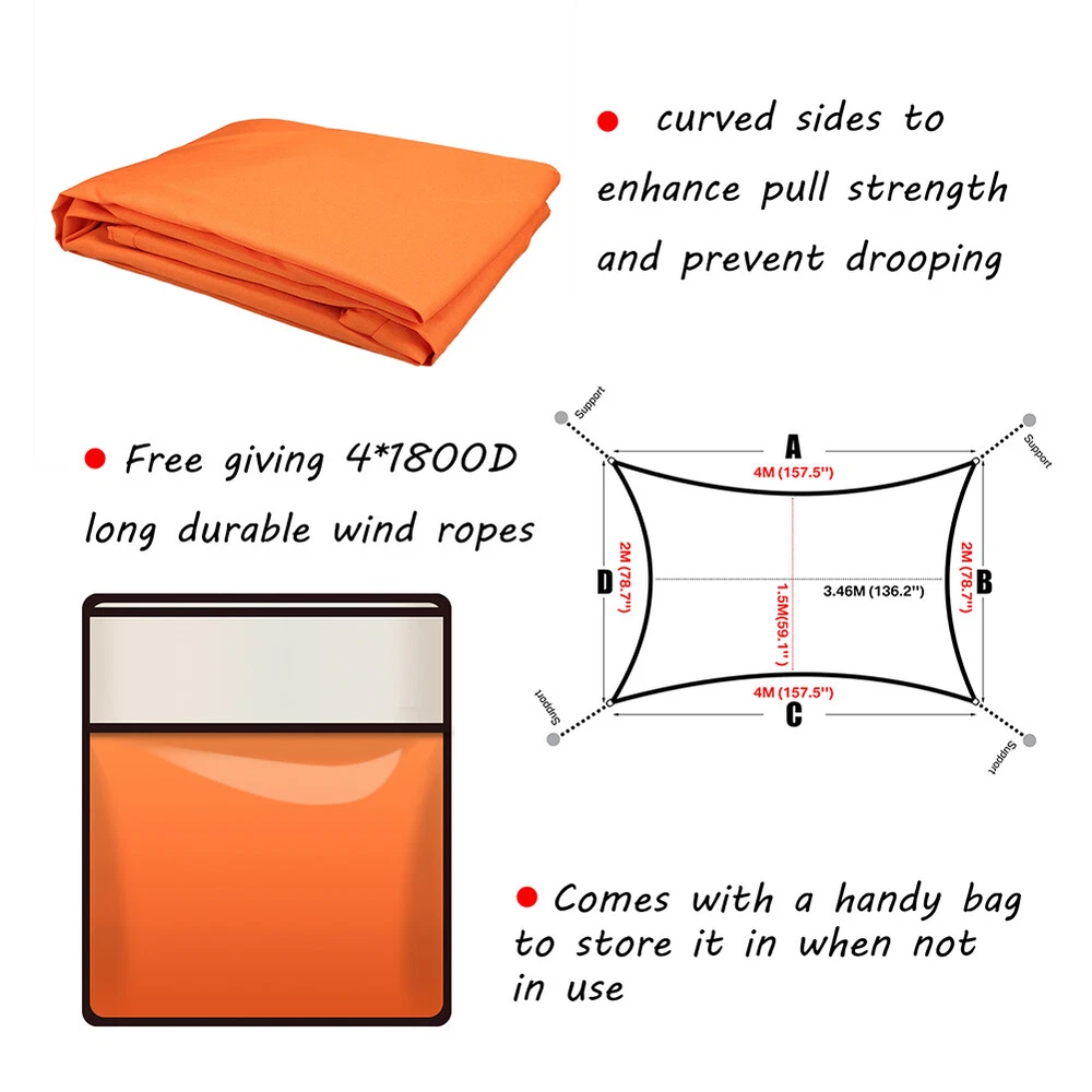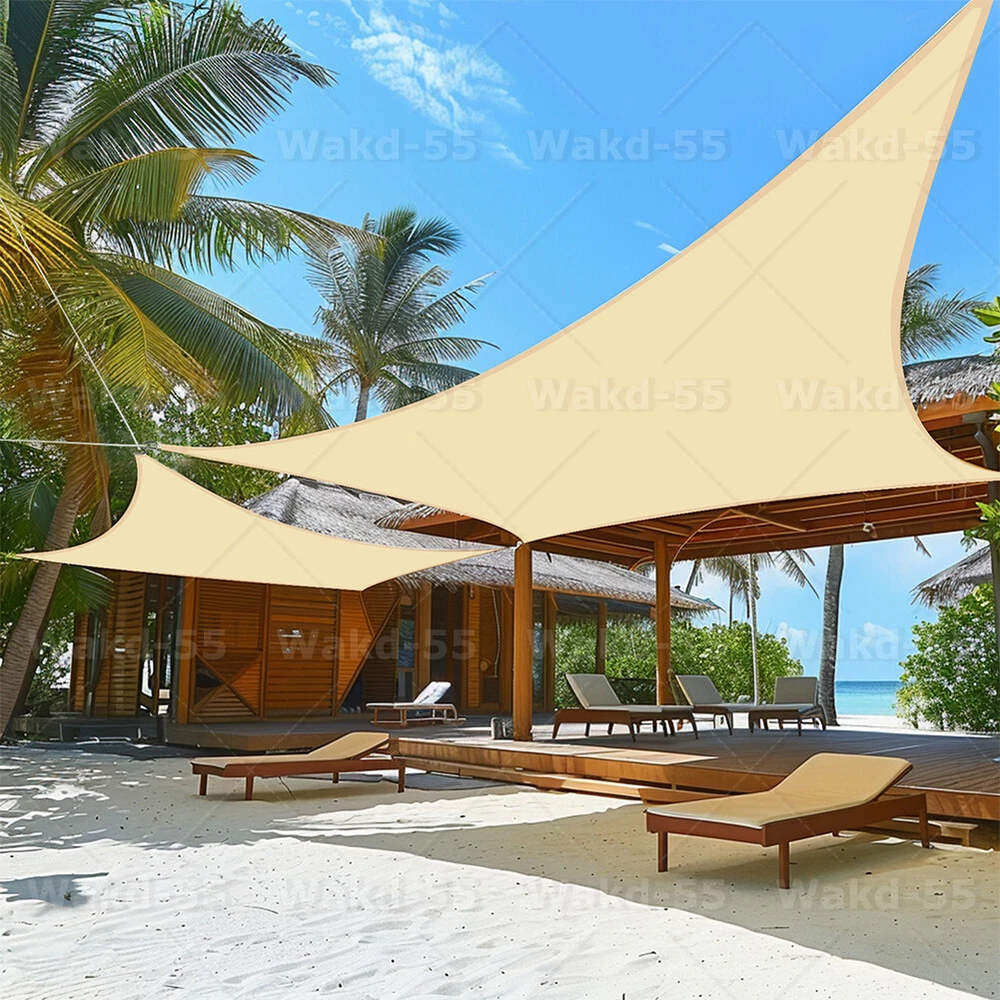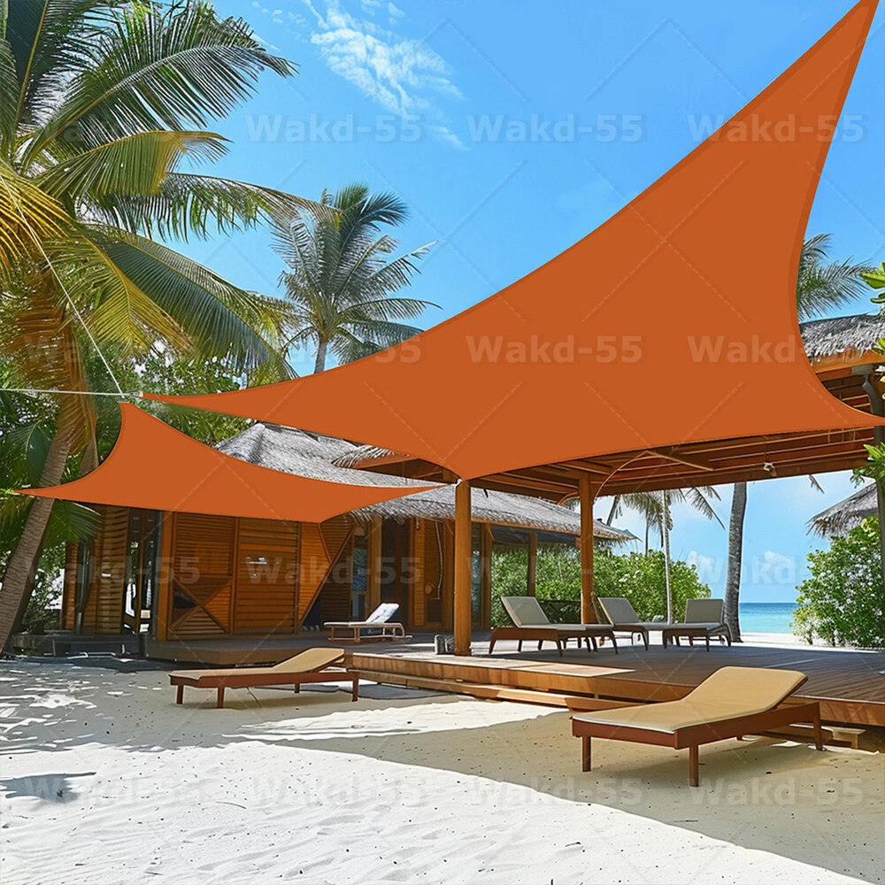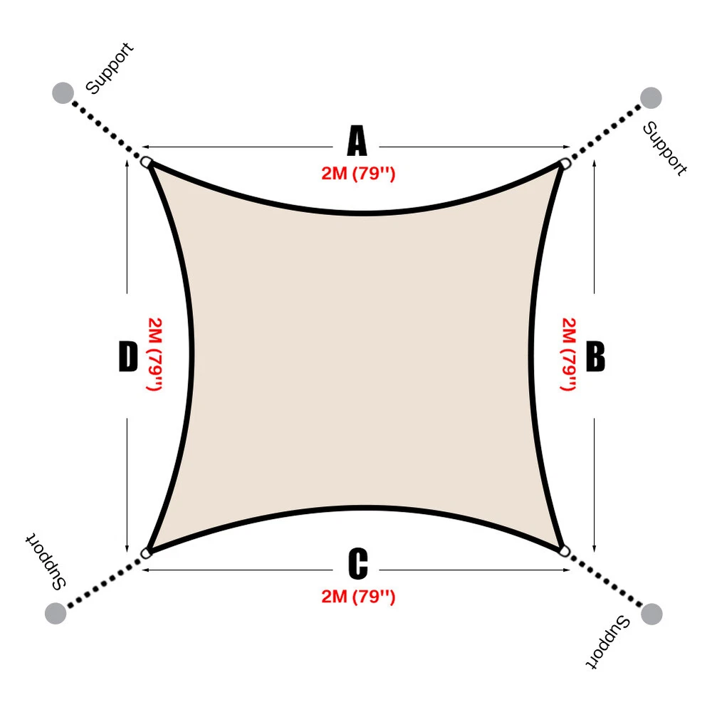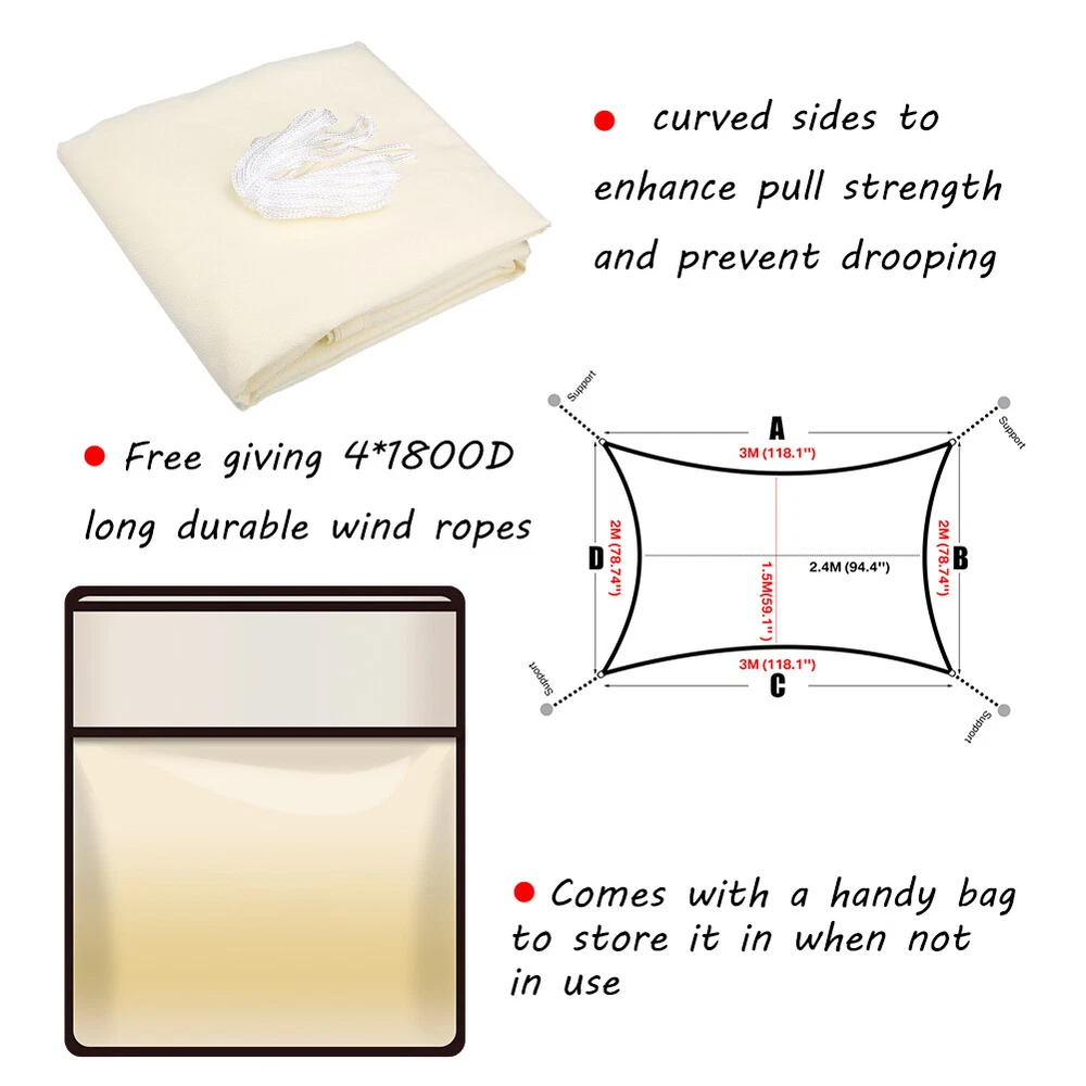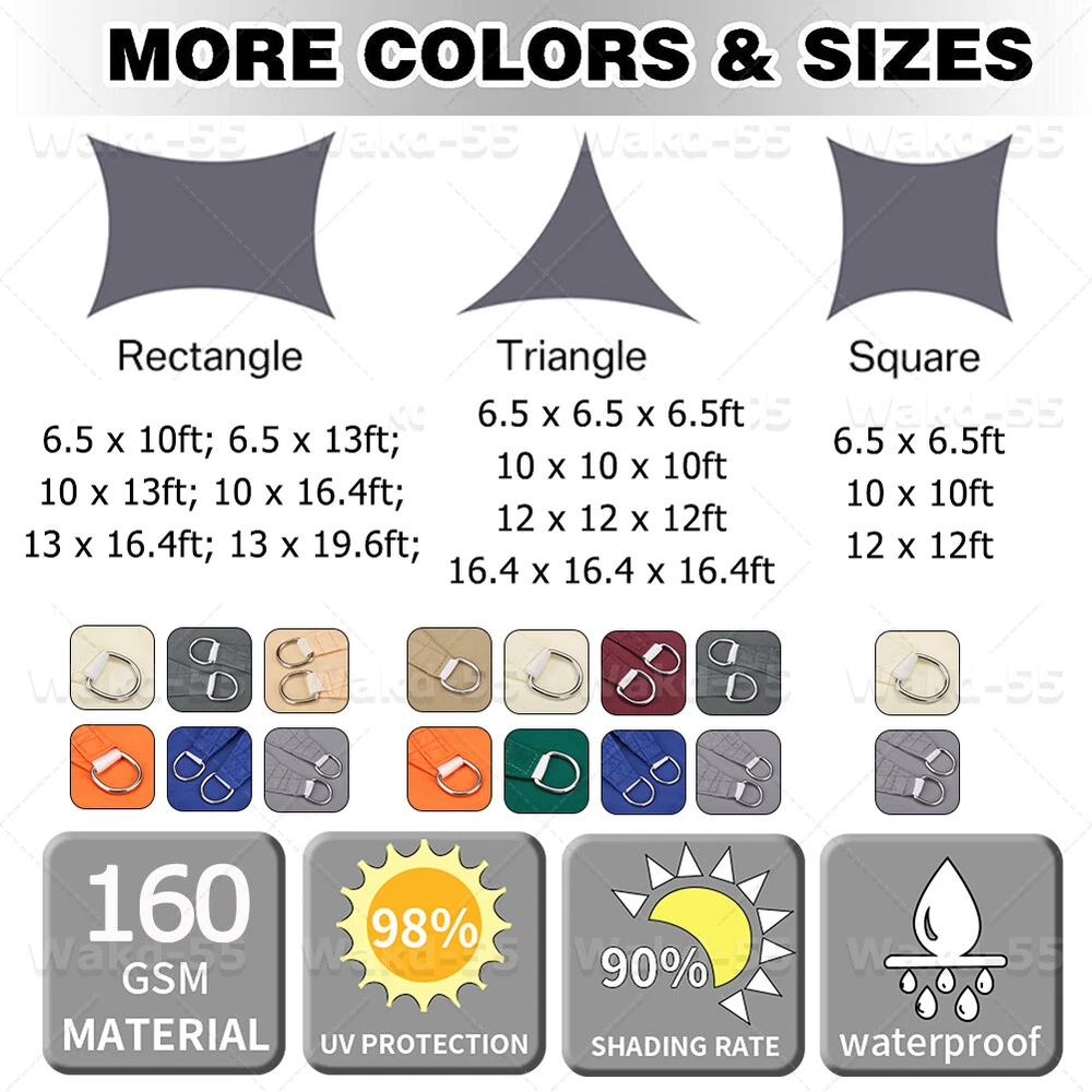 Descriptions: The Waterproof Sun Shade Sails Perfect for gardens, patios, swimming pools, BBQ areas and etc. Give you a cool and comfortable experience in the hot summer. It can also create a good mood for you in Rainy days. 【WATER RESISTANT】Sun shade sail is 300D high density polyester fabric with PU coating(160 g/m²), can withstand 2000MM water pressure. It's tear resistant, waterproof and weatherproof. But we don't suggest to use shade sail in heavy rain, continuous heavy rain may cause slight water seepage. 【MULTIFUNCTIONAL & DURABLE】Double stitched edges and reinforced corners, making both sides more robust. Our solar sail is suitable to be used in garden, backyard, patio, courtyard, carport, pergolas, swimming pool, balcony, terrace, camping trip, lawn or another outdoor area. Protecting your privacy safe. 【EASY TO INSTALL】Durable anti-rust D-ring is placed at the edge of the four corners, you can use ropes or fixing kits easily to fix it. We recommend that you adjust the angle of the garden shade sail to 20-40 degrees, it needs a certain angle to drain the rain to avoid damage the product due to excessive water. 【UV PROTECTION】Our outdoor awning can block 95% harmful UV. It can provides excellent shade on sunny days/rain days, give you a wonderful space to enjoy your time. 【PAKAGE CONTAIN】You will get Awning Canopy x1, Ropes x4/3 . Specification: Type: Waterproof shade sails Material: 300D Oxford cloth Material of D-Rings: Stainless Steel Color: Grey, Cream, Beige, Orange, Blue, Anthracite, Sand, Green, Terracotta Shape: Rectangle/Triangle/Square Ropes Length : 1.5m / 4.92 ft Features: Stainless Steel D Rings, Waterproof Waterproof Materials 160 gsm high density polyester with PU coating, water and tear resistant. The material is waterproof and can be protected from water even on rainy days. The material is more sturdy, thick fabric and braided rope, good windproof effect. High Quality Materials 95% UV protection Strong and high-quality materials, can be used in sunny and rainy days, not recommended for use in bad weather UV Protect This sun shade sail has a sunscreen coating that effectively prevents UV rays, blocks the sun, and prevents tanning.95% anti-UV effect, effectively blocking UV rays. Multiple Sizes in Varied Shapes: ## Triangle Sun Shade Sails Size ## 2 x 2 x 2M / 6.56 x 6.56 x 6.56 FT 3 x 3 x 3M / 9.84 x 9.84 x 9.84 FT 3.6 x 3.6 x 3.6M / 11.81 x 11.81 x 11.81 FT 5 x 5 x 5M / 16.40 x 16.40 x 16.40 FT ## Rectangle Sun Shade Sails Size ## 2 x 3 M / 6.56 x 9.84 FT 2 x 4 M / 6.56 x 13.12 FT 3 x 4 M / 9.84 x 13.12 FT 3 x 5 M / 9.84 x 16.40 FT 4 x 5 M / 13.12 x 16.40 FT 4 x 6 M / 13.12 x 19.68 FT ## Square Sun Shade Sails Size ## 2 x 2 M / 6.56 x 6.56 FT 3 x 3 M / 9.84 x 9.84 FT 3.6 x 3.6 M / 11.81 x 11.81 FT Package include 1x Waterproof shade sail with 3/4 Ropes The edge of the shade sail is curved, and the actual use area is about 10% less than the measured area. Please purchase with cautious,thank you. 【How-To Install a Shade Sail 】 The shade sail came with D ring & Wind ropes for you to be able to make the connections to the house/trees/other structure pretty easily. If you want to strengthen the fixing, you can buy a set of hardware from our store. How-Totighten the rope after installation/Buyer's Experience Sharing From the opposite corners, I assembled the proper length of wire rope with the thimble and clamp for the end, and attached to eye bolts in the trees with a turnbuckle to tighten the span. Once I had these four anchor points established and installed, the shade sail was in the proper position and I could tighten all four anchor points to get the desired tension.