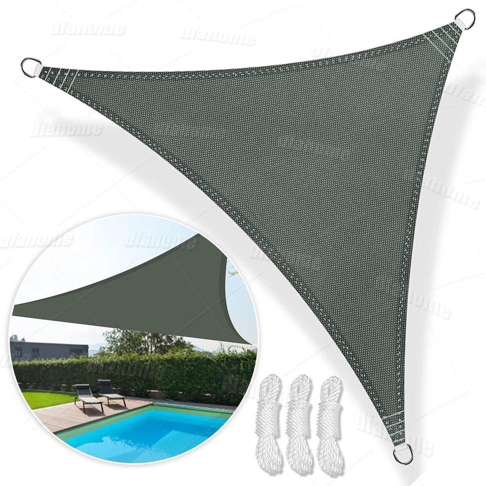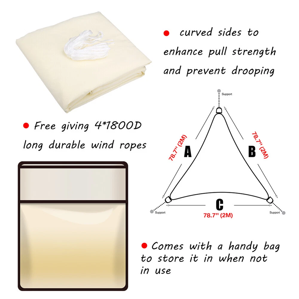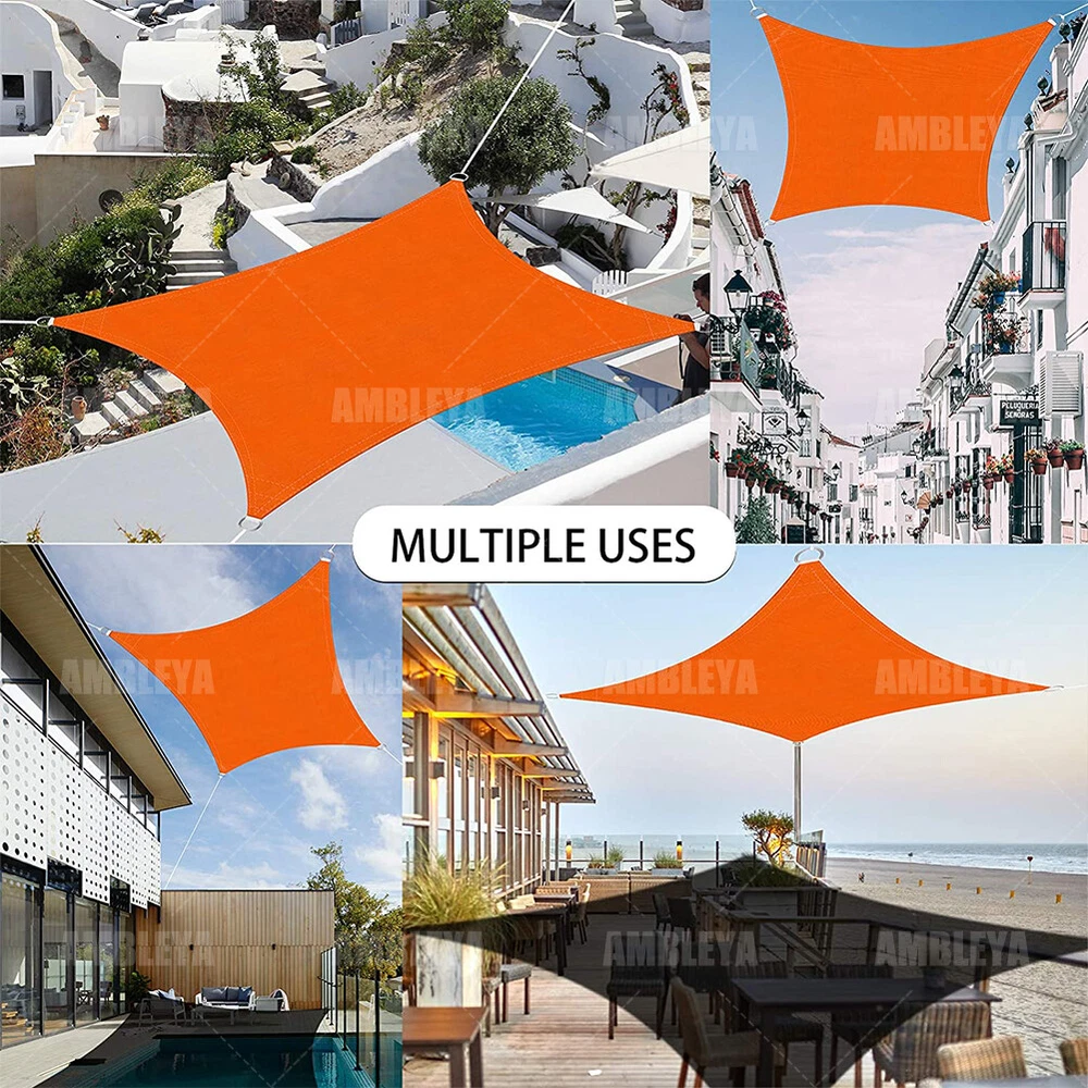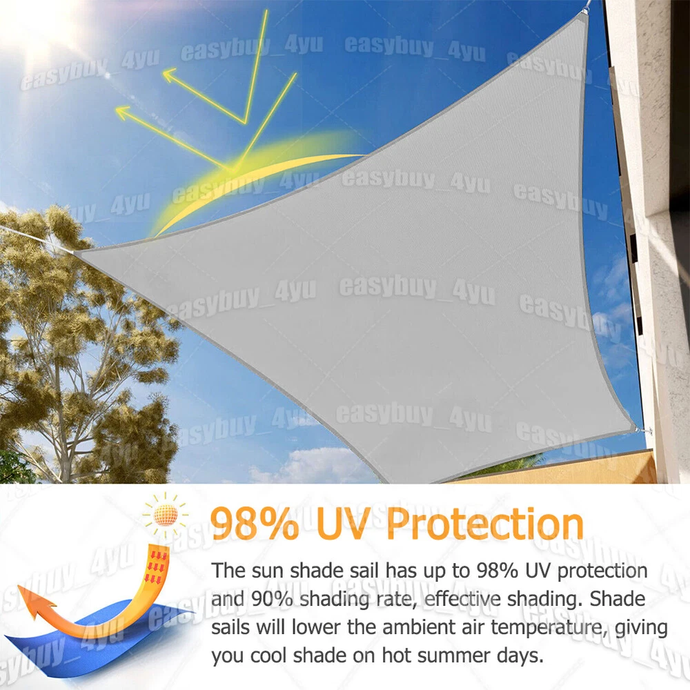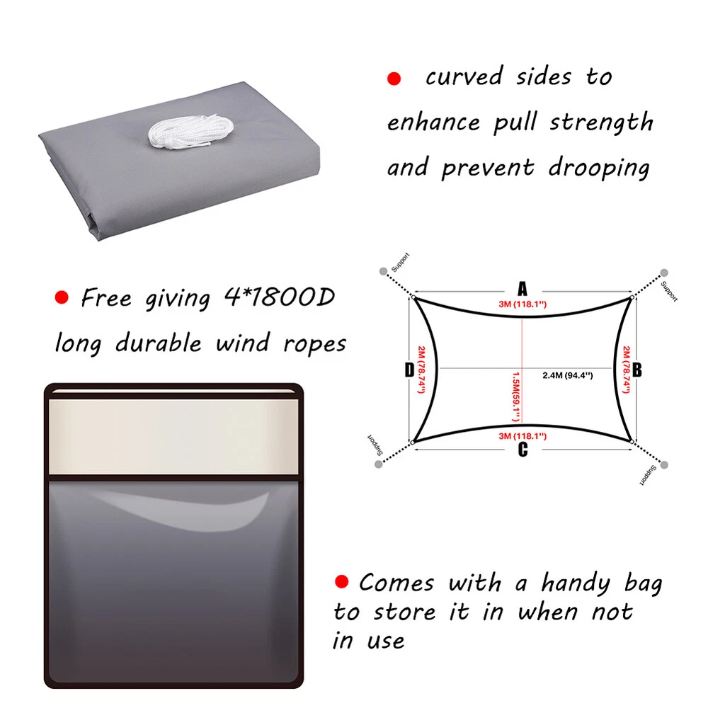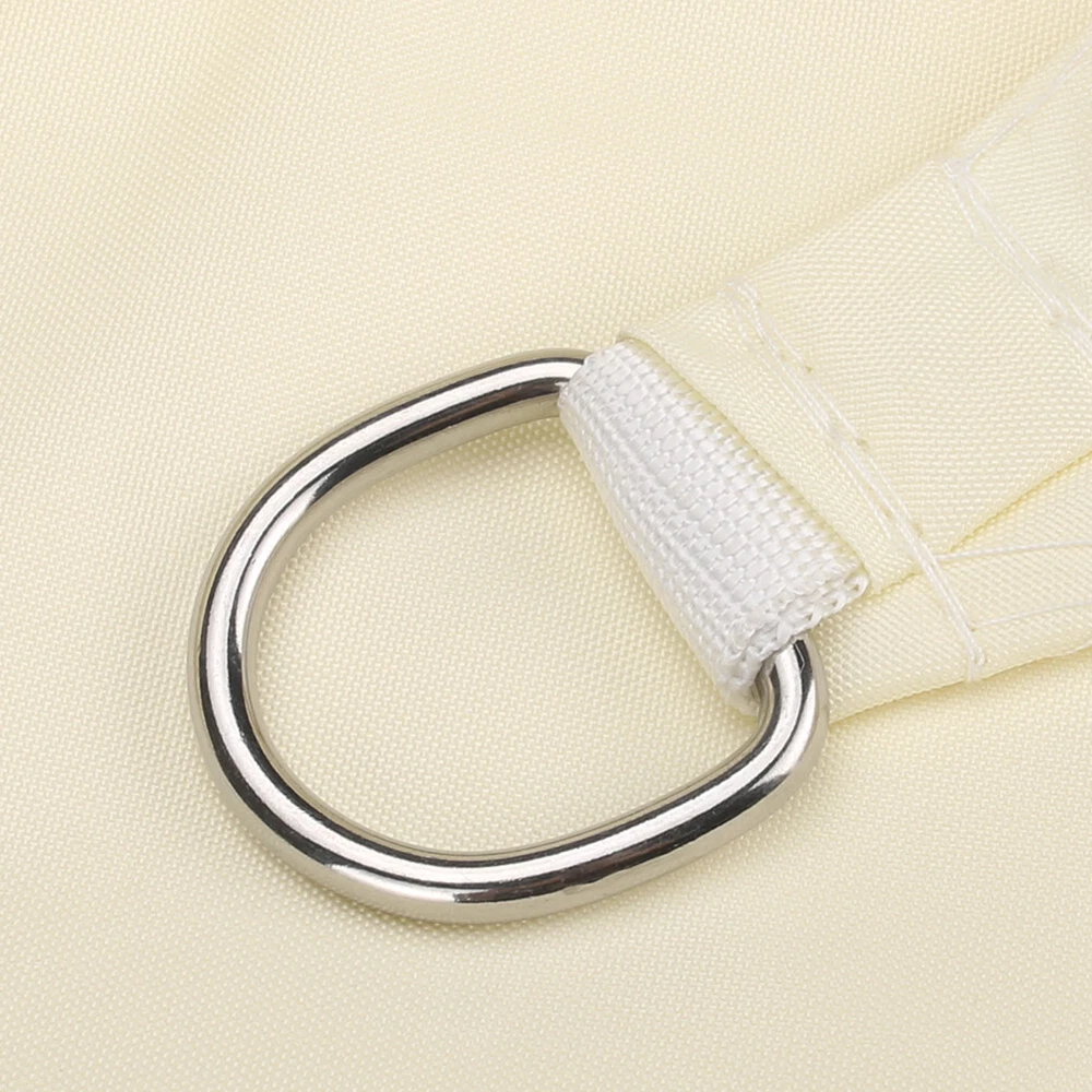 Descriptions: The Waterproof Sun Shade Sails Perfect for gardens, patios, swimming pools, BBQ areas and etc. Give you a cool and comfortable experience in the hot summer. It can also create a good mood for you in Rainy days. 【WATER RESISTANT】Sun shade sail is 300D high density polyester fabric with PU coating(160 g/m²), can withstand 2000MM water pressure. It's tear resistant, waterproof and weatherproof. But we don't suggest to use shade sail in heavy rain, continuous heavy rain may cause slight water seepage. 【MULTIFUNCTIONAL & DURABLE】Double stitched edges and reinforced corners, making both sides more robust. Our solar sail is suitable to be used in garden, backyard, patio, courtyard, carport, pergolas, swimming pool, balcony, terrace, camping trip, lawn or another outdoor area. Protecting your privacy safe. 【EASY TO INSTALL】Durable anti-rust D-ring is placed at the edge of the four corners, you can use ropes or fixing kits easily to fix it. We recommend that you adjust the angle of the garden shade sail to 20-40 degrees, it needs a certain angle to drain the rain to avoid damage the product due to excessive water. 【UV PROTECTION】Our outdoor awning can block 95% harmful UV. It can provides excellent shade on sunny days/rain days, give you a wonderful space to enjoy your time. 【PAKAGE CONTAIN】You will get Awning Canopy x1, Ropes x4/3 . Specification: Type: Waterproof shade sails Material: 300D Oxford cloth Material of D-Rings: Stainless Steel Color: Grey, Cream, Beige, Orange, Blue, Anthracite, Sand, Green, Terracotta Shape: Rectangle/Triangle/Square Ropes Length : 1.5m / 4.92 ft Features: Stainless Steel D Rings, Waterproof Waterproof Materials 160 gsm high density polyester with PU coating, water and tear resistant. The material is waterproof and can be protected from water even on rainy days. The material is more sturdy, thick fabric and braided rope, good windproof effect. High Quality Materials 95% UV protection Strong and high-quality materials, can be used in sunny and rainy days, not recommended for use in bad weather UV Protect This sun shade sail has a sunscreen coating that effectively prevents UV rays, blocks the sun, and prevents tanning.95% anti-UV effect, effectively blocking UV rays. Multiple Sizes in Varied Shapes: ## Triangle Sun Shade Sails Size ## 2 x 2 x 2M / 6.56 x 6.56 x 6.56 FT 3 x 3 x 3M / 9.84 x 9.84 x 9.84 FT 3.6 x 3.6 x 3.6M / 11.81 x 11.81 x 11.81 FT 5 x 5 x 5M / 16.40 x 16.40 x 16.40 FT ## Rectangle Sun Shade Sails Size ## 2 x 3 M / 6.56 x 9.84 FT 2 x 4 M / 6.56 x 13.12 FT 3 x 4 M / 9.84 x 13.12 FT 3 x 5 M / 9.84 x 16.40 FT 4 x 5 M / 13.12 x 16.40 FT 4 x 6 M / 13.12 x 19.68 FT ## Square Sun Shade Sails Size ## 2 x 2 M / 6.56 x 6.56 FT 3 x 3 M / 9.84 x 9.84 FT 3.6 x 3.6 M / 11.81 x 11.81 FT Package include 1x Waterproof shade sail with 3/4 Ropes The edge of the shade sail is curved, and the actual use area is about 10% less than the measured area. Please purchase with cautious,thank you. 【How-To Install a Shade Sail 】 The shade sail came with D ring & Wind ropes for you to be able to make the connections to the house/trees/other structure pretty easily. If you want to strengthen the fixing, you can buy a set of hardware from our store. How-Totighten the rope after installation/Buyer's Experience Sharing From the opposite corners, I assembled the proper length of wire rope with the thimble and clamp for the end, and attached to eye bolts in the trees with a turnbuckle to tighten the span. Once I had these four anchor points established and installed, the shade sail was in the proper position and I could tighten all four anchor points to get the desired tension.