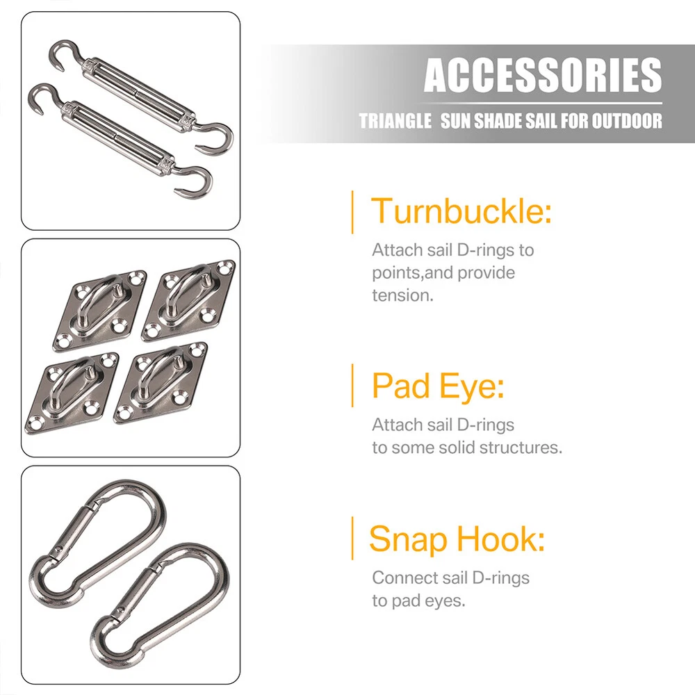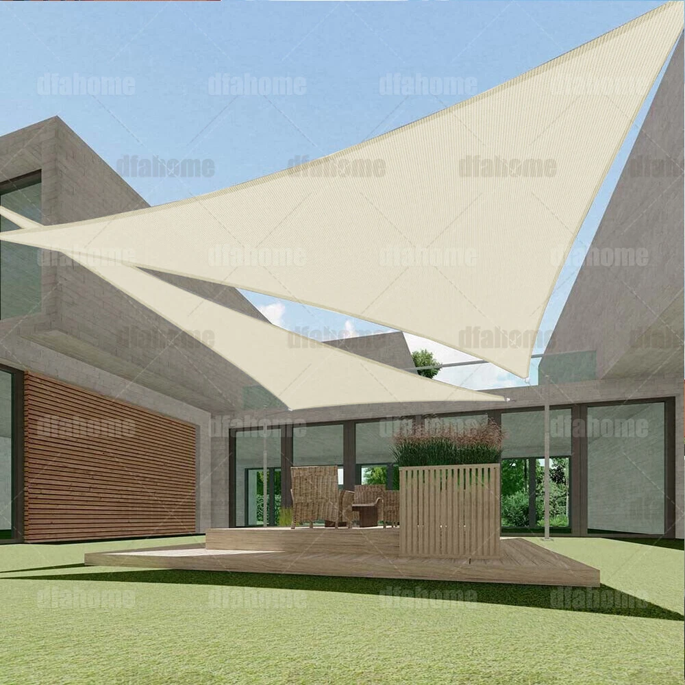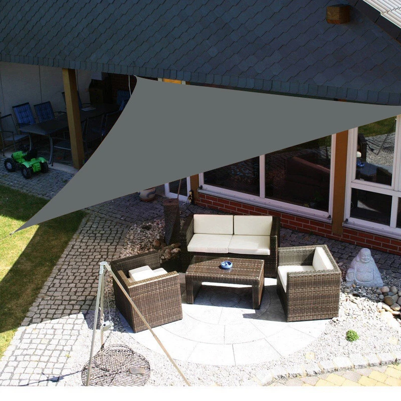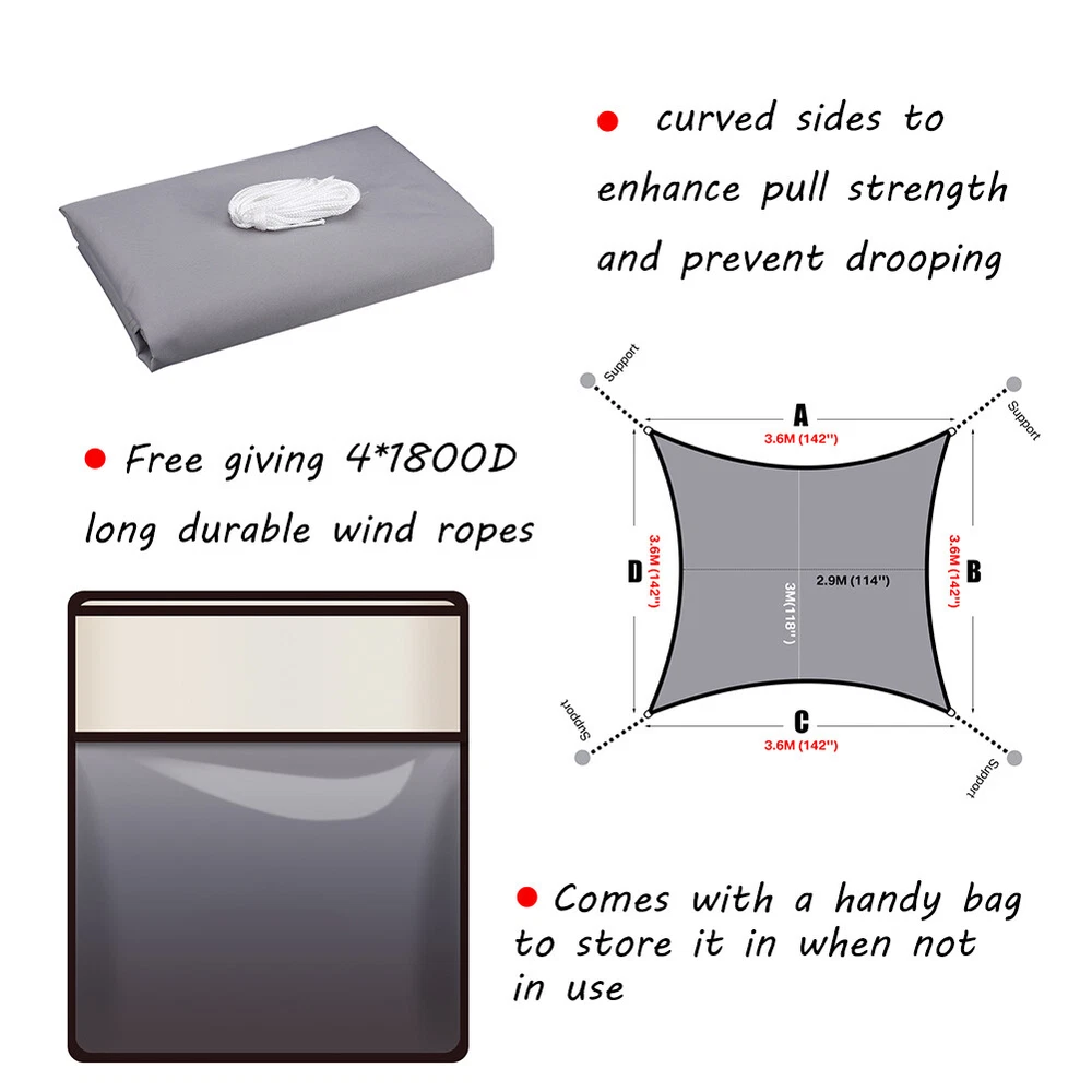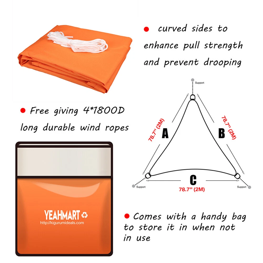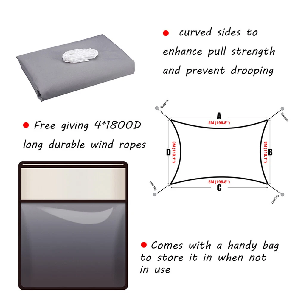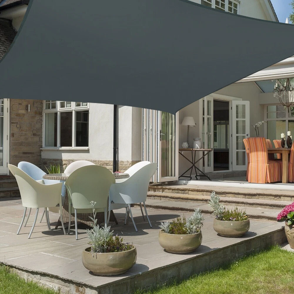 Descriptions: The Waterproof Sun Shade Sails Perfect for gardens, patios, swimming pools, BBQ areas and etc. Give you a cool and comfortable experience in the hot summer. It can also create a good mood for you in Rainy days. 【WATER RESISTANT】Sun shade sail is 300D high density polyester fabric with PU coating(160 g/m²), can withstand 2000MM water pressure. It's tear resistant, waterproof and weatherproof. But we don't suggest to use shade sail in heavy rain, continuous heavy rain may cause slight water seepage. 【MULTIFUNCTIONAL & DURABLE】Double stitched edges and reinforced corners, making both sides more robust. Our solar sail is suitable to be used in garden, backyard, patio, courtyard, carport, pergolas, swimming pool, balcony, terrace, camping trip, lawn or another outdoor area. Protecting your privacy safe. 【EASY TO INSTALL】Durable anti-rust D-ring is placed at the edge of the four corners, you can use ropes or fixing kits easily to fix it. We recommend that you adjust the angle of the garden shade sail to 20-40 degrees, it needs a certain angle to drain the rain to avoid damage the product due to excessive water. 【UV PROTECTION】Our outdoor awning can block 95% harmful UV. It can provides excellent shade on sunny days/rain days, give you a wonderful space to enjoy your time. 【PAKAGE CONTAIN】You will get Awning Canopy x1, Ropes x4/3 . Specification: Type: Waterproof shade sails Material: 300D Oxford cloth Material of D-Rings: Stainless Steel Color: Grey, Cream, Beige, Orange, Blue, Anthracite, Sand, Green, Terracotta Shape: Rectangle/Triangle/Square Ropes Length : 1.5m / 4.92 ft Features: Stainless Steel D Rings, Waterproof Waterproof Materials 160 gsm high density polyester with PU coating, water and tear resistant. The material is waterproof and can be protected from water even on rainy days. The material is more sturdy, thick fabric and braided rope, good windproof effect. High Quality Materials 95% UV protection Strong and high-quality materials, can be used in sunny and rainy days, not recommended for use in bad weather UV Protect This sun shade sail has a sunscreen coating that effectively prevents UV rays, blocks the sun, and prevents tanning.95% anti-UV effect, effectively blocking UV rays. Multiple Sizes in Varied Shapes: ## Triangle Sun Shade Sails Size ## 2 x 2 x 2M / 6.56 x 6.56 x 6.56 FT 3 x 3 x 3M / 9.84 x 9.84 x 9.84 FT 3.6 x 3.6 x 3.6M / 11.81 x 11.81 x 11.81 FT 5 x 5 x 5M / 16.40 x 16.40 x 16.40 FT ## Rectangle Sun Shade Sails Size ## 2 x 3 M / 6.56 x 9.84 FT 2 x 4 M / 6.56 x 13.12 FT 3 x 4 M / 9.84 x 13.12 FT 3 x 5 M / 9.84 x 16.40 FT 4 x 5 M / 13.12 x 16.40 FT 4 x 6 M / 13.12 x 19.68 FT ## Square Sun Shade Sails Size ## 2 x 2 M / 6.56 x 6.56 FT 3 x 3 M / 9.84 x 9.84 FT 3.6 x 3.6 M / 11.81 x 11.81 FT Package include 1x Waterproof shade sail with 3/4 Ropes The edge of the shade sail is curved, and the actual use area is about 10% less than the measured area. Please purchase with cautious,thank you. 【How-To Install a Shade Sail 】 The shade sail came with D ring & Wind ropes for you to be able to make the connections to the house/trees/other structure pretty easily. If you want to strengthen the fixing, you can buy a set of hardware from our store. How-Totighten the rope after installation/Buyer's Experience Sharing From the opposite corners, I assembled the proper length of wire rope with the thimble and clamp for the end, and attached to eye bolts in the trees with a turnbuckle to tighten the span. Once I had these four anchor points established and installed, the shade sail was in the proper position and I could tighten all four anchor points to get the desired tension.