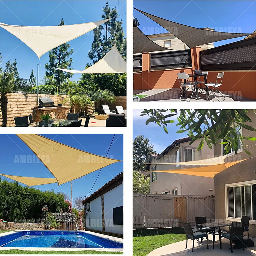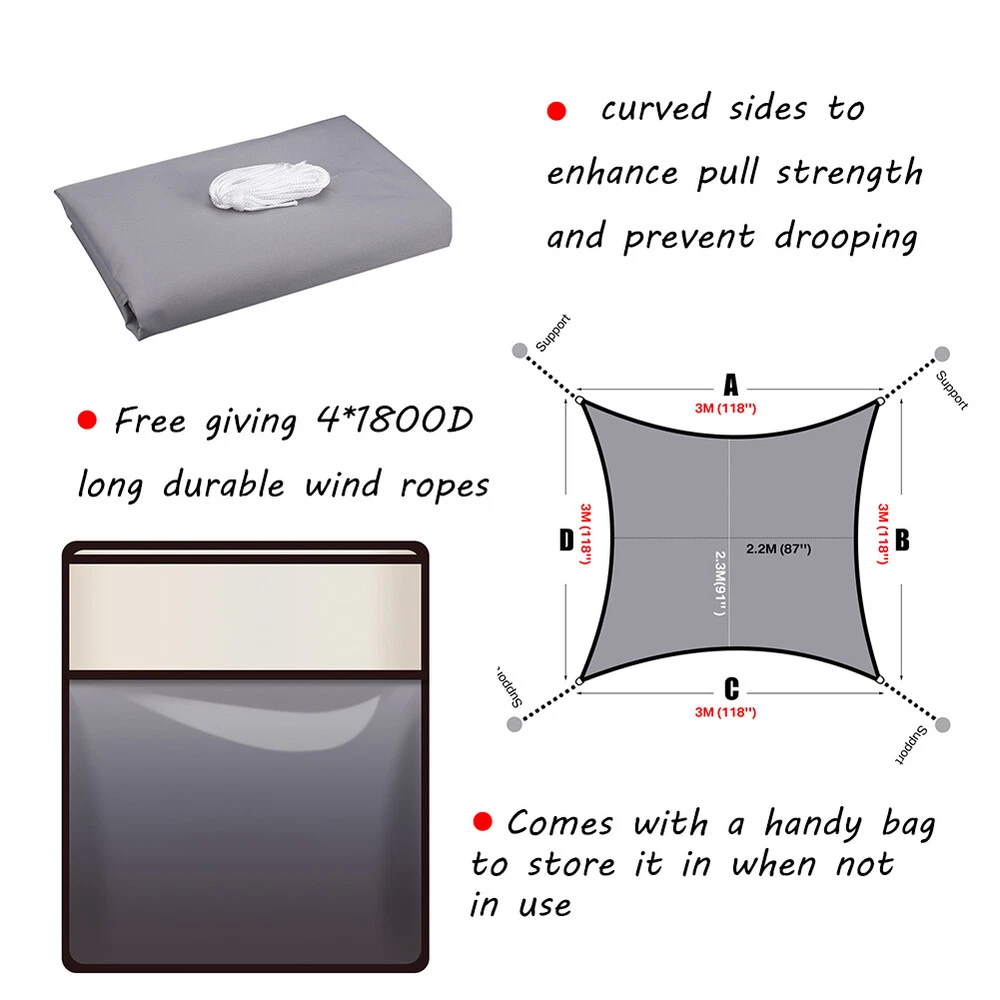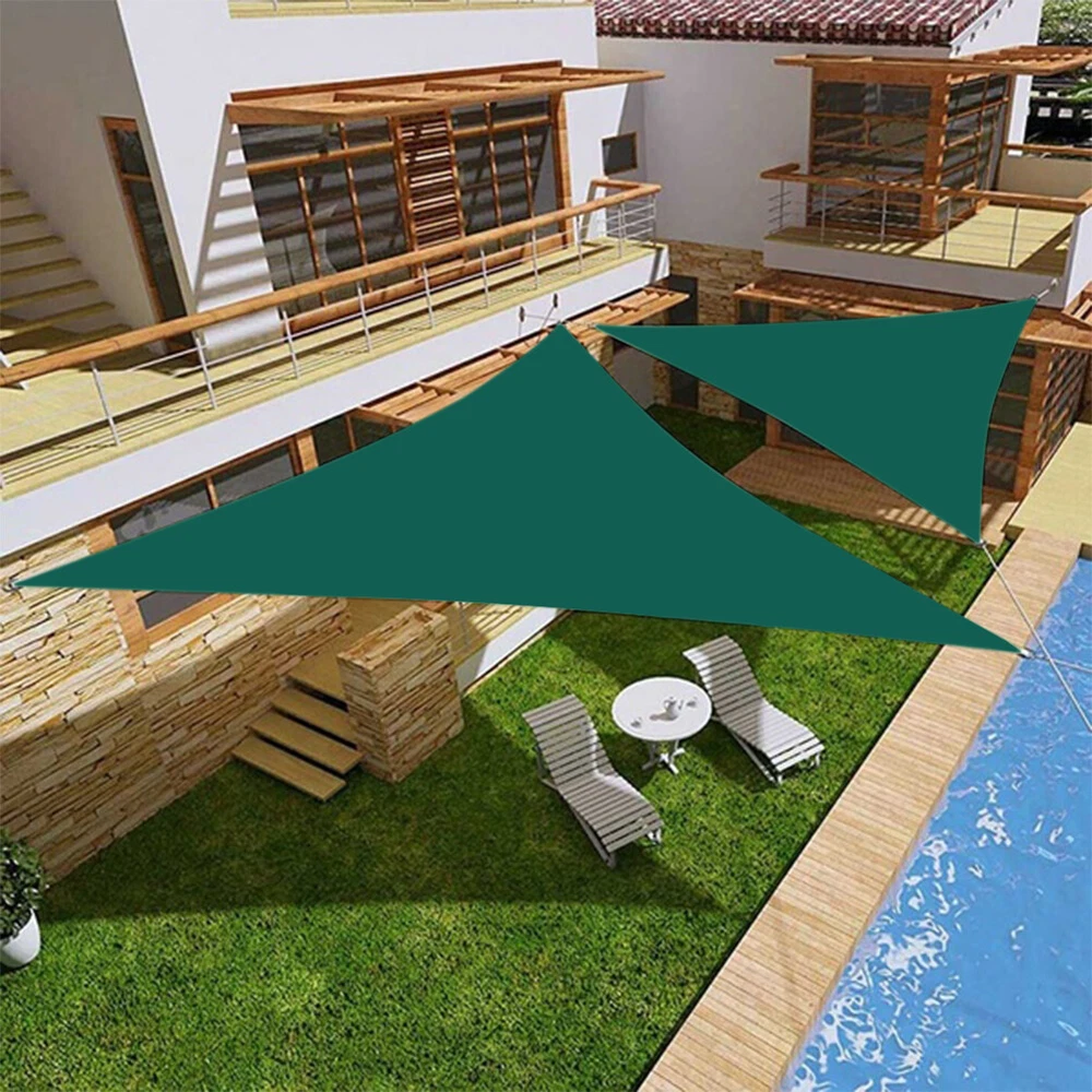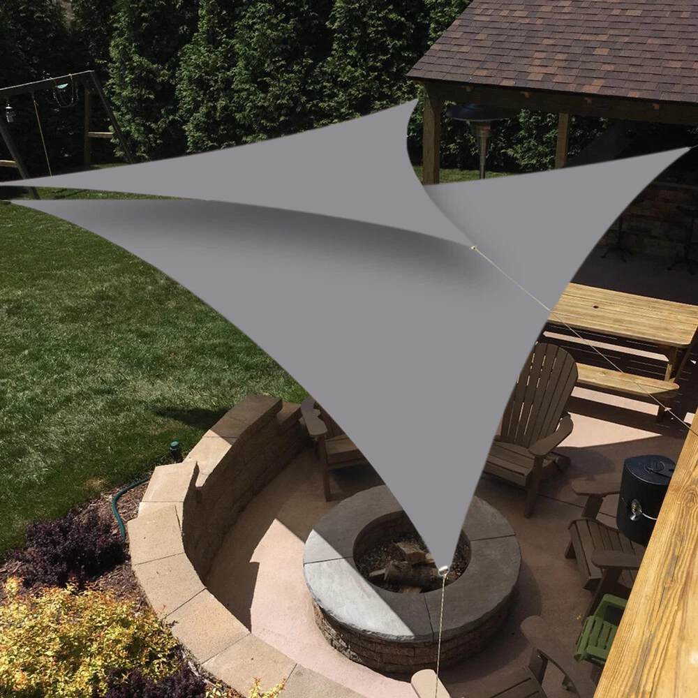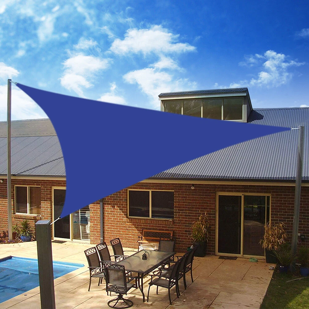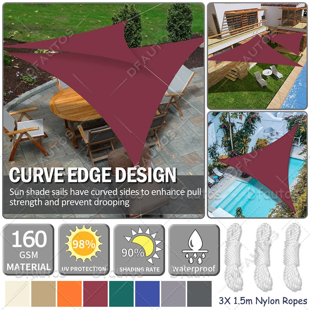 Descriptions: The Waterproof Sun Shade Sails Perfect for gardens, patios, swimming pools, BBQ areas and etc. Give you a cool and comfortable experience in the hot summer. It can also create a good mood for you in Rainy days. 【WATER RESISTANT】Sun shade sail is 300D high density polyester fabric with PU coating(160 g/m²), can withstand 2000MM water pressure. It's tear resistant, waterproof and weatherproof. But we don't suggest to use shade sail in heavy rain, continuous heavy rain may cause slight water seepage. 【MULTIFUNCTIONAL & DURABLE】Double stitched edges and reinforced corners, making both sides more robust. Our solar sail is suitable to be used in garden, backyard, patio, courtyard, carport, pergolas, swimming pool, balcony, terrace, camping trip, lawn or another outdoor area. Protecting your privacy safe. 【EASY TO INSTALL】Durable anti-rust D-ring is placed at the edge of the four corners, you can use ropes or fixing kits easily to fix it. We recommend that you adjust the angle of the garden shade sail to 20-40 degrees, it needs a certain angle to drain the rain to avoid damage the product due to excessive water. 【UV PROTECTION】Our outdoor awning can block 95% harmful UV. It can provides excellent shade on sunny days/rain days, give you a wonderful space to enjoy your time. 【PAKAGE CONTAIN】You will get Awning Canopy x1, Ropes x4/3 . Specification: Type: Waterproof shade sails Material: 300D Oxford cloth Material of D-Rings: Stainless Steel Color: Grey, Cream, Beige, Orange, Blue, Anthracite, Sand, Green, Terracotta Shape: Rectangle/Triangle/Square Ropes Length : 1.5m / 4.92 ft Features: Stainless Steel D Rings, Waterproof Waterproof Materials 160 gsm high density polyester with PU coating, water and tear resistant. The material is waterproof and can be protected from water even on rainy days. The material is more sturdy, thick fabric and braided rope, good windproof effect. High Quality Materials 95% UV protection Strong and high-quality materials, can be used in sunny and rainy days, not recommended for use in bad weather UV Protect This sun shade sail has a sunscreen coating that effectively prevents UV rays, blocks the sun, and prevents tanning.95% anti-UV effect, effectively blocking UV rays. Multiple Sizes in Varied Shapes: ## Triangle Sun Shade Sails Size ## 2 x 2 x 2M / 6.56 x 6.56 x 6.56 FT 3 x 3 x 3M / 9.84 x 9.84 x 9.84 FT 3.6 x 3.6 x 3.6M / 11.81 x 11.81 x 11.81 FT 5 x 5 x 5M / 16.40 x 16.40 x 16.40 FT ## Rectangle Sun Shade Sails Size ## 2 x 3 M / 6.56 x 9.84 FT 2 x 4 M / 6.56 x 13.12 FT 3 x 4 M / 9.84 x 13.12 FT 3 x 5 M / 9.84 x 16.40 FT 4 x 5 M / 13.12 x 16.40 FT 4 x 6 M / 13.12 x 19.68 FT ## Square Sun Shade Sails Size ## 2 x 2 M / 6.56 x 6.56 FT 3 x 3 M / 9.84 x 9.84 FT 3.6 x 3.6 M / 11.81 x 11.81 FT Package include 1x Waterproof shade sail with 3/4 Ropes The edge of the shade sail is curved, and the actual use area is about 10% less than the measured area. Please purchase with cautious,thank you. 【How-To Install a Shade Sail 】 The shade sail came with D ring & Wind ropes for you to be able to make the connections to the house/trees/other structure pretty easily. If you want to strengthen the fixing, you can buy a set of hardware from our store. How-Totighten the rope after installation/Buyer's Experience Sharing From the opposite corners, I assembled the proper length of wire rope with the thimble and clamp for the end, and attached to eye bolts in the trees with a turnbuckle to tighten the span. Once I had these four anchor points established and installed, the shade sail was in the proper position and I could tighten all four anchor points to get the desired tension.