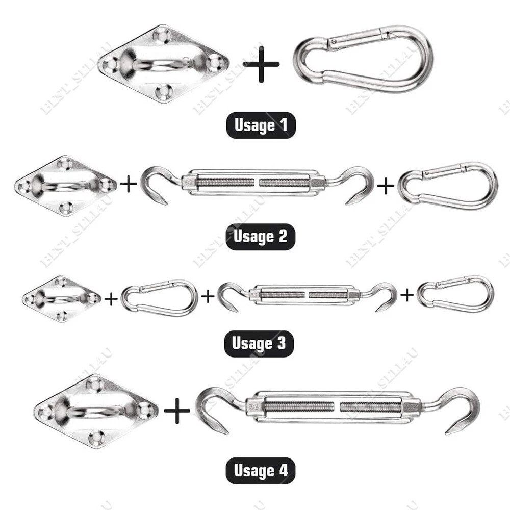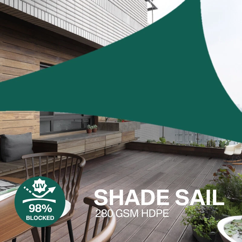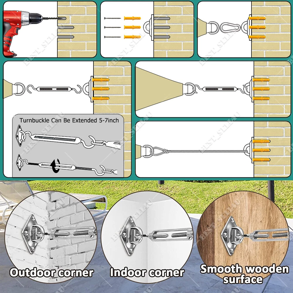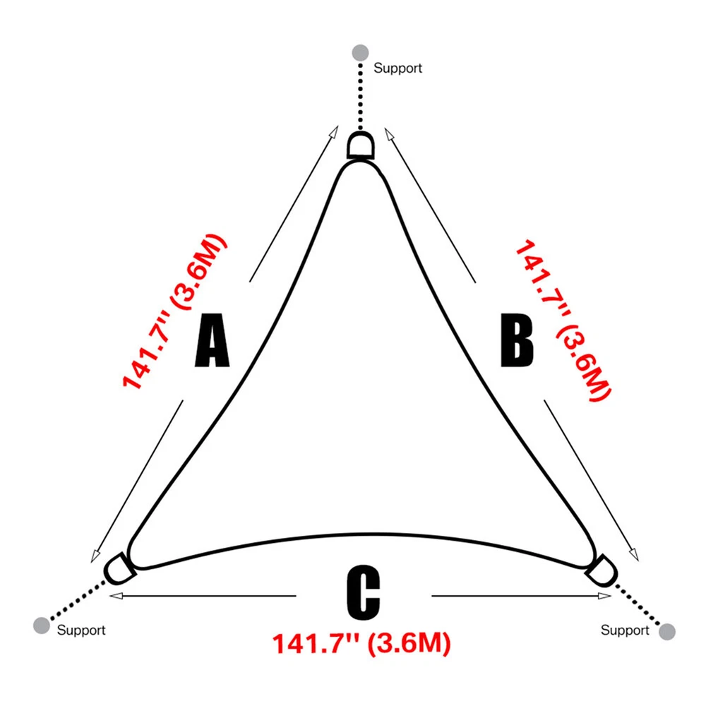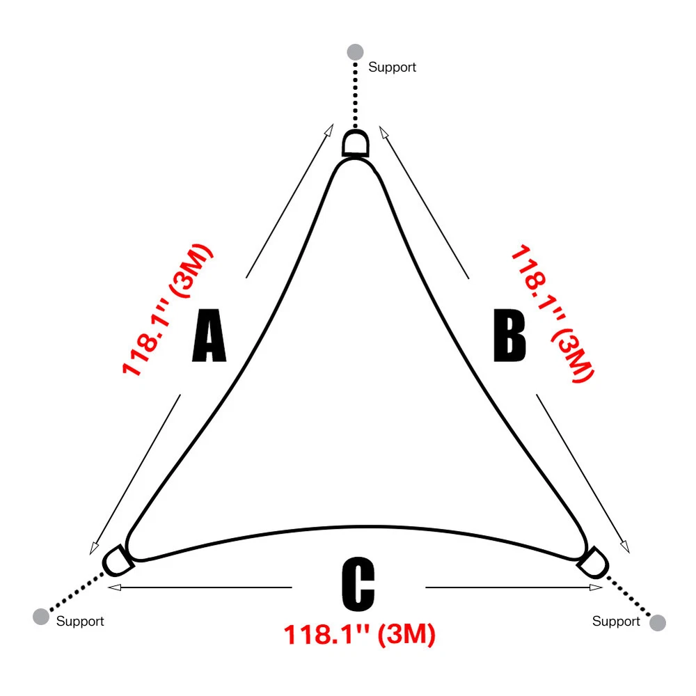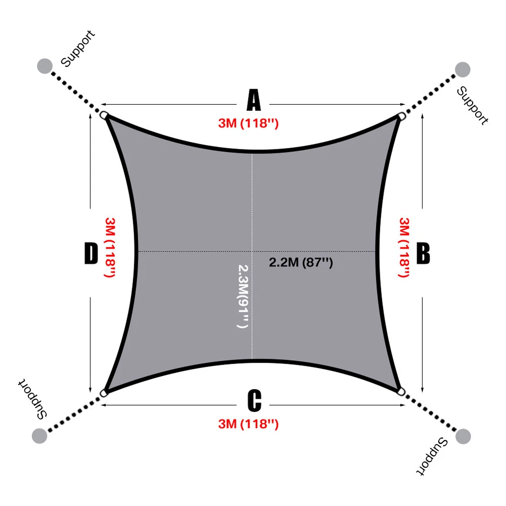 Descriptions: The Waterproof Sun Shade Sails Perfect for gardens, patios, swimming pools, BBQ areas and etc. Give you a cool and comfortable experience in the hot summer. It can also create a good mood for you in Rainy days. 【WATER RESISTANT】Sun shade sail is 300D high density polyester fabric with PU coating(160 g/m²), can withstand 2000MM water pressure. It's tear resistant, waterproof and weatherproof. But we don't suggest to use shade sail in heavy rain, continuous heavy rain may cause slight water seepage. 【MULTIFUNCTIONAL & DURABLE】Double stitched edges and reinforced corners, making both sides more robust. Our solar sail is suitable to be used in garden, backyard, patio, courtyard, carport, pergolas, swimming pool, balcony, terrace, camping trip, lawn or another outdoor area. Protecting your privacy safe. 【EASY TO INSTALL】Durable anti-rust D-ring is placed at the edge of the four corners, you can use ropes or fixing kits easily to fix it. We recommend that you adjust the angle of the garden shade sail to 20-40 degrees, it needs a certain angle to drain the rain to avoid damage the product due to excessive water. 【UV PROTECTION】Our outdoor awning can block 95% harmful UV. It can provides excellent shade on sunny days/rain days, give you a wonderful space to enjoy your time. 【PAKAGE CONTAIN】You will get Awning Canopy x1, Ropes x4/3 . Specification: Type: Waterproof shade sails Material: 300D Oxford cloth Material of D-Rings: Stainless Steel Color: Grey, Cream, Beige, Orange, Blue, Anthracite, Sand, Green, Terracotta Shape: Rectangle/Triangle/Square Ropes Length : 1.5m / 4.92 ft Features: Stainless Steel D Rings, Waterproof Waterproof Materials 160 gsm high density polyester with PU coating, water and tear resistant. The material is waterproof and can be protected from water even on rainy days. The material is more sturdy, thick fabric and braided rope, good windproof effect. High Quality Materials 95% UV protection Strong and high-quality materials, can be used in sunny and rainy days, not recommended for use in bad weather UV Protect This sun shade sail has a sunscreen coating that effectively prevents UV rays, blocks the sun, and prevents tanning.95% anti-UV effect, effectively blocking UV rays. Multiple Sizes in Varied Shapes: ## Triangle Sun Shade Sails Size ## 2 x 2 x 2M / 6.56 x 6.56 x 6.56 FT 3 x 3 x 3M / 9.84 x 9.84 x 9.84 FT 3.6 x 3.6 x 3.6M / 11.81 x 11.81 x 11.81 FT 5 x 5 x 5M / 16.40 x 16.40 x 16.40 FT ## Rectangle Sun Shade Sails Size ## 2 x 3 M / 6.56 x 9.84 FT 2 x 4 M / 6.56 x 13.12 FT 3 x 4 M / 9.84 x 13.12 FT 3 x 5 M / 9.84 x 16.40 FT 4 x 5 M / 13.12 x 16.40 FT 4 x 6 M / 13.12 x 19.68 FT ## Square Sun Shade Sails Size ## 2 x 2 M / 6.56 x 6.56 FT 3 x 3 M / 9.84 x 9.84 FT 3.6 x 3.6 M / 11.81 x 11.81 FT Package include 1x Waterproof shade sail with 3/4 Ropes The edge of the shade sail is curved, and the actual use area is about 10% less than the measured area. Please purchase with cautious,thank you. 【How-To Install a Shade Sail 】 The shade sail came with D ring & Wind ropes for you to be able to make the connections to the house/trees/other structure pretty easily. If you want to strengthen the fixing, you can buy a set of hardware from our store. How-Totighten the rope after installation/Buyer's Experience Sharing From the opposite corners, I assembled the proper length of wire rope with the thimble and clamp for the end, and attached to eye bolts in the trees with a turnbuckle to tighten the span. Once I had these four anchor points established and installed, the shade sail was in the proper position and I could tighten all four anchor points to get the desired tension.