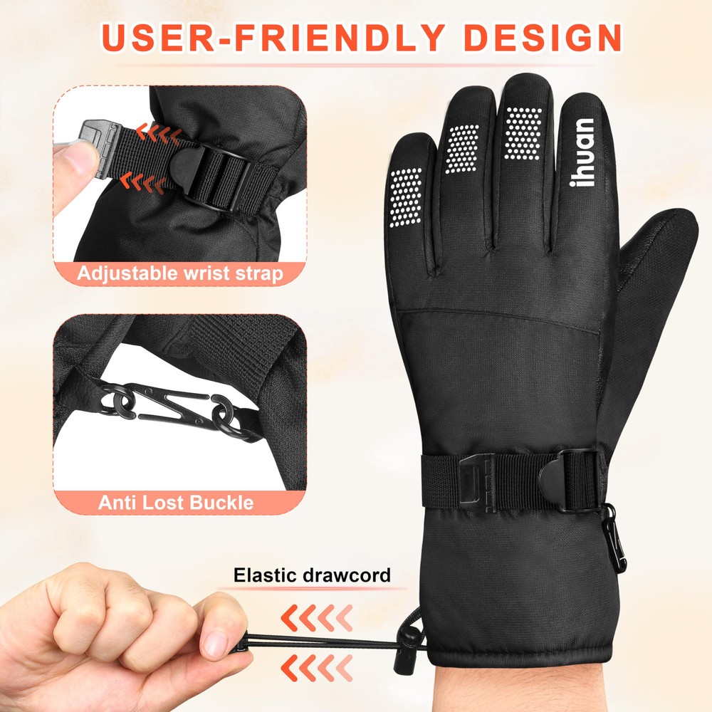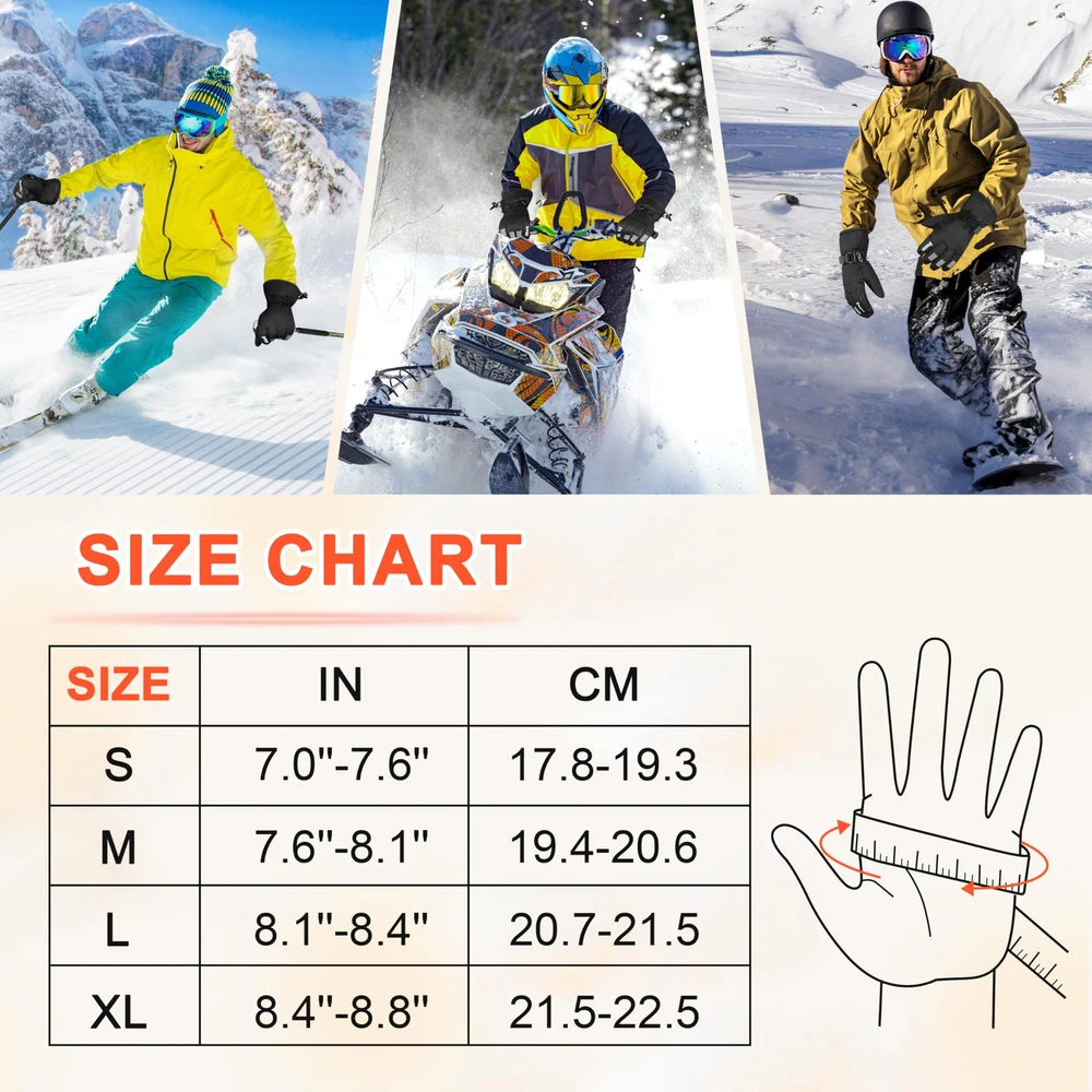 Waterproof ski gloves: These warm gloves feature a cozy fleece liner for added warmth in cold weather. They are also windproof and waterproof for optimal performance on snowy or rainy days. Take on the outdoors with confidence and stay comfortable on all your winter adventures with these reliable and versatile ski gloves. All Fingers touchscreen compatibility: Our thermal gloves offer touch screen functionality on all fingers, so you can use your phone or other touchscreen devices without taking off your tech gloves. Stay warm and connected during your outdoor adventures, whether you're texting a friend, taking photos, or using your phone, these gloves keep you in control while keeping your hands comfortable and protected. Non-slip palm for a secure grip: Enhance your snow sports experience with the non-slip PU leather palm of our gloves for exceptional traction and control. Whether you're skiing the slopes or enjoying other snow activities, this specially designed palm will help you maintain a secure and stable grip on your gear. Adjustable cuff and drawcord closure: Designed for optimal mobility and comfort, our gloves feature an adjustable wrist strap with a buckle and drawcord closure. This design effectively seals out cold air and snow while providing a secure fit for a variety of snow sports, including skiing, snowboarding, riding, and hiking. In addition, the gloves feature an anti-loss buckle to keep them securely in place during all your outdoor activities. Free return and refund policy: Not completely satisfied? No worries! We offer a free return and refund policy for any quality or size issues.