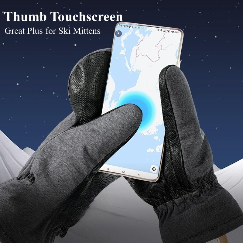 GLOVES INSIDE MITTENS : This is a pair of 2024 new design ski mittens, exactly speaking, ski gloves inside mittens, the inside lining of the mitten is glove shaped, it has slots for fingers, they way each finger is separated inside the mittens prevents sweaty hands. They definitely keep your hands warm and dry and at the same time are not bulky; WATERPROOF BREATHABLE : The ski mittens design with thermal insulation, super warm for extremly cold weather. The soft inside lining of the gloves provide more warmth, great moisture permeability and breathability, it shut out th water or sweat go out, keep hands warm and dry all day. The outer fabric made of water resistant cloth with the built in seamless waterproof bag, so the ski gloves has excellent waterproof and windproof properties; SKIDPROOF WEAR-RESISTANT : The ski mittens made with full palm PU leather, good wear resistance, long lasting for several ski seasons. Safe and non slip when holding ski poles, snow shovels, ice scraper. Thumb of the mitten touch screen compatibility is great plus for ski mittens, it will allow to response to your smart phone, smart watch and other smart device without taking off gloves in cold winter; PERFECT DETAILS : The elastic wrist leashes to be very convenient when you frequently had to take ski gloves off to help with various things. Anti-Lost Buckle save you from worrying about losing one glove. Zipper Pocket is perfect for storage hand warmers, scan pass card, keys, credit card, cashes, tickets and other cards. Really a well made ski gloves for winter. Take it and start your skiing trip now; SKI TRIP ESSENTIALS : This winter ski gloves has only one size, priority recommend for adult women and youth, we add adjustable wrist strap and elastic wrist band to ensure snug fit. Also suitable for men with small hand. The ski mittens with inside glove liners are perfect for snow trip, skiing, snowboarding, snowmobiling, snow shoveling, ice scraping, snowy hike, dog walking, cycling, driving, running, hiking, motorcycling, ice climbing, bike riding, golf, walking the pets;